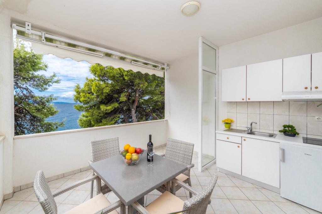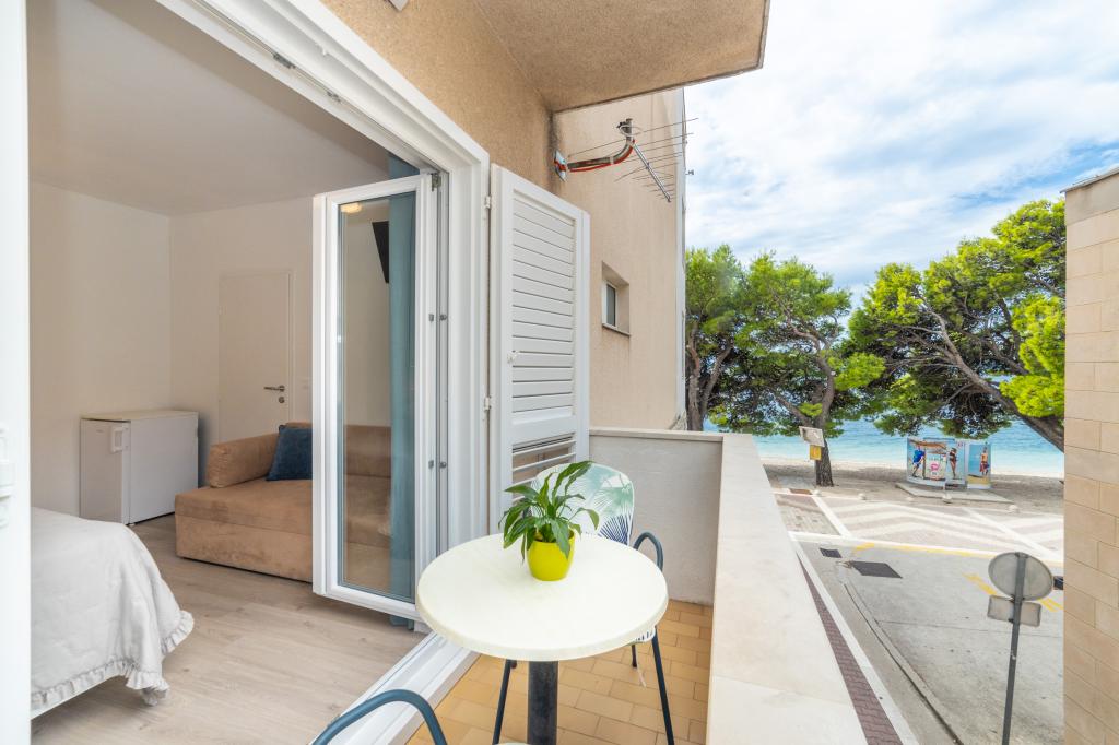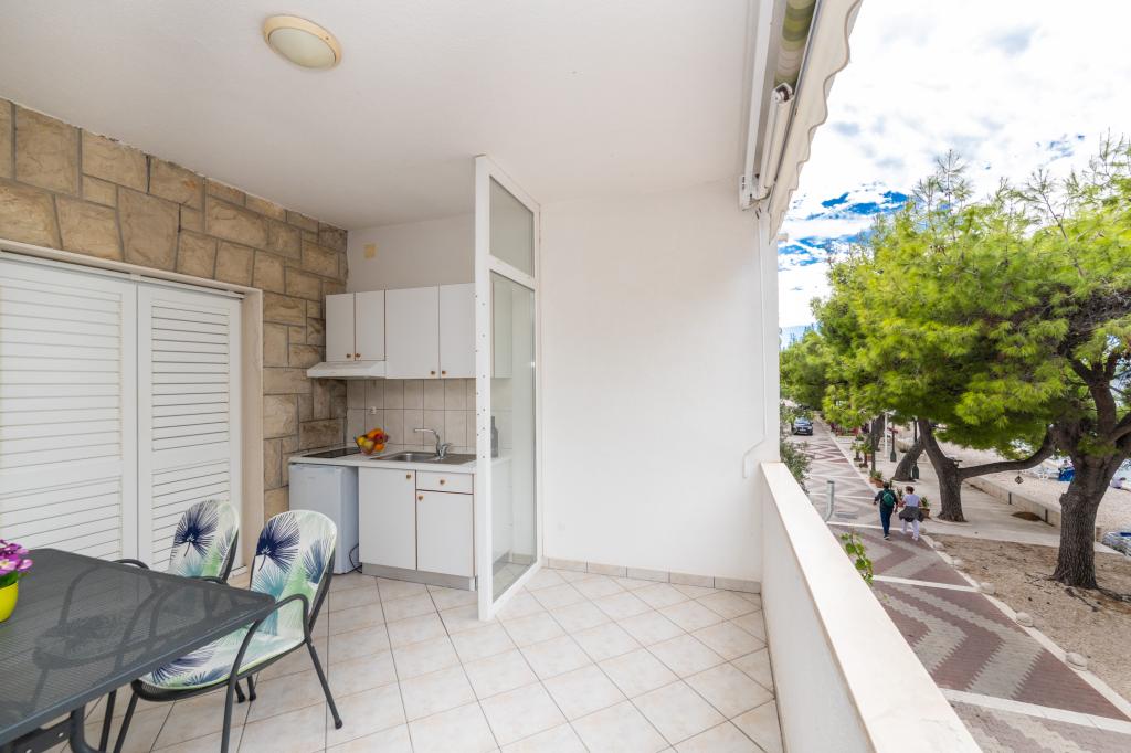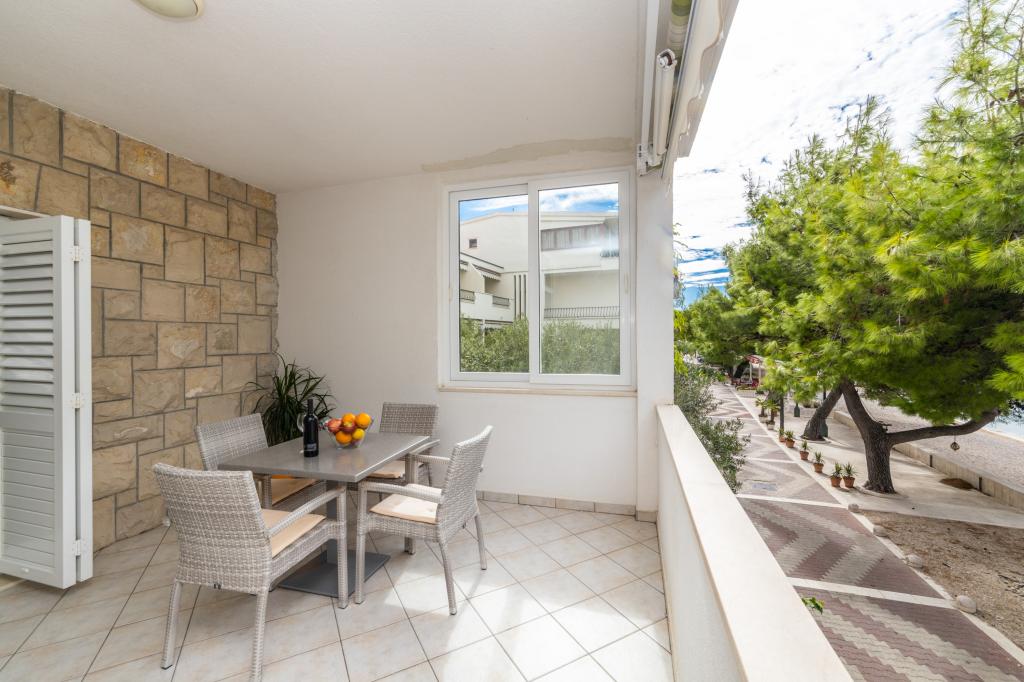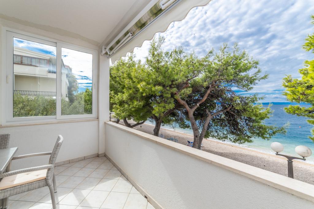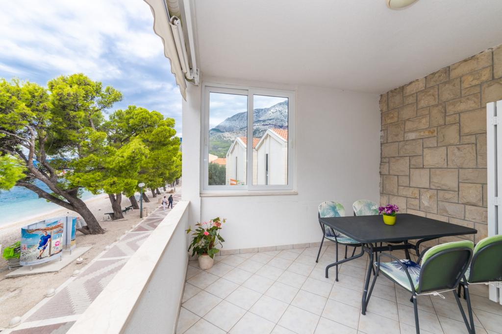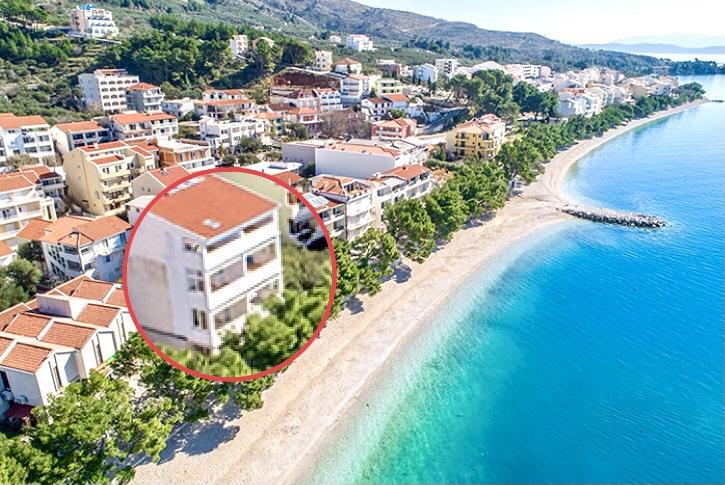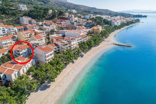 Raspolažemo apartmanima u dva objekta. Nalazimo se 100 m od centra Tučepi, marine, ljekarne i doktora. U blizini od 20-50 m su brojni restorani, pekare, slastičarne, kafići i supermarket. Parking je u dvorištu između dva objekta. Kuća 1 je prvi red uz more i raspolaže sa dva apartmana 2+1 s pogledom na more i velikim terasama te sa dvije sobe s kupatilom, hladnjakom i balkonima za dvije osobe plus pomoćni ležaj. Nalaze se na prvome katu objekta. Sve sobe i apartmani su klimatizirani. Kuća 2 se nalazi iza kuće 1 i udaljena je 20 m od mora. Tu se nalaze veliki apartmani za 4-5 osoba koji imaju zasebne ulaze, dvije odvojene spavaće sobe, novouređeno kupatilo i dnevni boravak. Sve prostorije u apartmanima su klimatizirane i imaju satelitsku televiziju i internet. Ispred njih se nalazi velika terasa s pogledom na more. Apartmani su prostrani i veličine su 50-60m2.