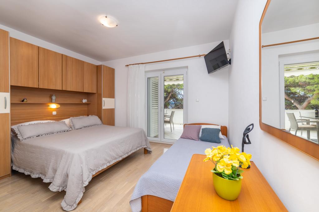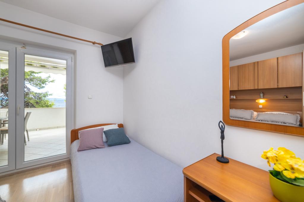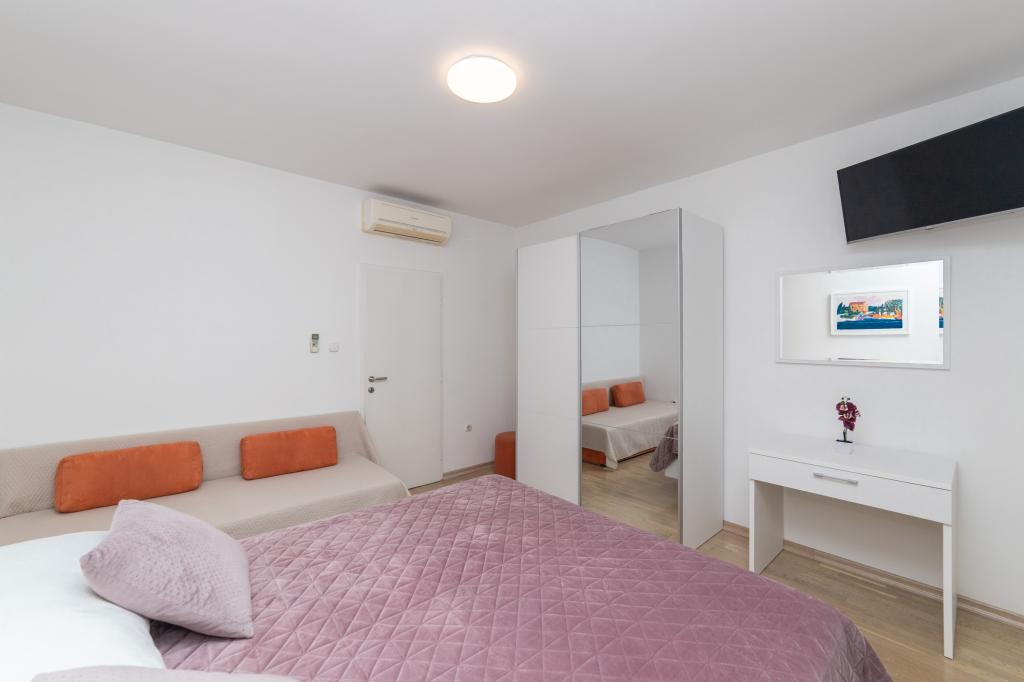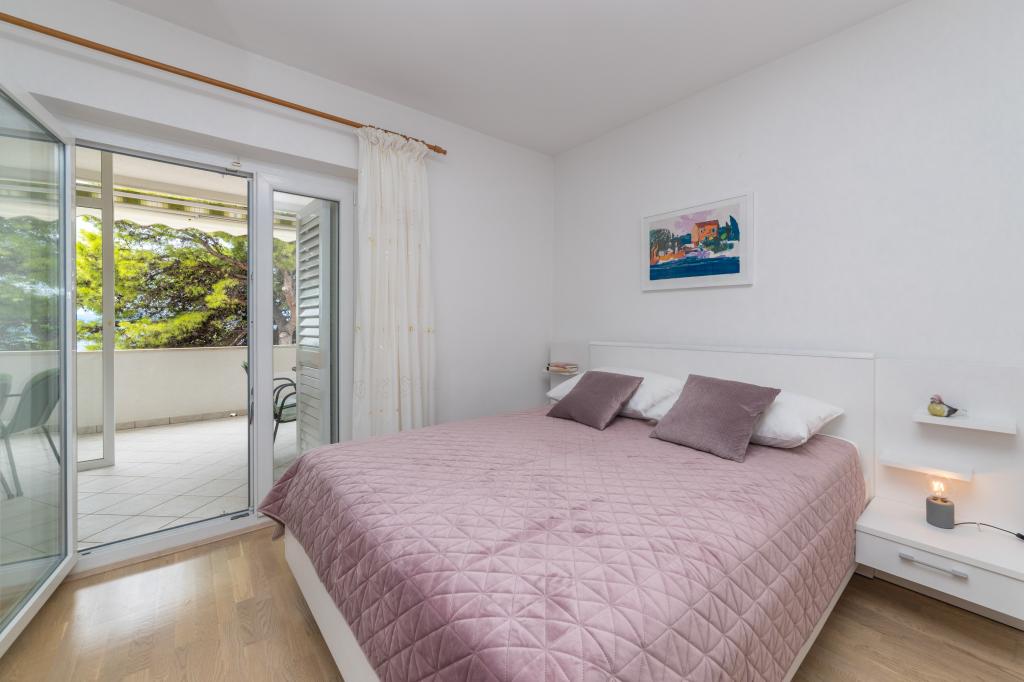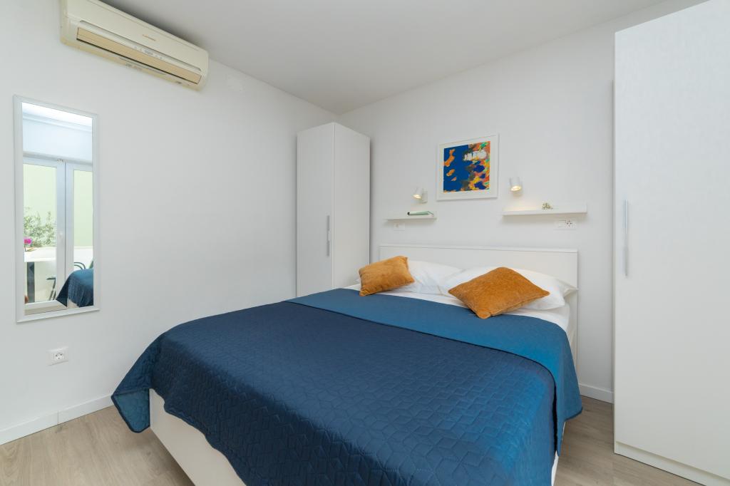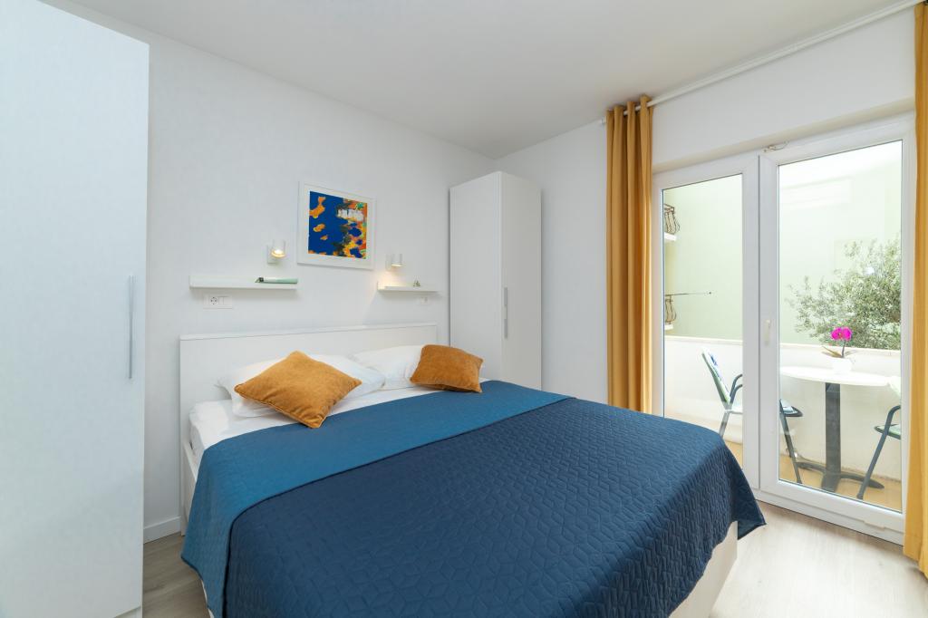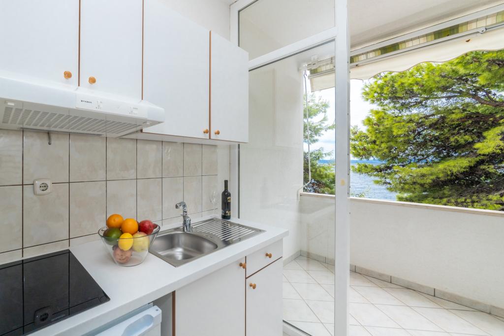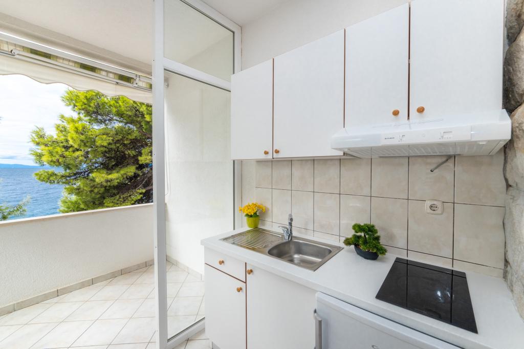 Raspolažemo apartmanima u dva objekta. Nalazimo se 100 m od centra Tučepi, marine, ljekarne i doktora. U blizini od 20-50 m su brojni restorani, pekare, slastičarne, kafići i supermarket. Parking je u dvorištu između dva objekta. Kuća 1 je prvi red uz more i raspolaže sa dva apartmana 2+1 s pogledom na more i velikim terasama te sa dvije sobe s kupatilom, hladnjakom i balkonima za dvije osobe plus pomoćni ležaj. Nalaze se na prvome katu objekta. Sve sobe i apartmani su klimatizirani. Kuća 2 se nalazi iza kuće 1 i udaljena je 20 m od mora. Tu se nalaze veliki apartmani za 4-5 osoba koji imaju zasebne ulaze, dvije odvojene spavaće sobe, novouređeno kupatilo i dnevni boravak. Sve prostorije u apartmanima su klimatizirane i imaju satelitsku televiziju i internet. Ispred njih se nalazi velika terasa s pogledom na more. Apartmani su prostrani i veličine su 50-60m2.