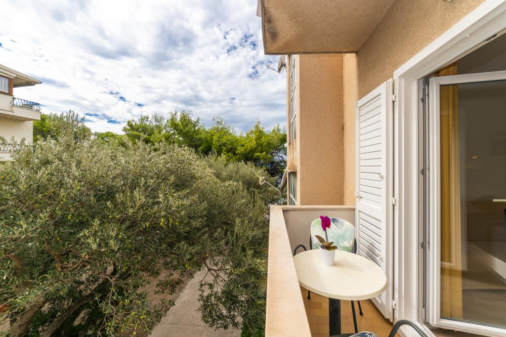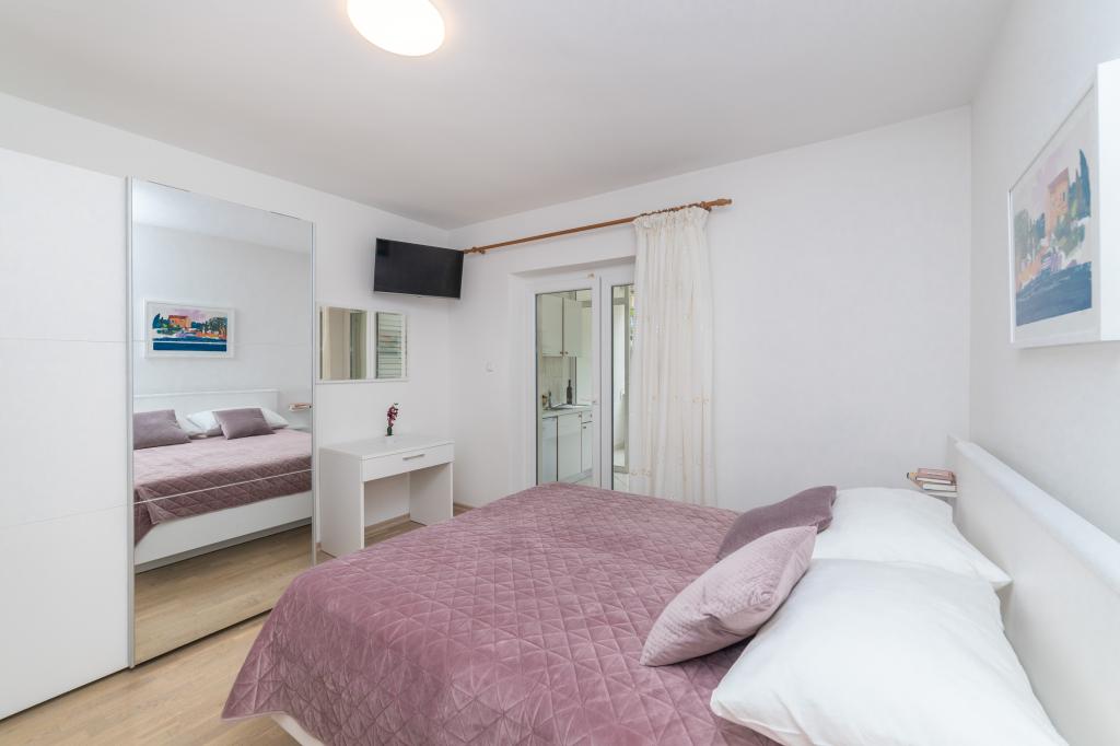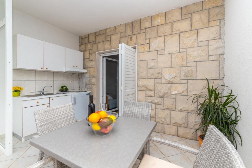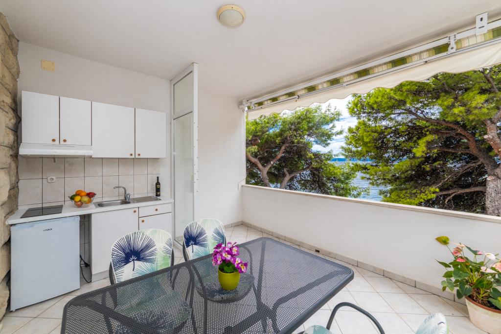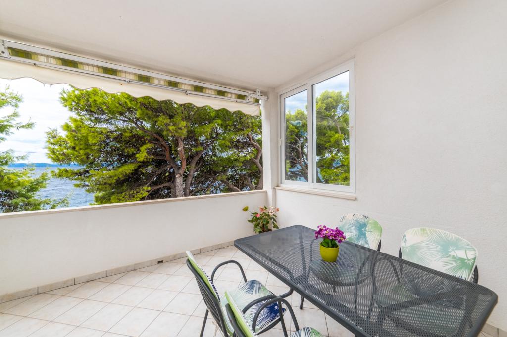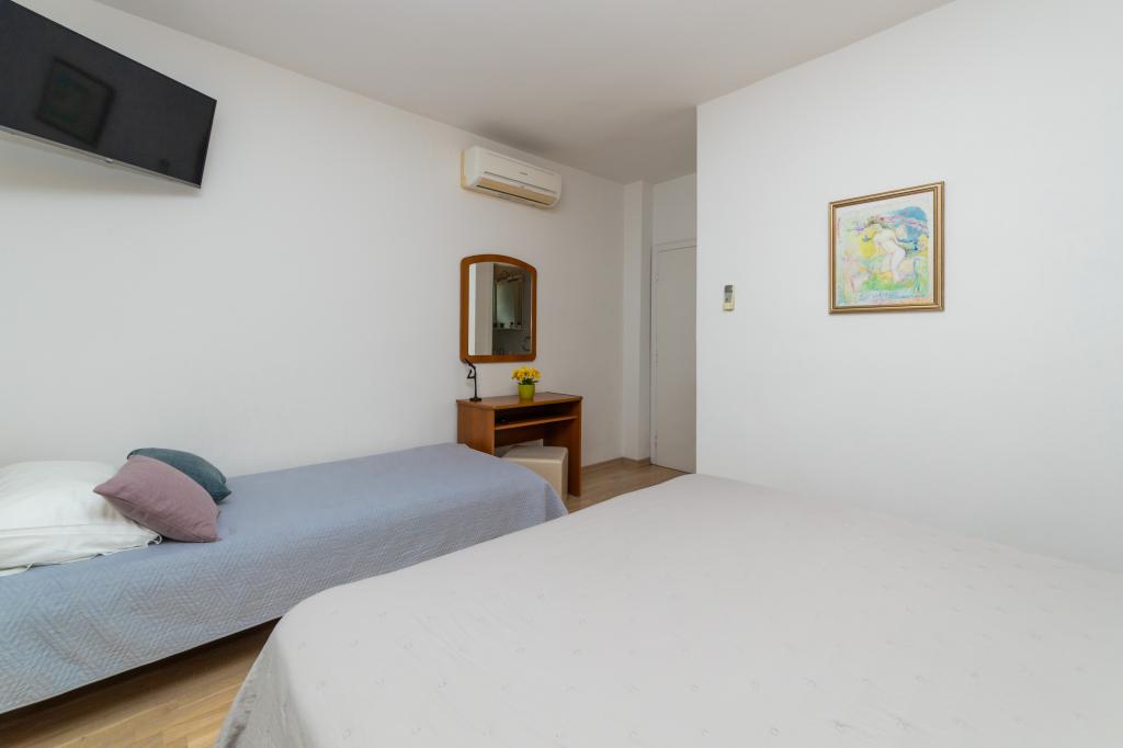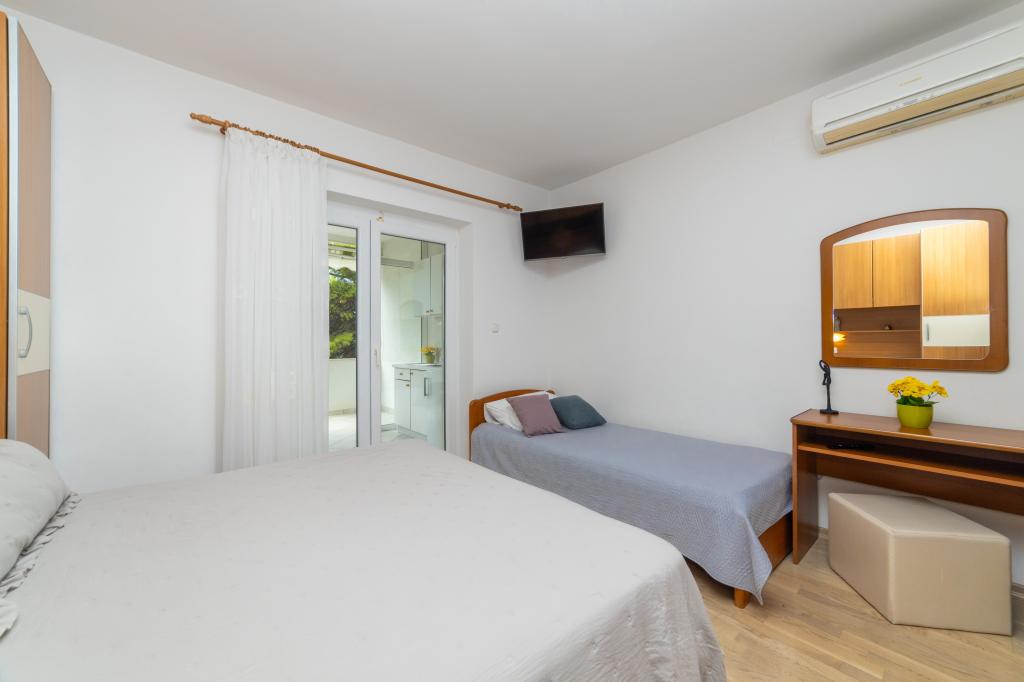 Raspolažemo apartmanima u dva objekta. Nalazimo se 100 m od centra Tučepi, marine, ljekarne i doktora. U blizini od 20-50 m su brojni restorani, pekare, slastičarne, kafići i supermarket. Parking je u dvorištu između dva objekta. Kuća 1 je prvi red uz more i raspolaže sa dva apartmana 2+1 s pogledom na more i velikim terasama te sa dvije sobe s kupatilom, hladnjakom i balkonima za dvije osobe plus pomoćni ležaj. Nalaze se na prvome katu objekta. Sve sobe i apartmani su klimatizirani. Kuća 2 se nalazi iza kuće 1 i udaljena je 20 m od mora. Tu se nalaze veliki apartmani za 4-5 osoba koji imaju zasebne ulaze, dvije odvojene spavaće sobe, novouređeno kupatilo i dnevni boravak. Sve prostorije u apartmanima su klimatizirane i imaju satelitsku televiziju i internet. Ispred njih se nalazi velika terasa s pogledom na more. Apartmani su prostrani i veličine su 50-60m2.