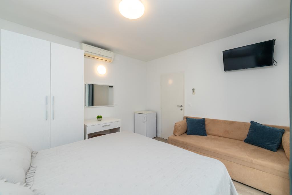 Pročitaj više Smještajne jediniceOdlazak do 9,00 i dolazak iza 13,00. Plaćanje pri dolasku ostatka iznosa umanjenog za akontaciju. Boravak do 3 noći naplaćuje se 30% više od cijene.