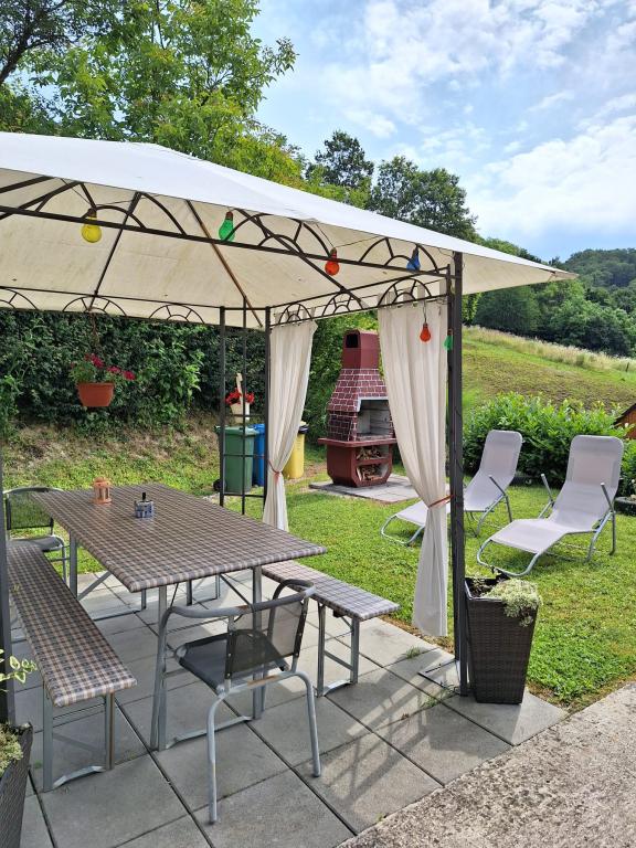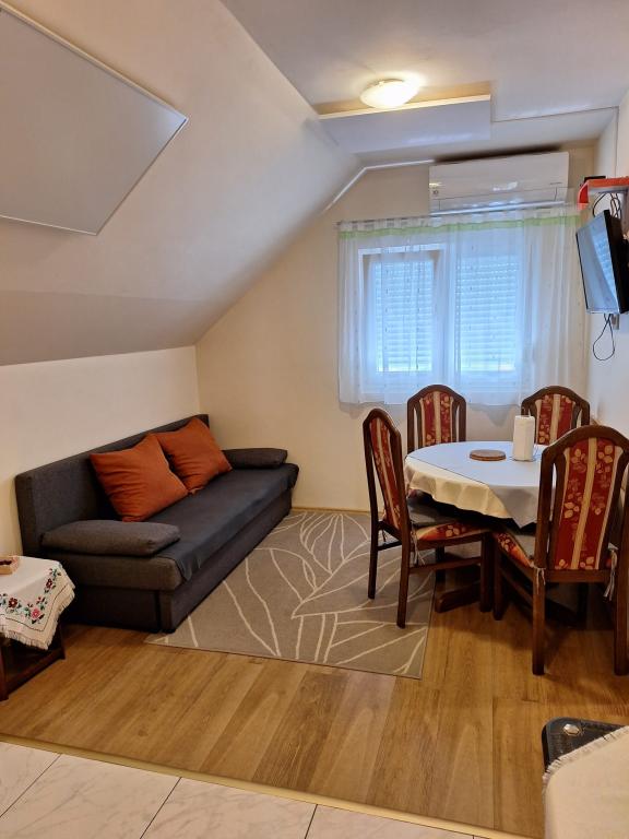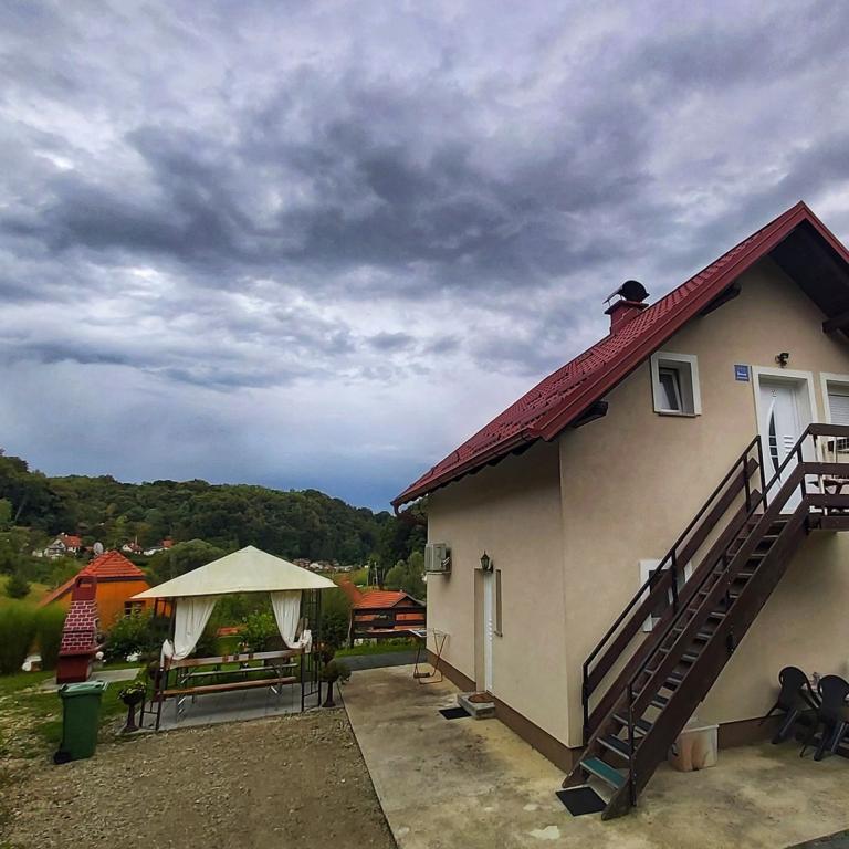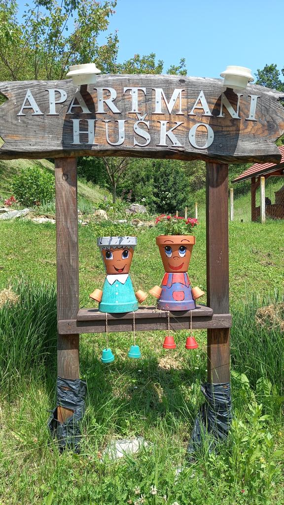 Kuća s dva suvremeno opremljena apartmana /prizemlje i potkrovlje/, smještena je u Hrvatskom Zagorju. Okružena je zelenilom, cvijećem i uređenom okućnicom. Svaki app ima svoj ulaz i terasu,a ispred kuće nalazi se natkrivena tenda s prostorom za sjedenje , ležaljkama i velikim roštiljem. Sa terasa se pruža pogled na lijepu prirodu, a u odmoru vas neće ometati buka /jer je glavna prometnica udaljena a lokalni promet je vrlo slab/, ali ćete zato uživati u cvrkutu ptica. Tuheljske toplice su poznate po izvoru termalne,ljekovite vode pa vam je cijelu godinu na raspolaganju kompleks sa vanjskim i unutarnjim bazenima, masažama, saunama, sportskim i gastro ponudama . Apatrmani su od kompleksa udaljeni 1200m , 15tak minuta šetnje . Upoznajte ljepote našeg kraja i gastro ponudu, a mi ćemo vam pružiti informacije i truditi se da vam boravak bude ugodan. Piće dobrodošlice uključeno u cijenu.Slike apartmana nožete vidjeti na fb stranici-apartmani Huško Dobro došli