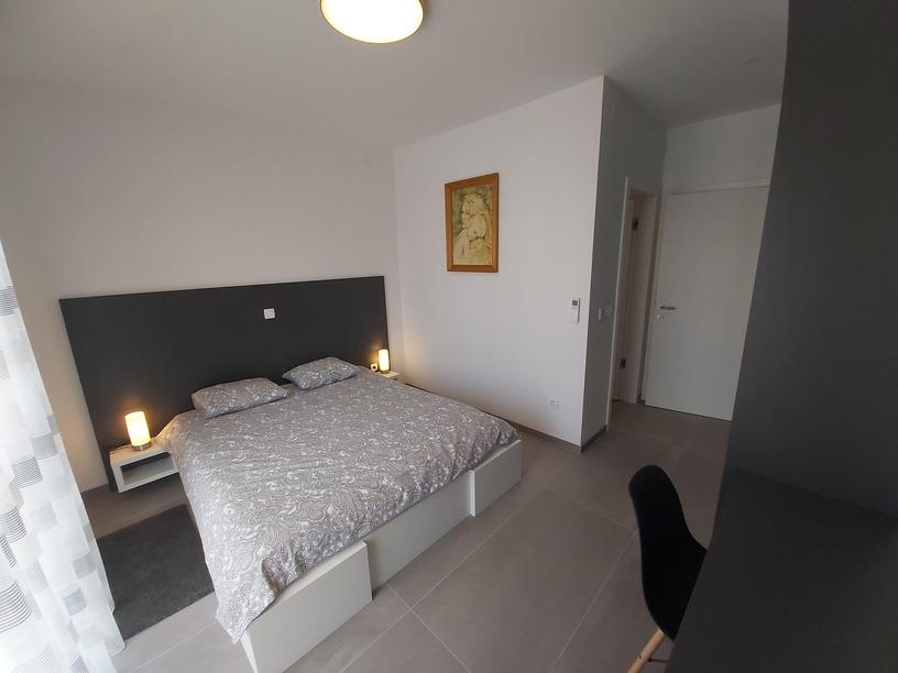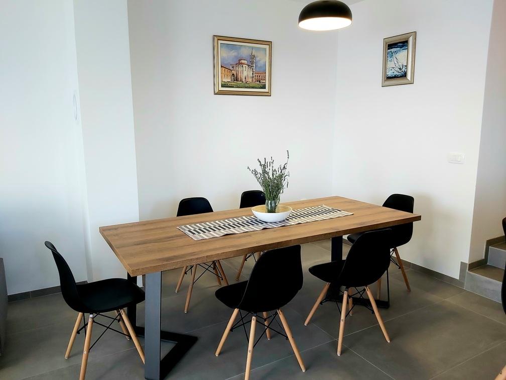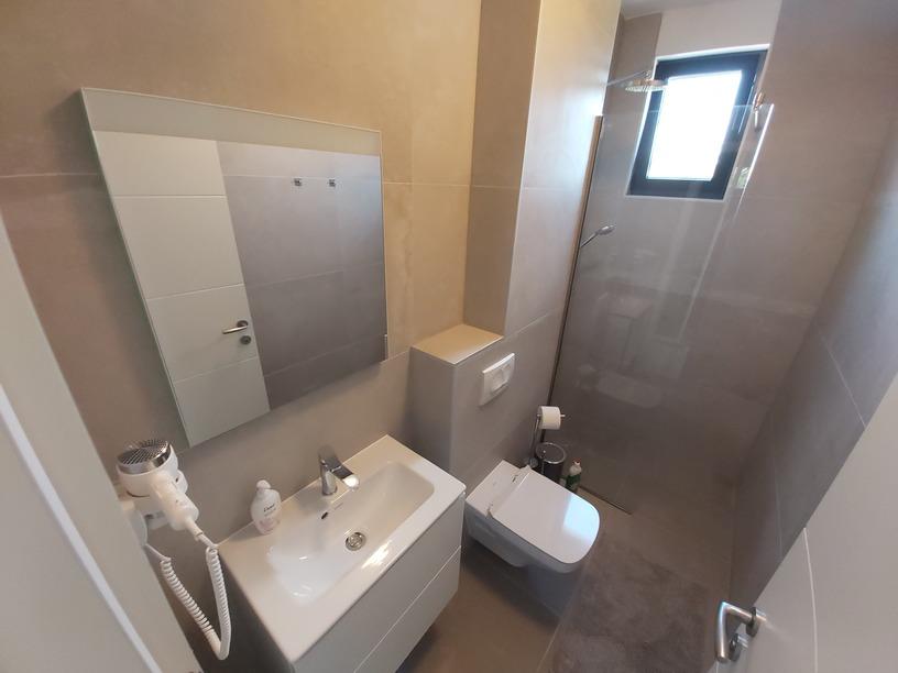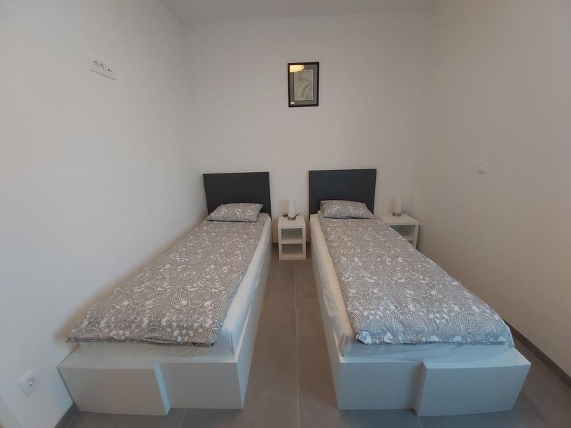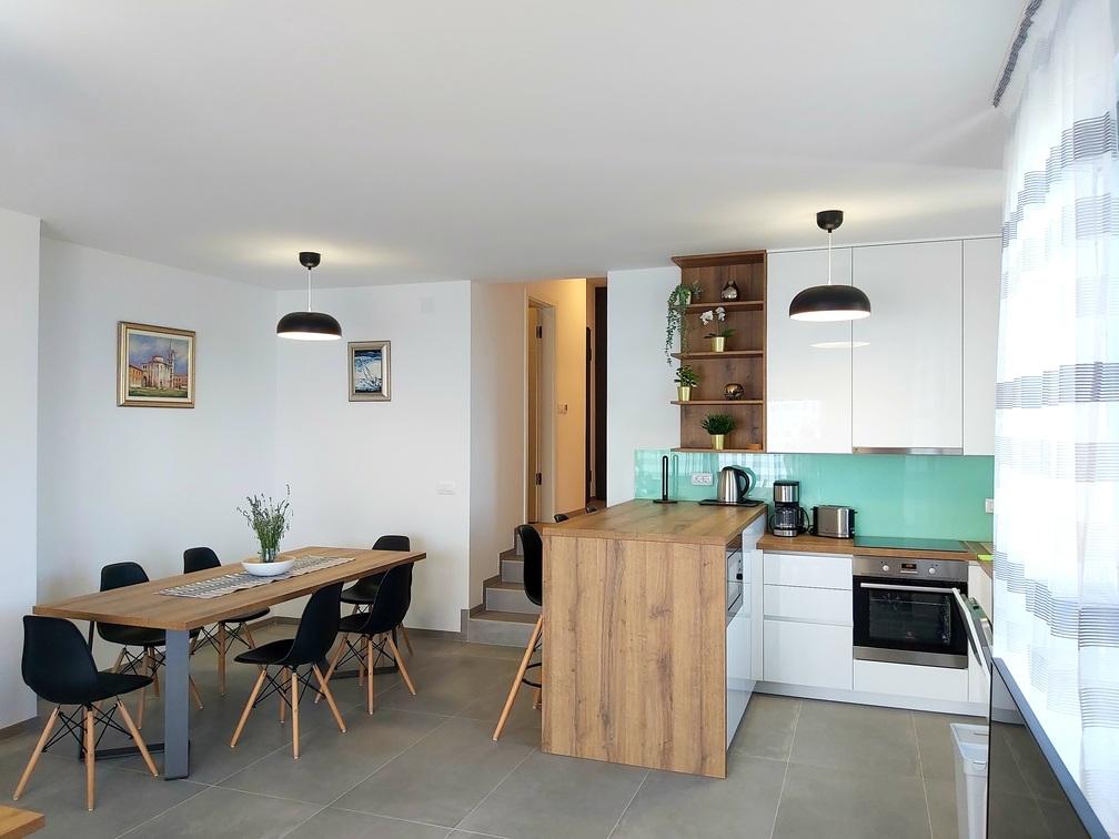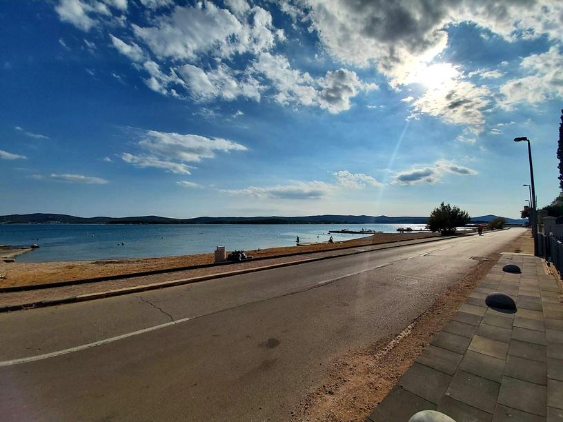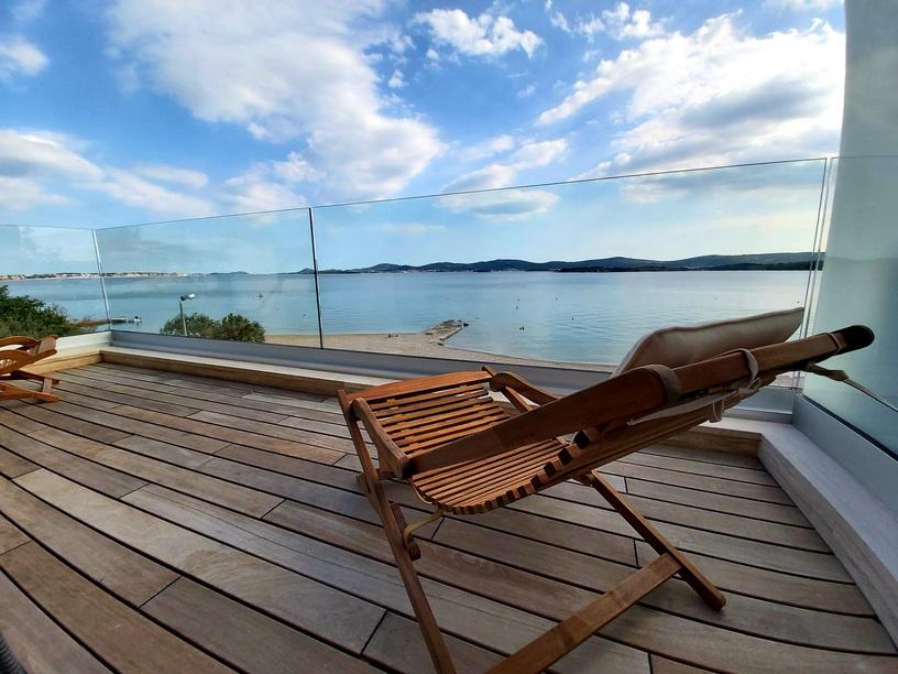 Ovaj moderni, suncem okupani stan nudi mirnu rezidencijalnu atmosferu, uz brzi i lagan pristup Turnju, Biogradu na moru i Zadru. Divite se oštrom, suvremenom uređenju životnog prostora otvorenog plana i uživajte u mirnom okruženju sa simpatične terase. Apartman je smješten na drugom katu, ukupne površine od 81,30 m2. Sastoji se od moderne kuhinje kuhinje koja je potpuno opremljena kućanskim aparatima i uređajima, blagovaonice, boravka, hodnika, dvije kupaonice sa tuš kabinama i tri sobe koje imaju bračne krevete, ugradbene ormare i sef. Sa terase površine 17,20 m2 pruža se pogled na Zadarski kanal i plažu koja se nalazi direktno ispod apartmana. Sjeverna soba ima balkon površine 5,40 m2. Uz apartman nalazi se i potpuno ograđeno parkirno mjesto natkriveno pergolom.