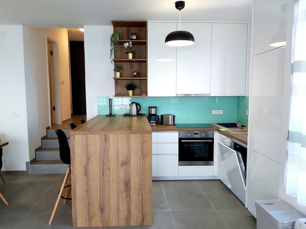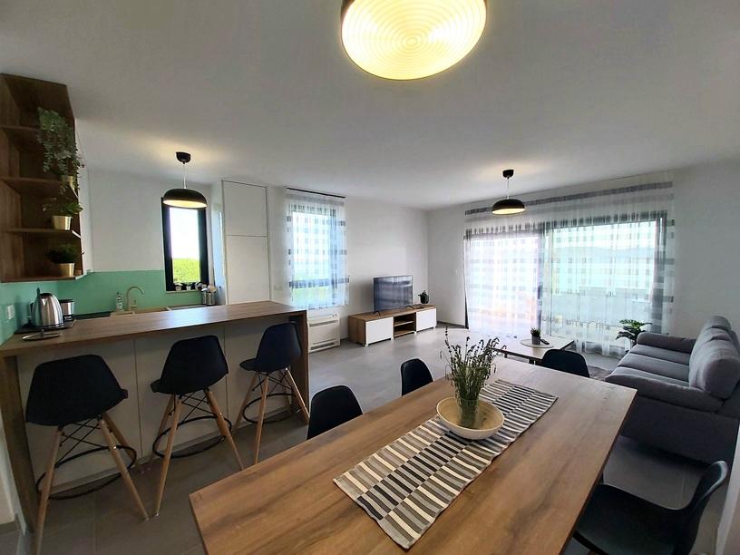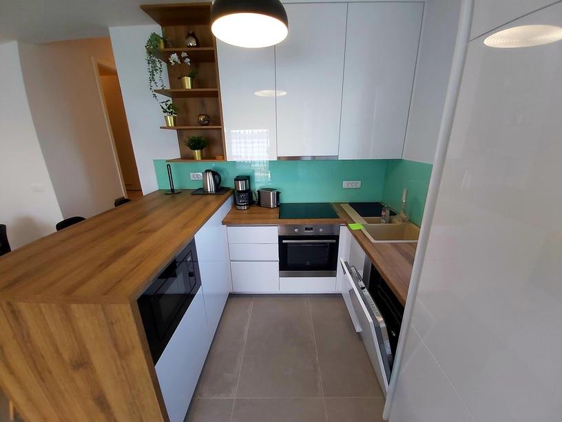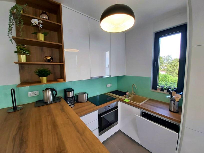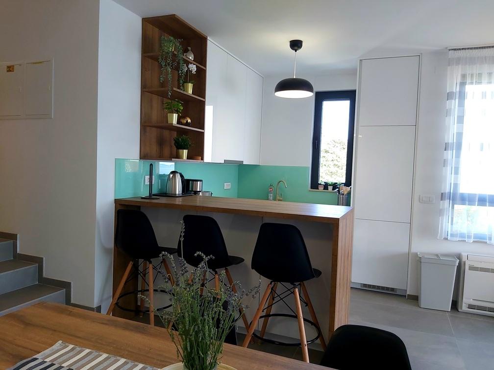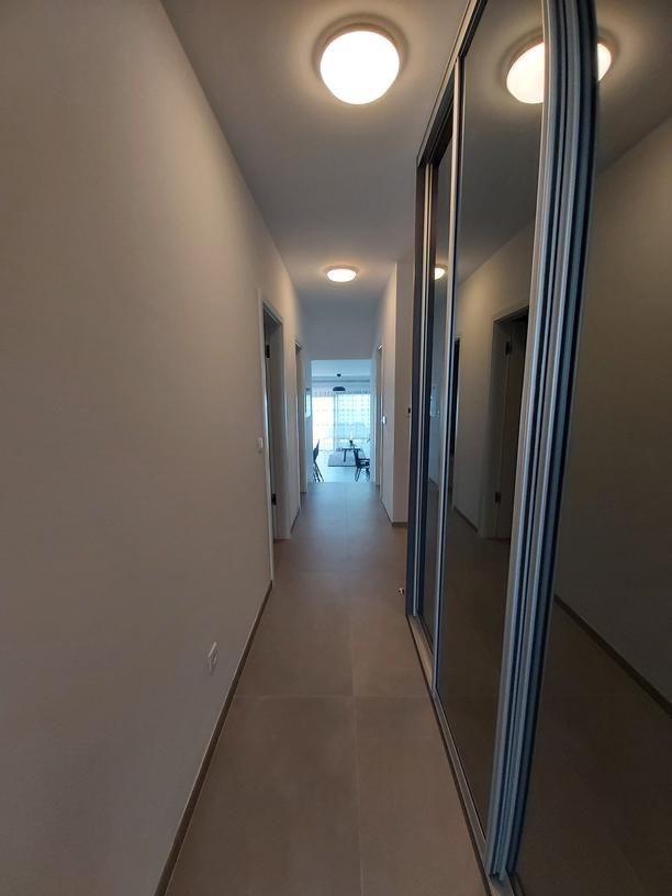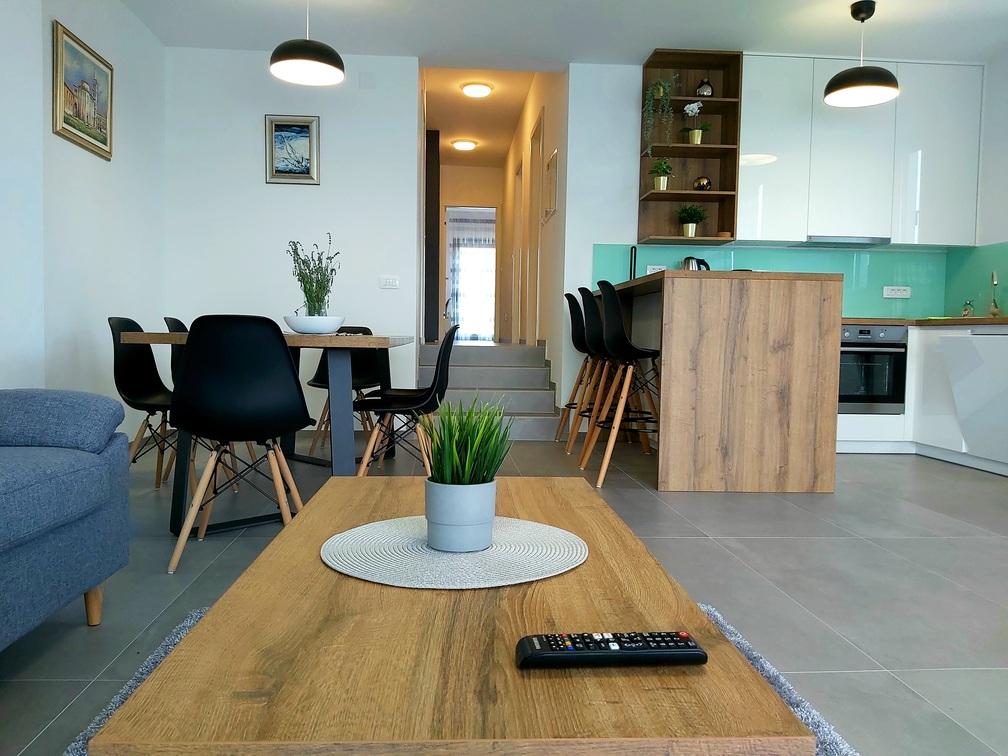 Ovaj moderni, suncem okupani stan nudi mirnu rezidencijalnu atmosferu, uz brzi i lagan pristup Turnju, Biogradu na moru i Zadru. Divite se oštrom, suvremenom uređenju životnog prostora otvorenog plana i uživajte u mirnom okruženju sa simpatične terase. Apartman je smješten na drugom katu, ukupne površine od 81,30 m2. Sastoji se od moderne kuhinje kuhinje koja je potpuno opremljena kućanskim aparatima i uređajima, blagovaonice, boravka, hodnika, dvije kupaonice sa tuš kabinama i tri sobe koje imaju bračne krevete, ugradbene ormare i sef. Sa terase površine 17,20 m2 pruža se pogled na Zadarski kanal i plažu koja se nalazi direktno ispod apartmana. Sjeverna soba ima balkon površine 5,40 m2. Uz apartman nalazi se i potpuno ograđeno parkirno mjesto natkriveno pergolom.