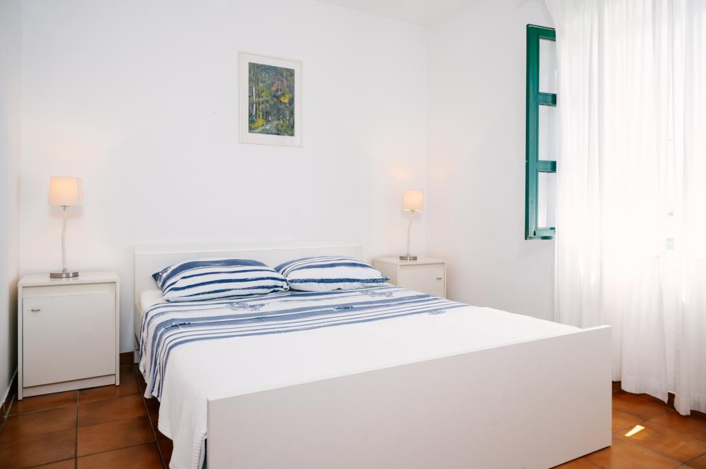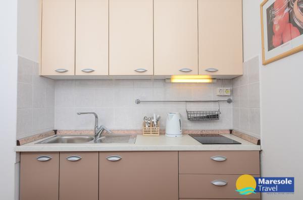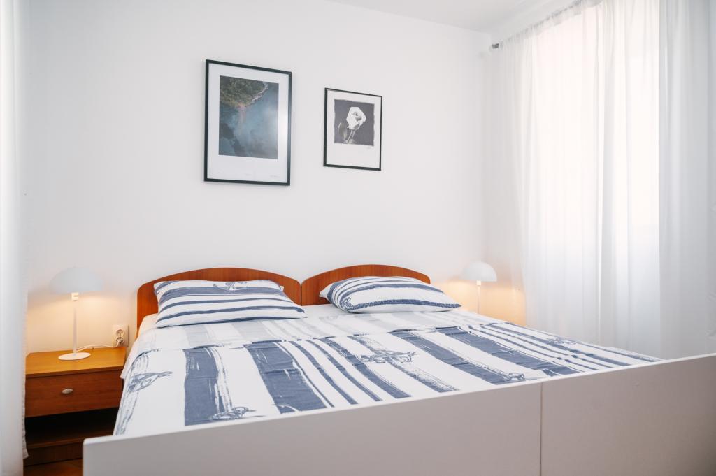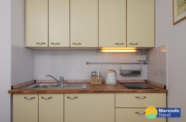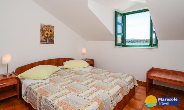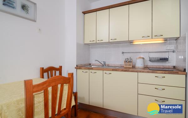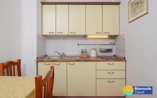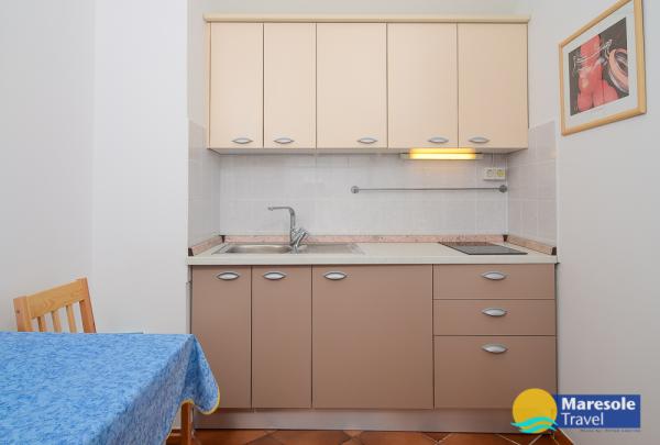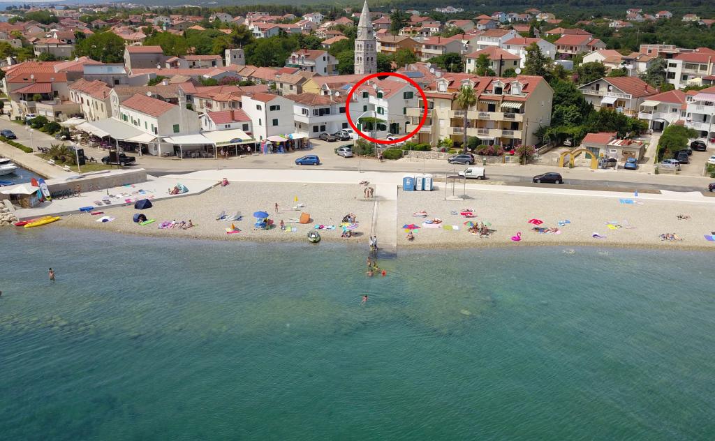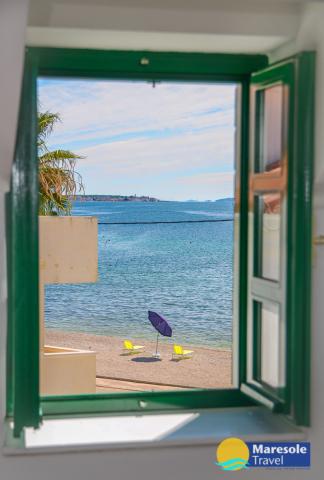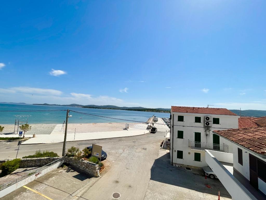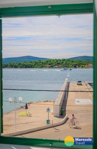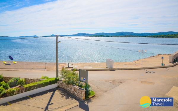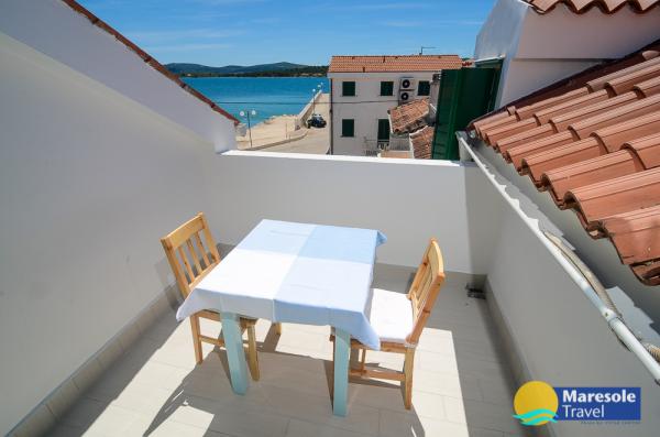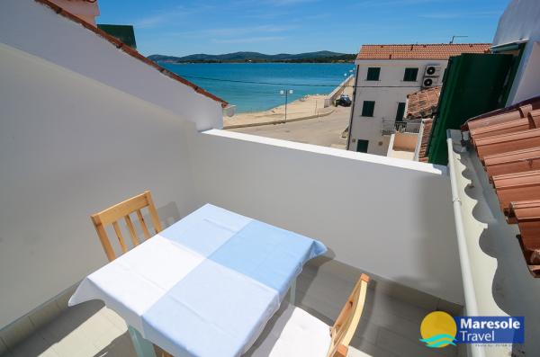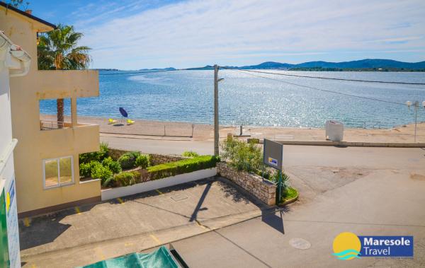 Suvremeno opremljeni apartmani nalaze se na prvome katu i drugome katu (potkrovlje) u kući u centru, na prvoj crti do plaže, s pogledom na more. Apartmani se sastoji od dnevnoga boravka s kuhinjom i kutom za blagovanje u jednome, jedan apartman s balkonom i s pogledom na more, jedne bračne sobe, kupaonice s tušem/WC. Parking na javnome prostoru ispred kuće. - Doplata za kućne ljubimce E5, 00 na dan.