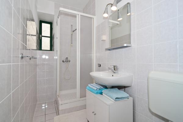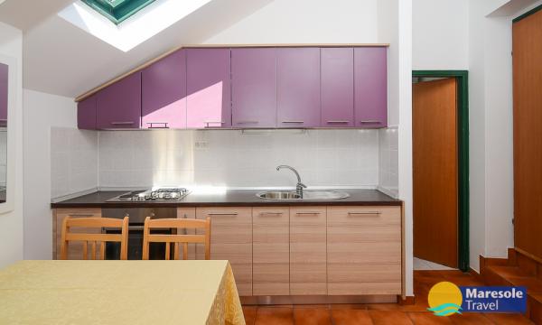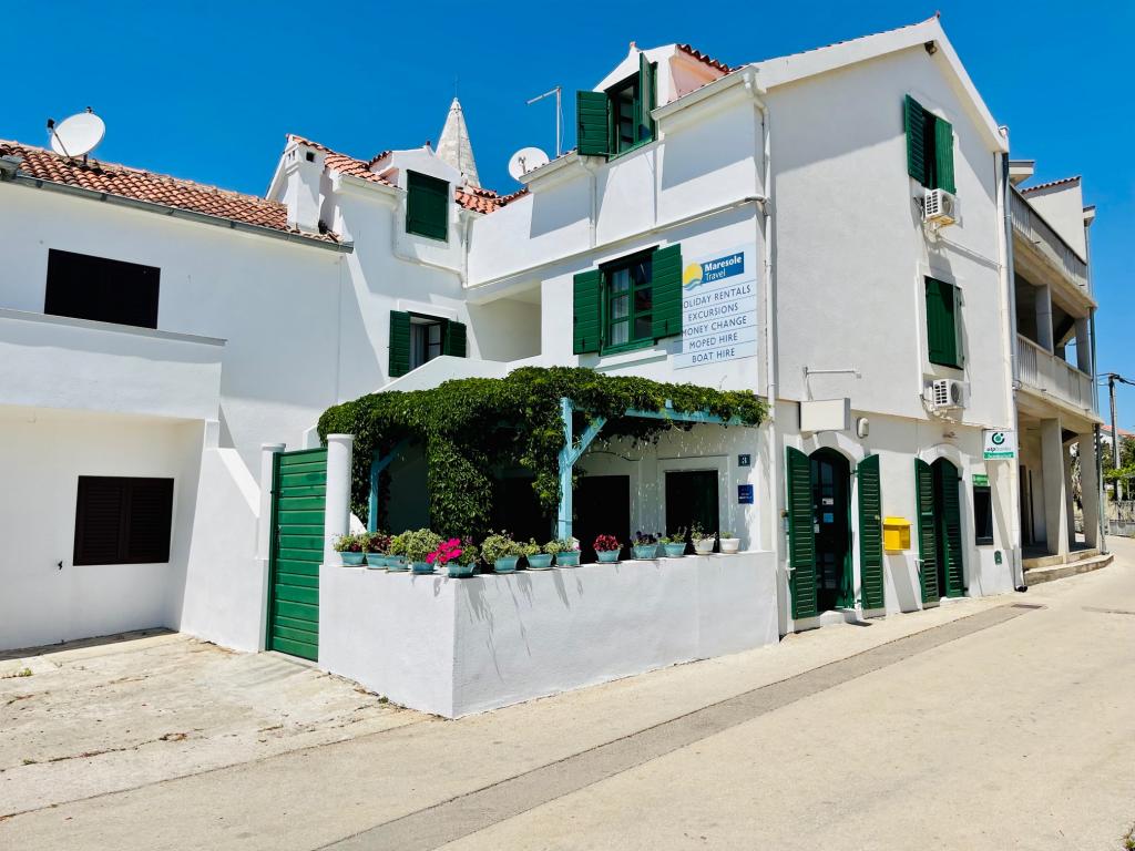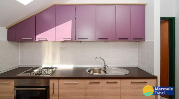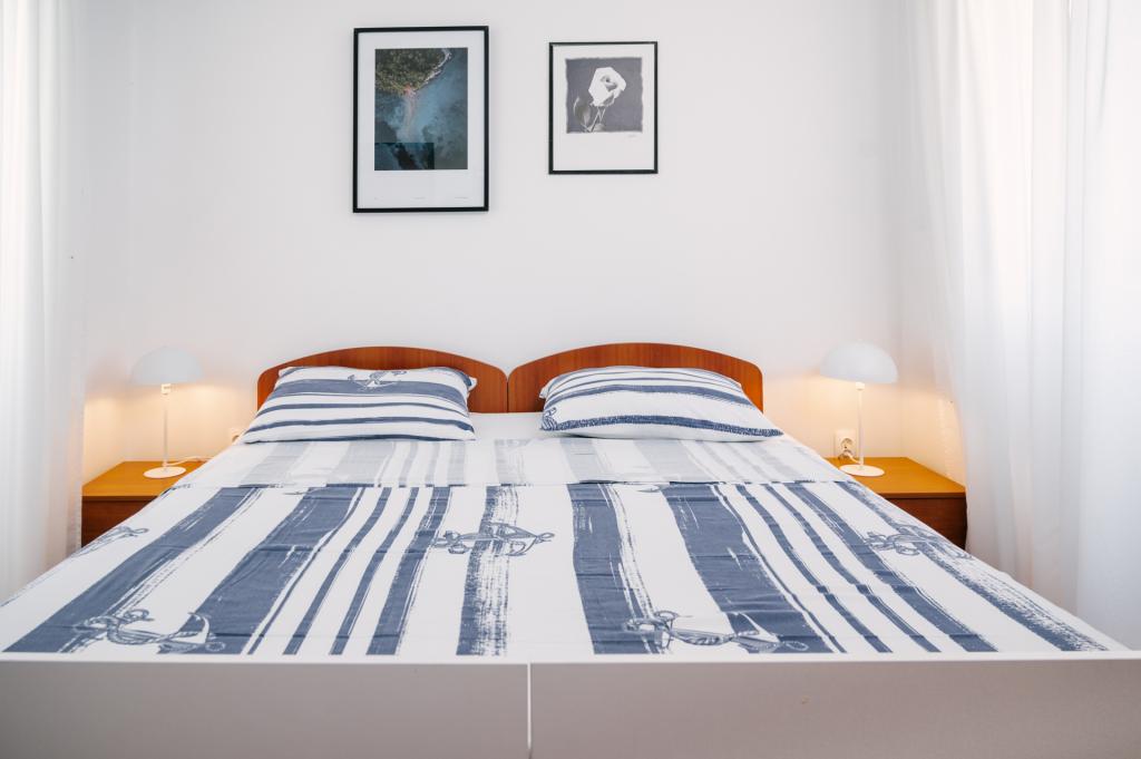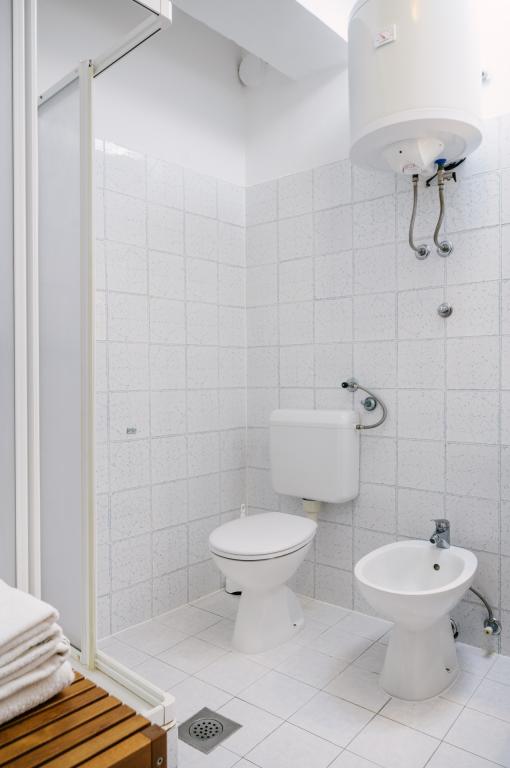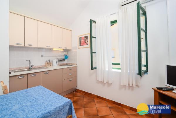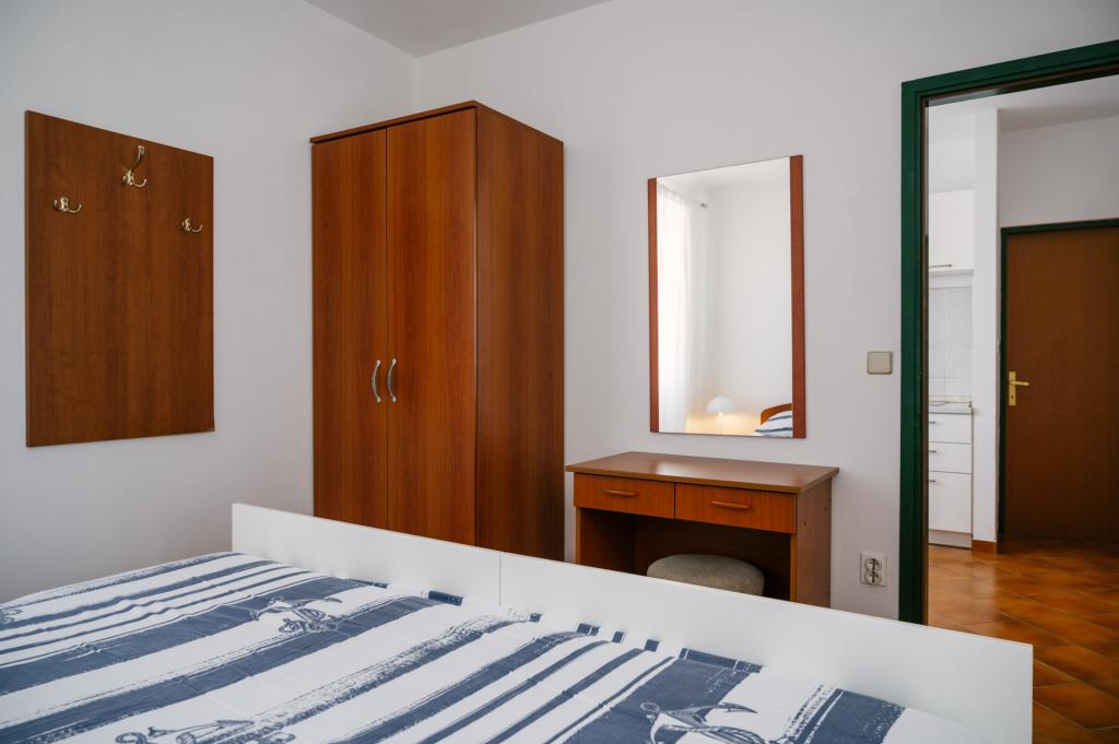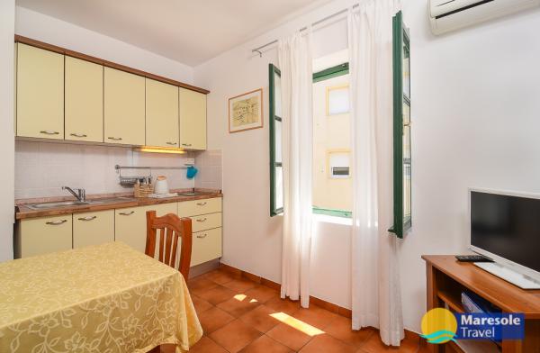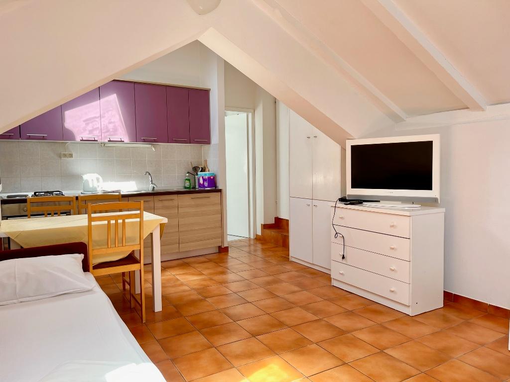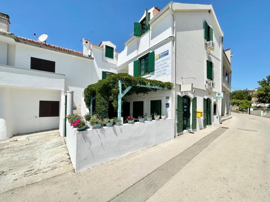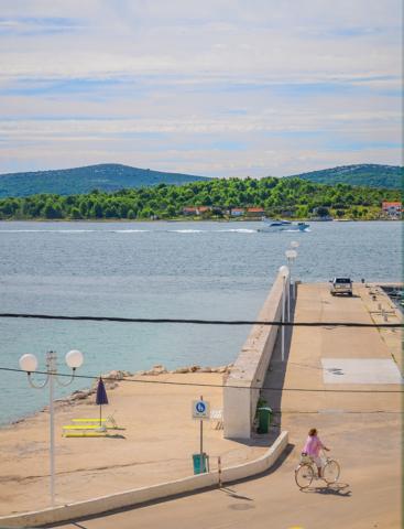 Suvremeno opremljeni apartmani nalaze se na prvome katu i drugome katu (potkrovlje) u kući u centru, na prvoj crti do plaže, s pogledom na more. Apartmani se sastoji od dnevnoga boravka s kuhinjom i kutom za blagovanje u jednome, jedan apartman s balkonom i s pogledom na more, jedne bračne sobe, kupaonice s tušem/WC. Parking na javnome prostoru ispred kuće. - Doplata za kućne ljubimce E5, 00 na dan.
