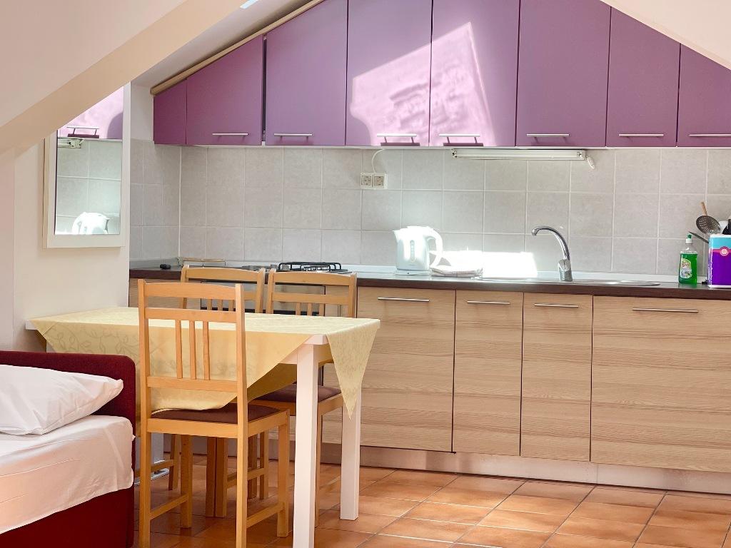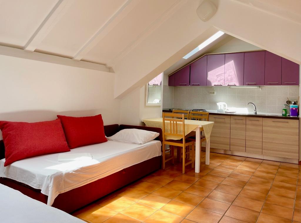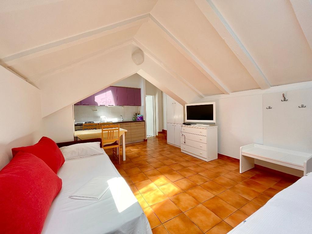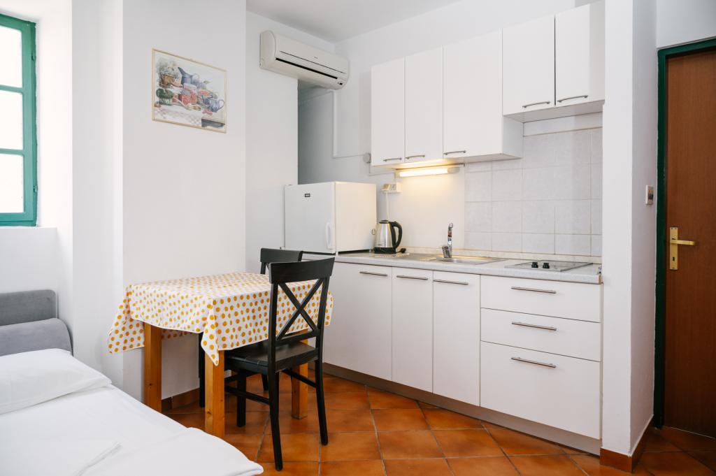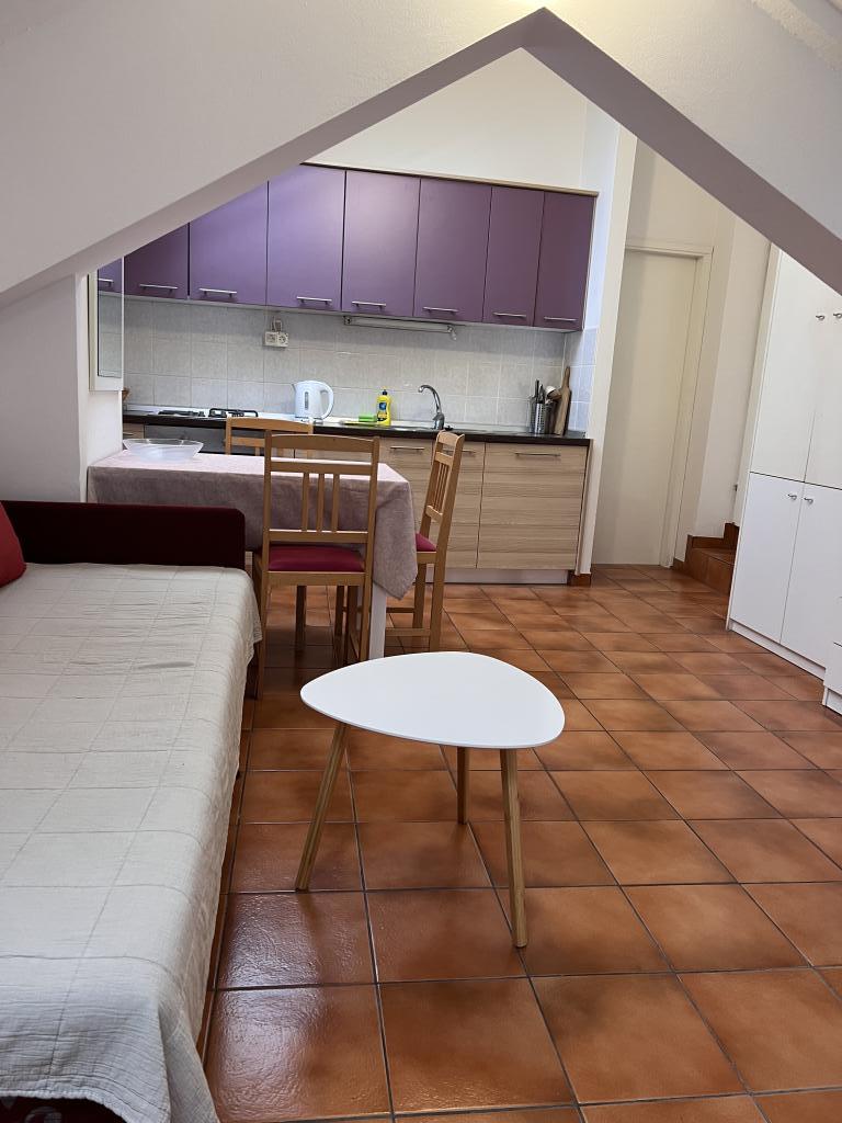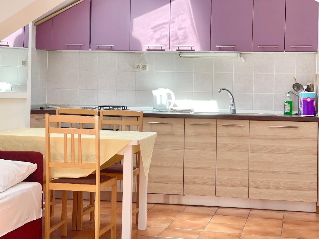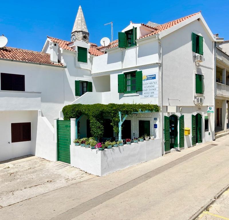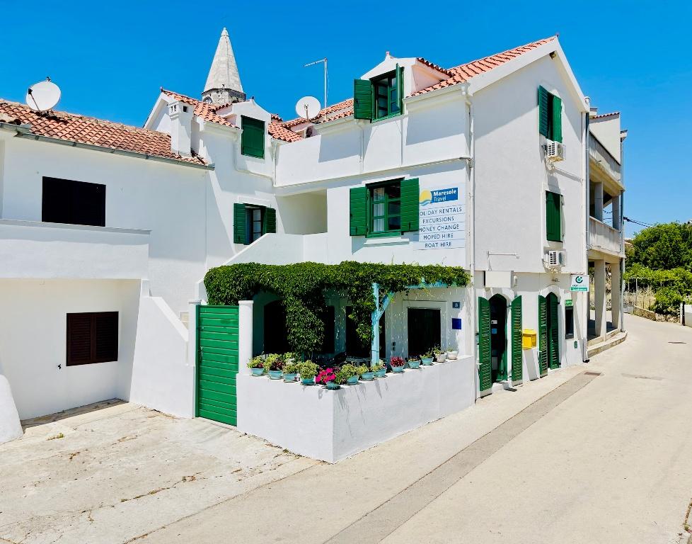 Suvremeno opremljeni apartmani nalaze se na prvome katu i drugome katu (potkrovlje) u kući u centru, na prvoj crti do plaže, s pogledom na more. Apartmani se sastoji od dnevnoga boravka s kuhinjom i kutom za blagovanje u jednome, jedan apartman s balkonom i s pogledom na more, jedne bračne sobe, kupaonice s tušem/WC. Parking na javnome prostoru ispred kuće. - Doplata za kućne ljubimce E5, 00 na dan.