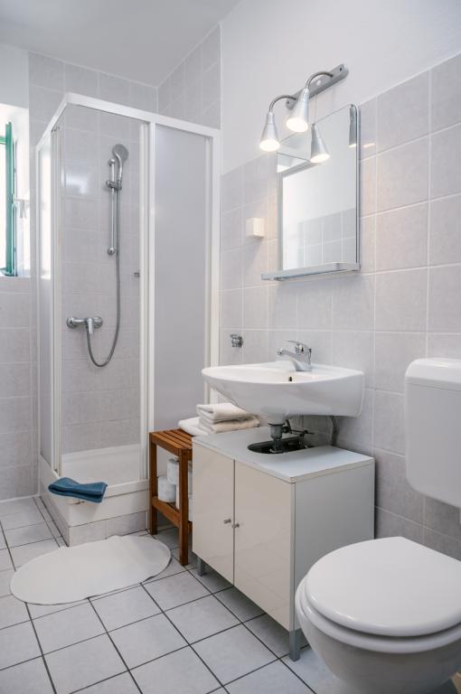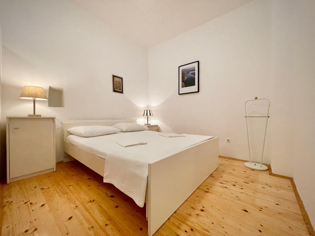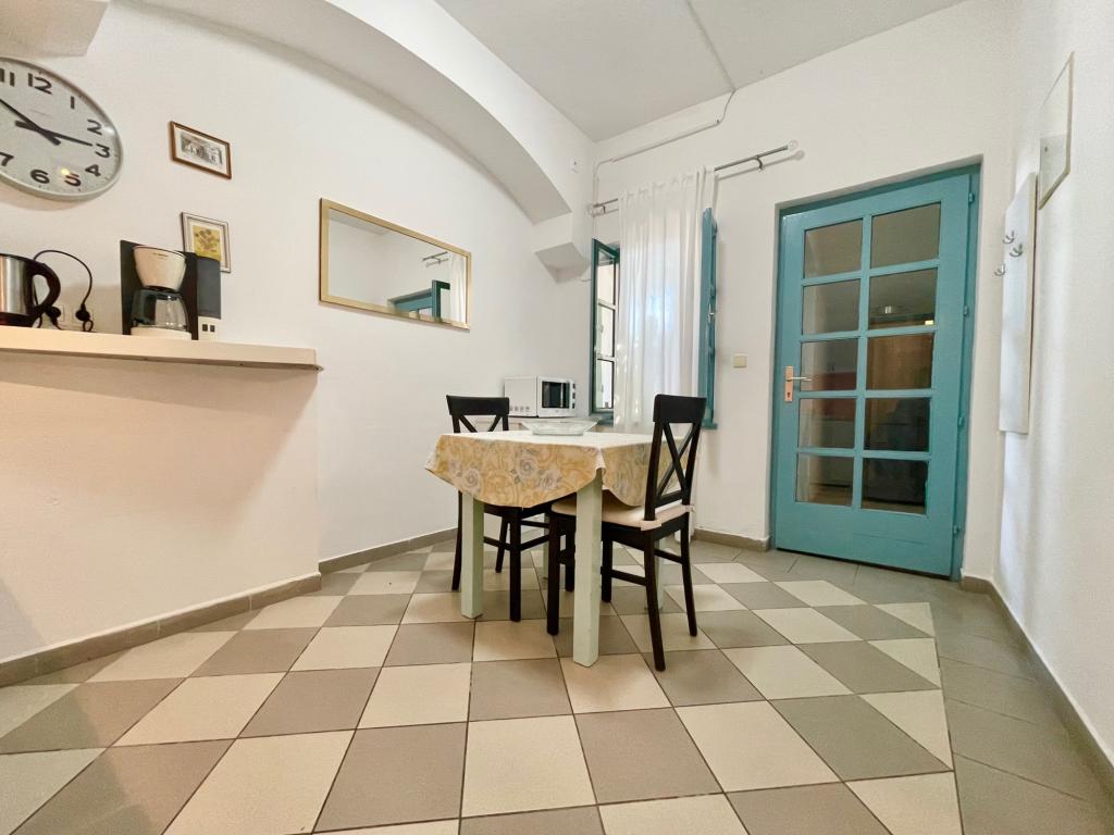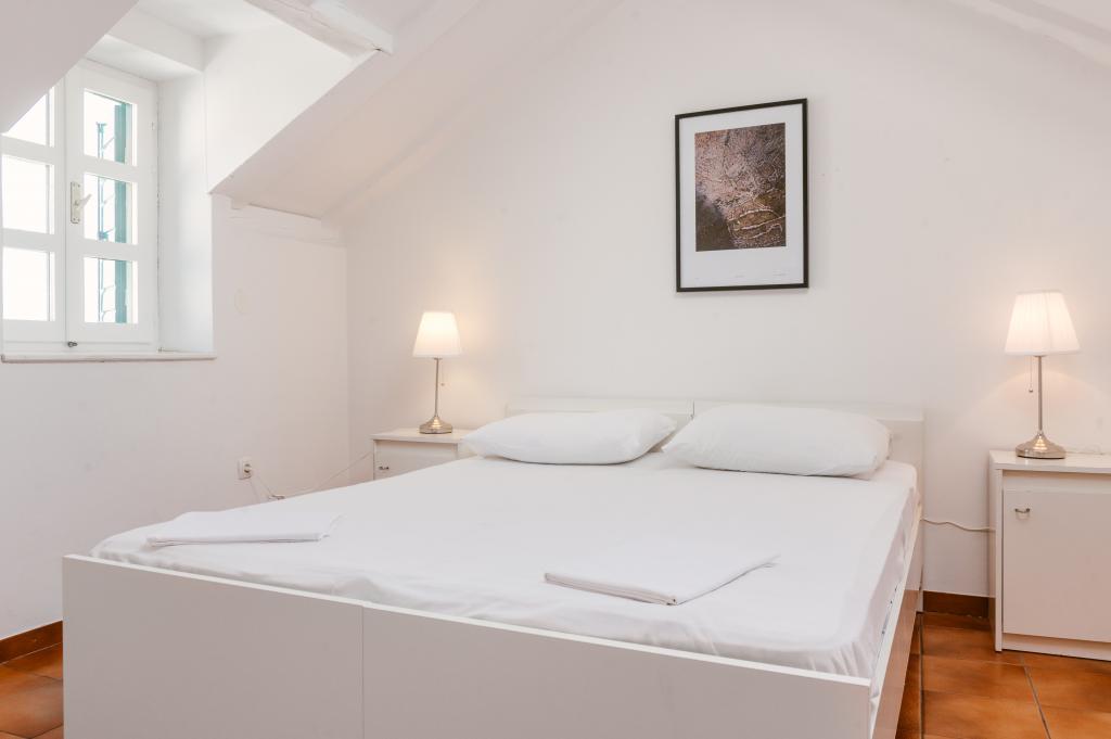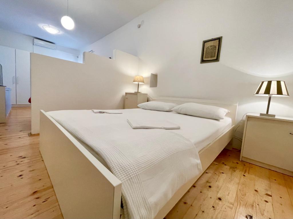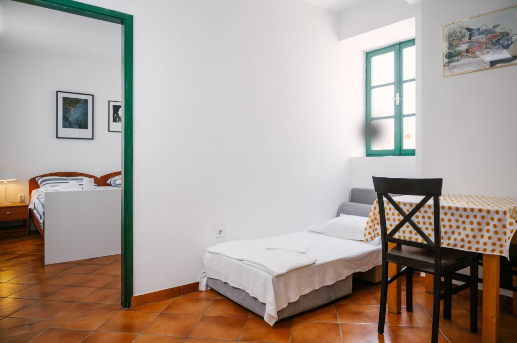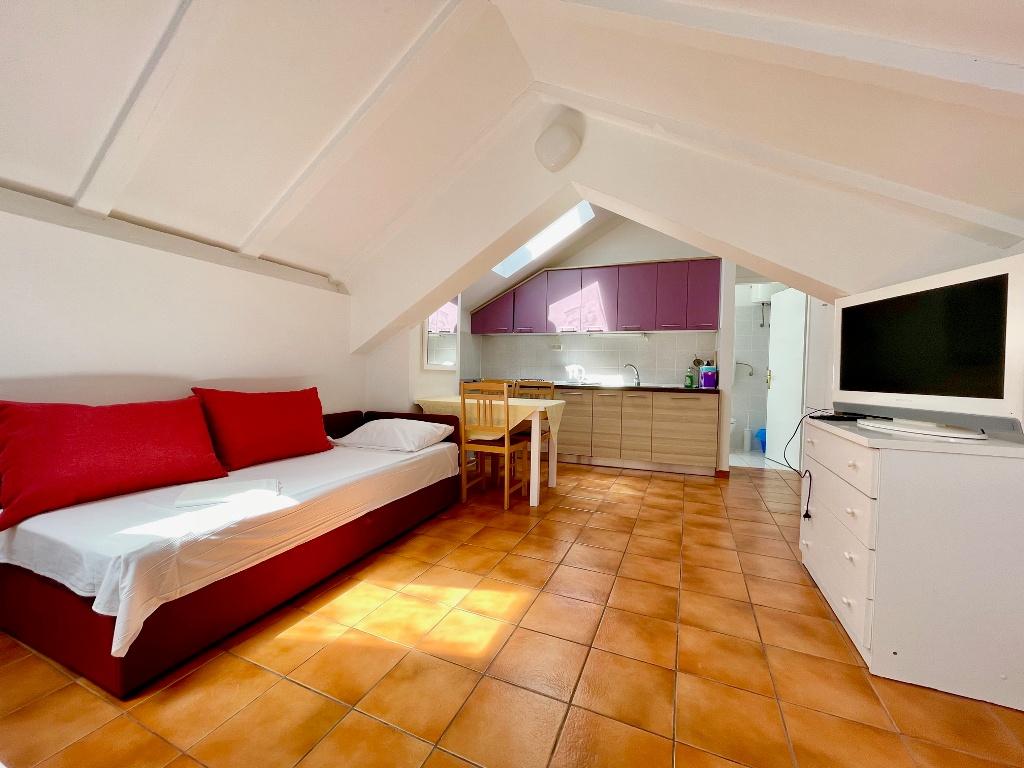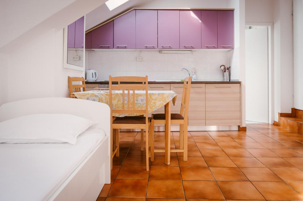 Suvremeno opremljeni apartmani nalaze se na prvome katu i drugome katu (potkrovlje) u kući u centru, na prvoj crti do plaže, s pogledom na more. Apartmani se sastoji od dnevnoga boravka s kuhinjom i kutom za blagovanje u jednome, jedan apartman s balkonom i s pogledom na more, jedne bračne sobe, kupaonice s tušem/WC. Parking na javnome prostoru ispred kuće. - Doplata za kućne ljubimce E5, 00 na dan.