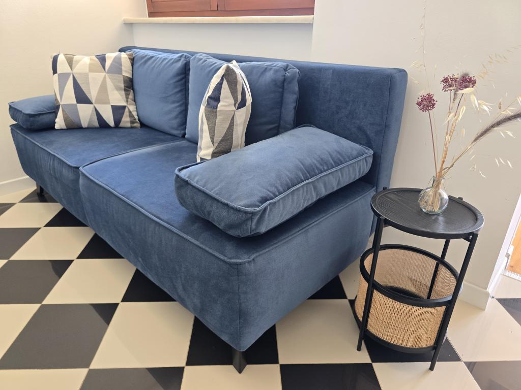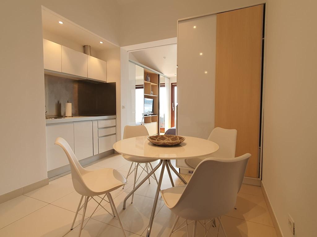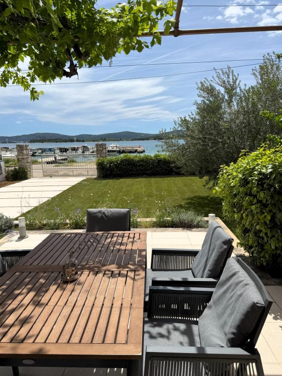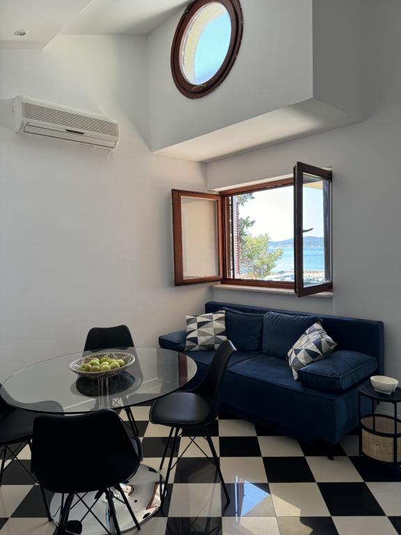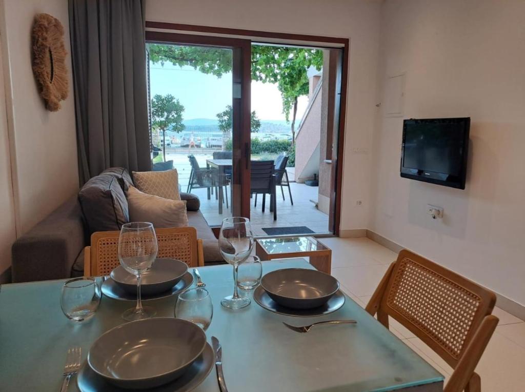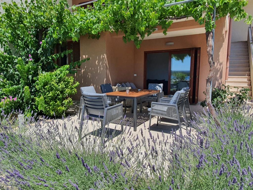 Kompletno i moderno opremljeni apartmani nalaze se u mirnom dijelu mjesta, u prvom redu uz more. Apartmani imaju balkone ili terase s pogledom na more, osiguran privatni parking te prostor za boravak na otvorenom. Plaža, trgovine, restorani, kafići, pekara i ostali sadržaji nalaze se u krugu od najviše 10 minuta hoda, tako da je sve potrebno za ugodan boravak dostupno pješice. Posebna prednost objekta je privatni vez za brod koji se nalazi ispred apartmana, pogodan za brodove do 7 metara duljine. Brod se veže na bovu i na mul, što omogućuje sigurno i jednostavno korištenje. Smještaj je posebno pogodan za obitelji koje žele miran odmor uz more, a pritom imati sve sadržaje u blizini bez potrebe za korištenjem automobila.