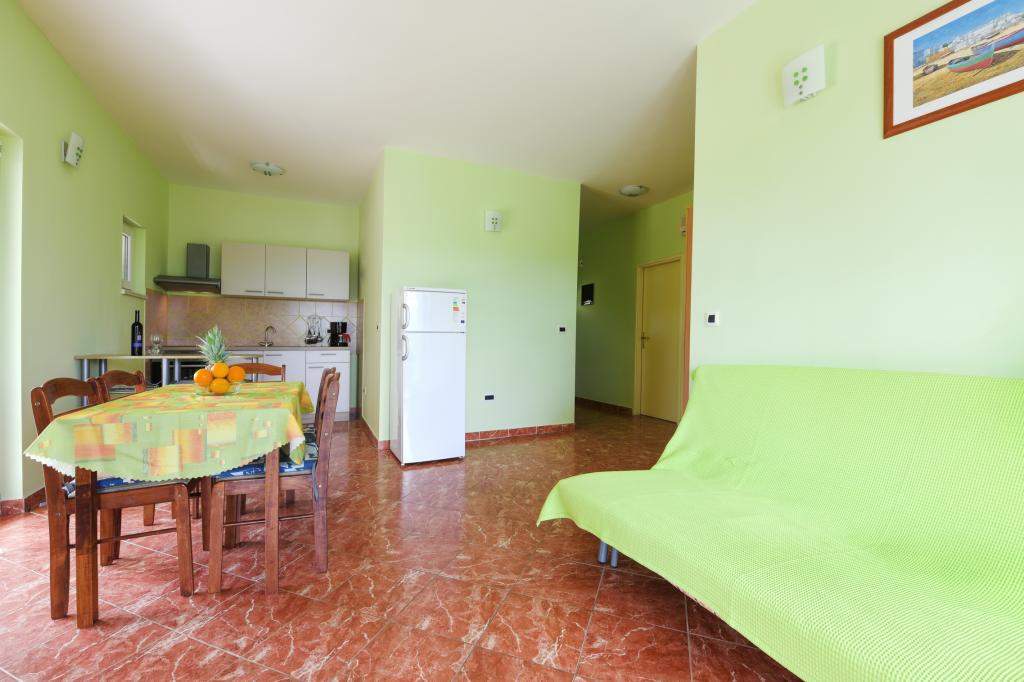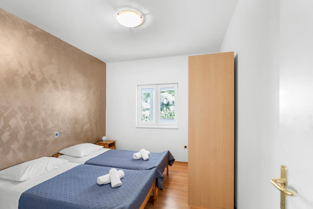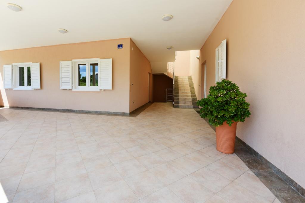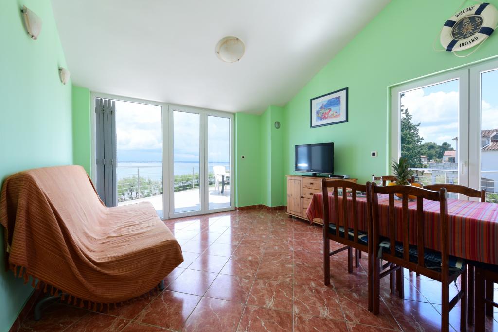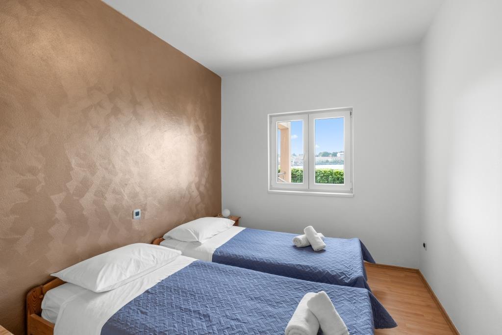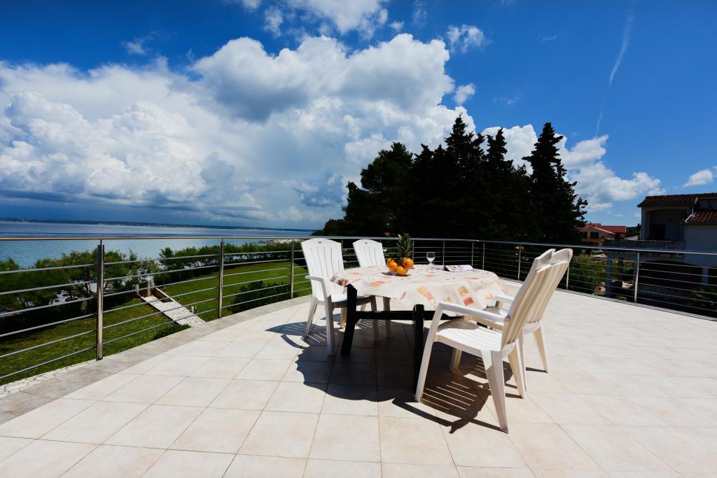 Apartmani se nalaze neposredno uz more u mirnom i prijateljskom seoskom okružju. Svaki apartman ima veliku terasu sa pogledom na more. Okružuje ih uređeni mediteranski vrt pogodan za igru djece. Na raspolaganju su ležaljke i zajednički roštilj u vrtu. Svaki apartman ima 2 kupatila. U blizini na 5 minuta hoda je centar gdje je tržnica sa proizvodima sa lokalnih farmi te trgovine i restorani. Hitna medicinska pomoć je pristupačna 24/7. Plaža neposredno ispred apartmana je šljunčana a ima više plaža na maloj udaljenosti gdje se nalazi i pješčana plaža. Dolazak automobilom: autoput vodi direktno u trajektnu luku Gaženica. Nakon toga slijedi ukrcaj na trajekt za Preko. Ljeti su linije učestale, prometuje najmanje svaki sat. Iz trajektne luke Preko se otočkom magistralom stiže u mjesto Ugljan koje je udaljeno 10 km. Dolazak avionom: Iz zračne luke Zadar autobusom ili taxijem za 15 min. se stiže direktno u trajektnu luku Gaženica gdje se ukrcava na trajekt za Preko .