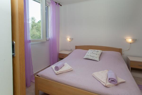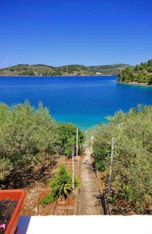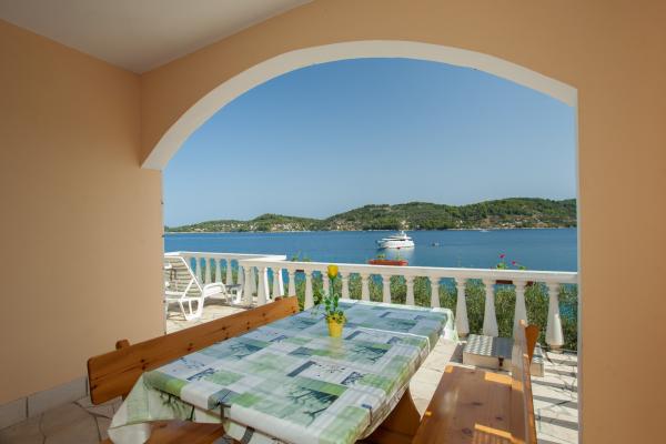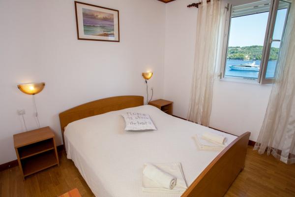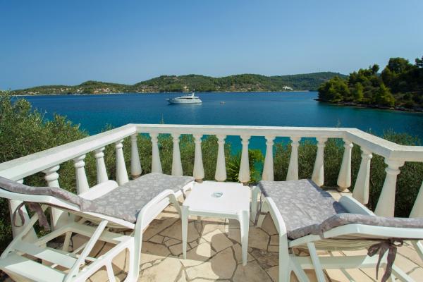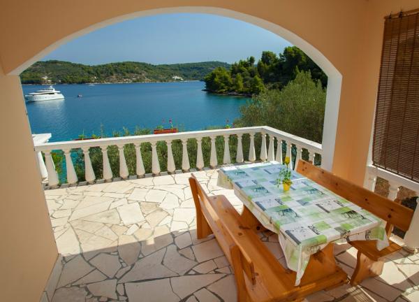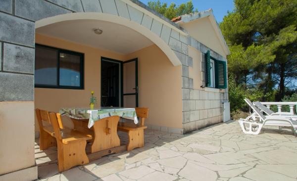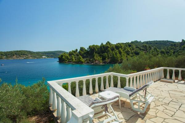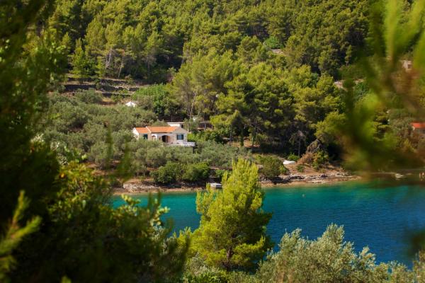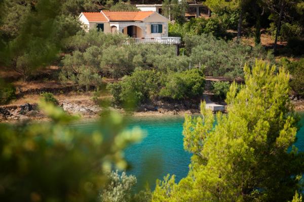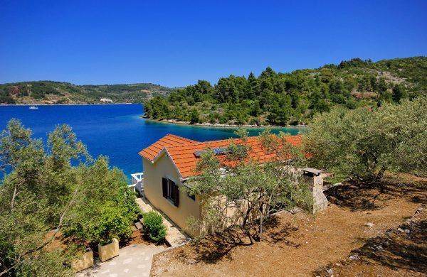 Kuča je smještena u mirnoj uvali blizu Vele Luke. Nalazi se na samo 10 metara od mora okružena stablima maslina. Sa prostrane terase pruža se pogled na Velolučki zaljev i otok Ošjak. , Sastoji se od dvije spavaće sobe, dnevne sobe, kuhinje i wc-a. Površina terase je 20 m2. Energija je solarna 12v sa pretvaračem na 220 v. Nije moguće korištenje velikih potrošača električne energije. Ima plinski bojler, plinski hladnjak 160 i plinsko kuhalo. Za sve one koji žele uživati u čistom moru i tišini pravi je odabir.