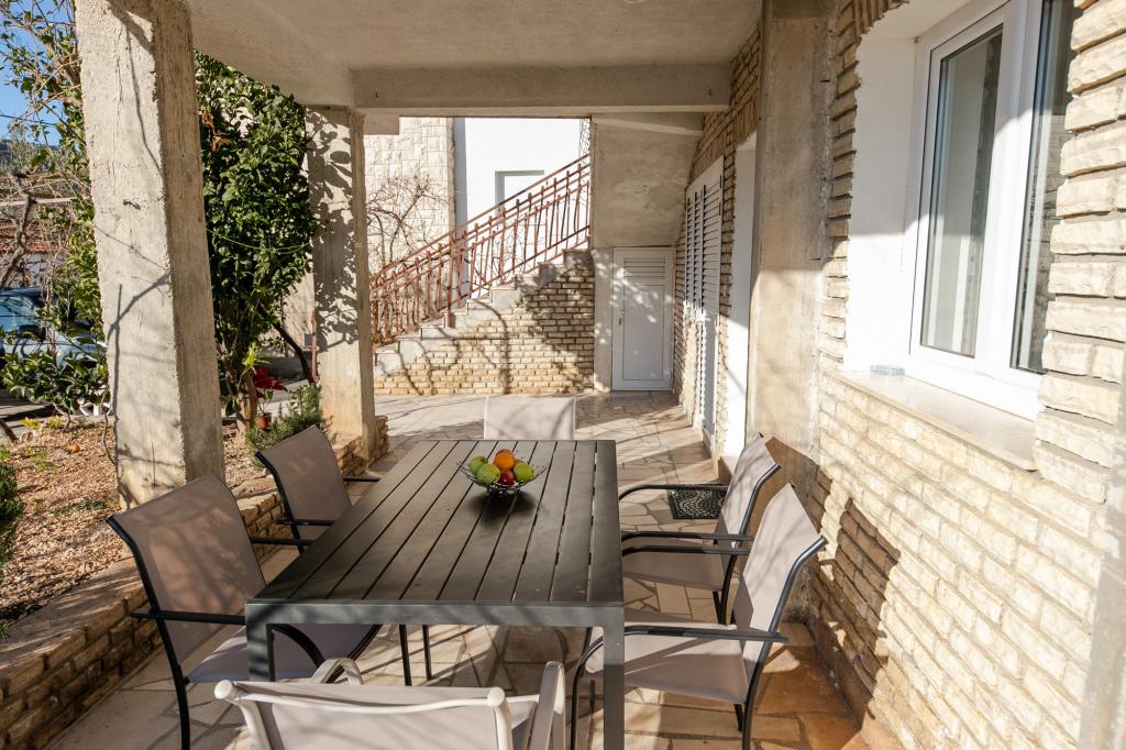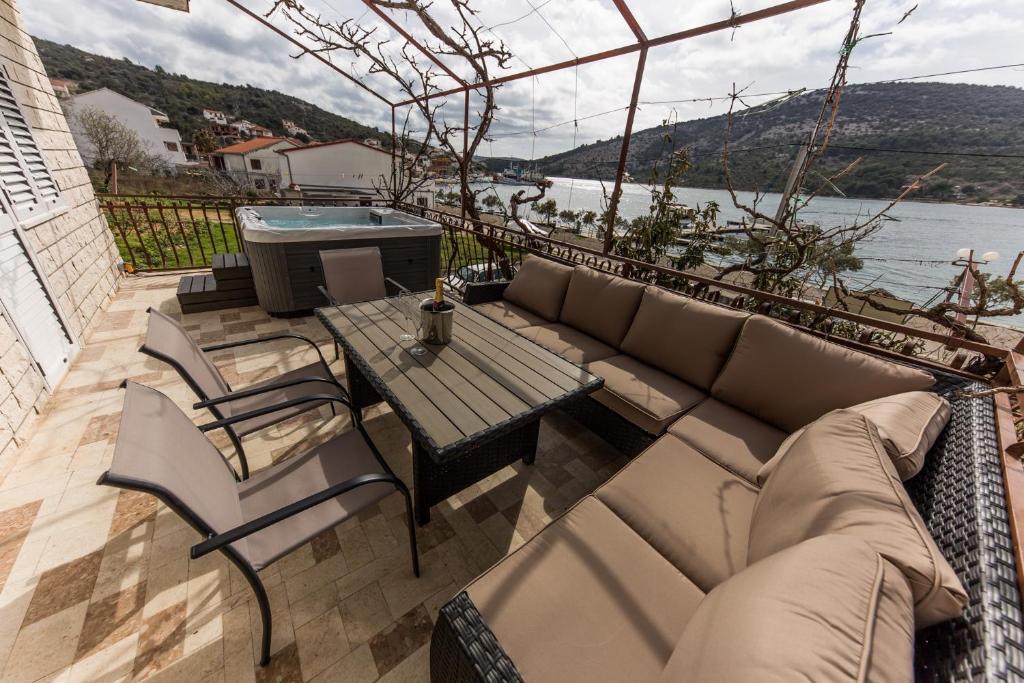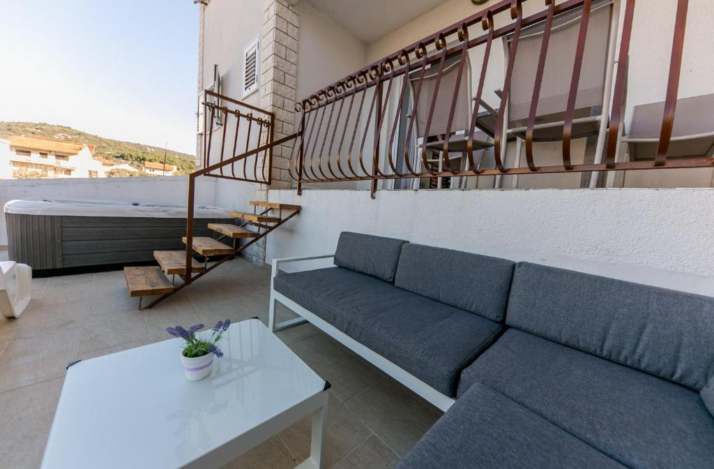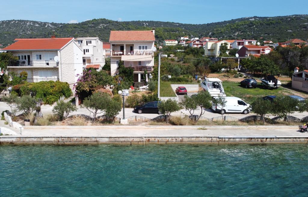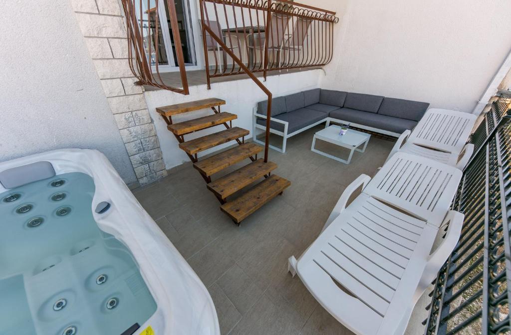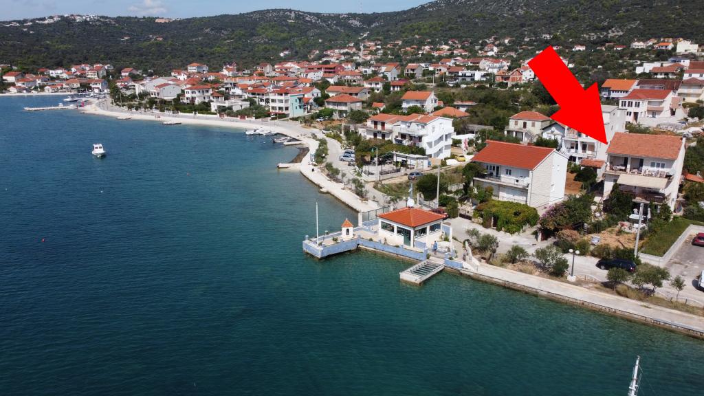 Apartmani Mate nalaze se u Vinišću, 15 km zapadno od Trogira. Kuća se nalazi 10 metara od mora i plaže, te ima veliki parking za 8 automobila. Kuća ima 5 apartmana: Apartman (6 2) Prizemlje s jacuzzijem: 3 sobe, kuhinja sa dnevnim boravkom, kupatilo i predvorje s jacuzzijem. Apartman (7) Prvi kat s jacuzzijem: 3 sobe, kuhinja sa dnevnim boravkom, 2 kupatila i velika terasa sa jacuzzijem. Apartman (5 1) Penthouse: 2 sobe, kuhinja sa dnevnim boravkom, kupatilo i veliki balkon. Zajednički jacuzzi. Apartman (4) Prvi kat s jacuzzijem s: 2 sobe, kuhinja, kupatilom i velika terasa s jacuzzijem. Apartman (4) Drugi kat : 2 sobe, kuhinja, kupatilom i balkon. Zajednički jacuzzi Svim gostima na raspolaganju je vanjski roštilj. Gosti mogu koristiti bicikle, kajak i sup board. Kuća je: - 10 metara od mora i plaže -100 metara od restorana -150 metara od dućana