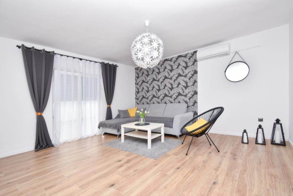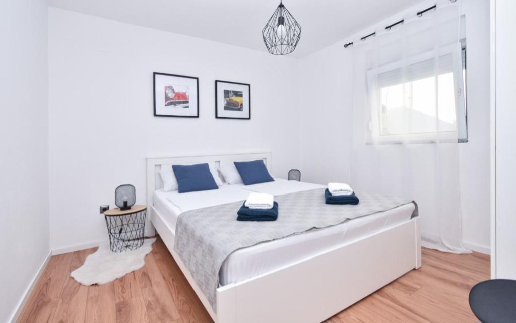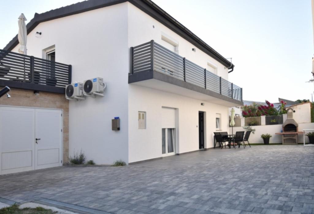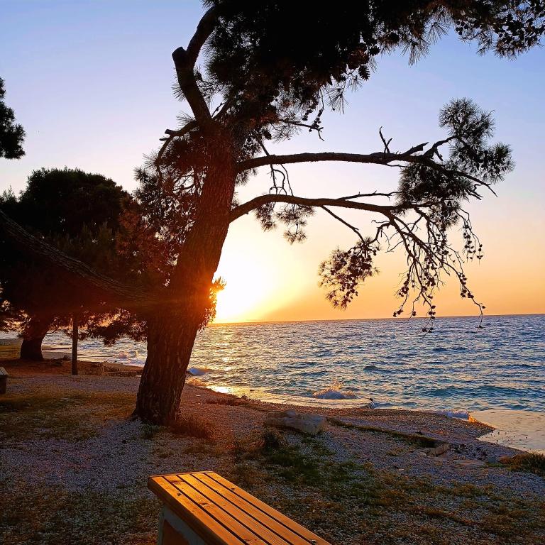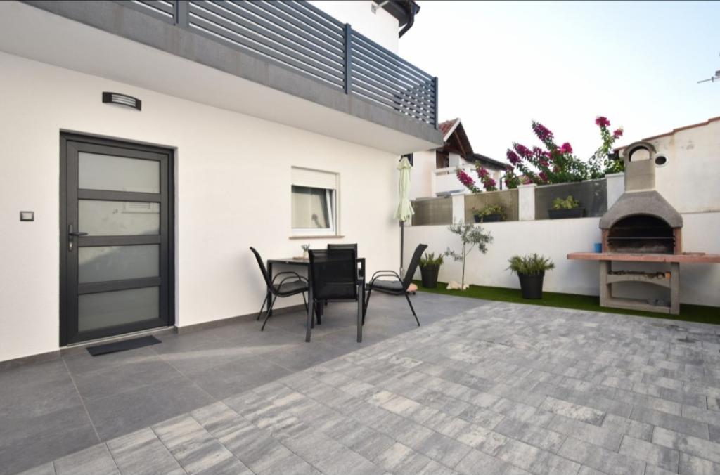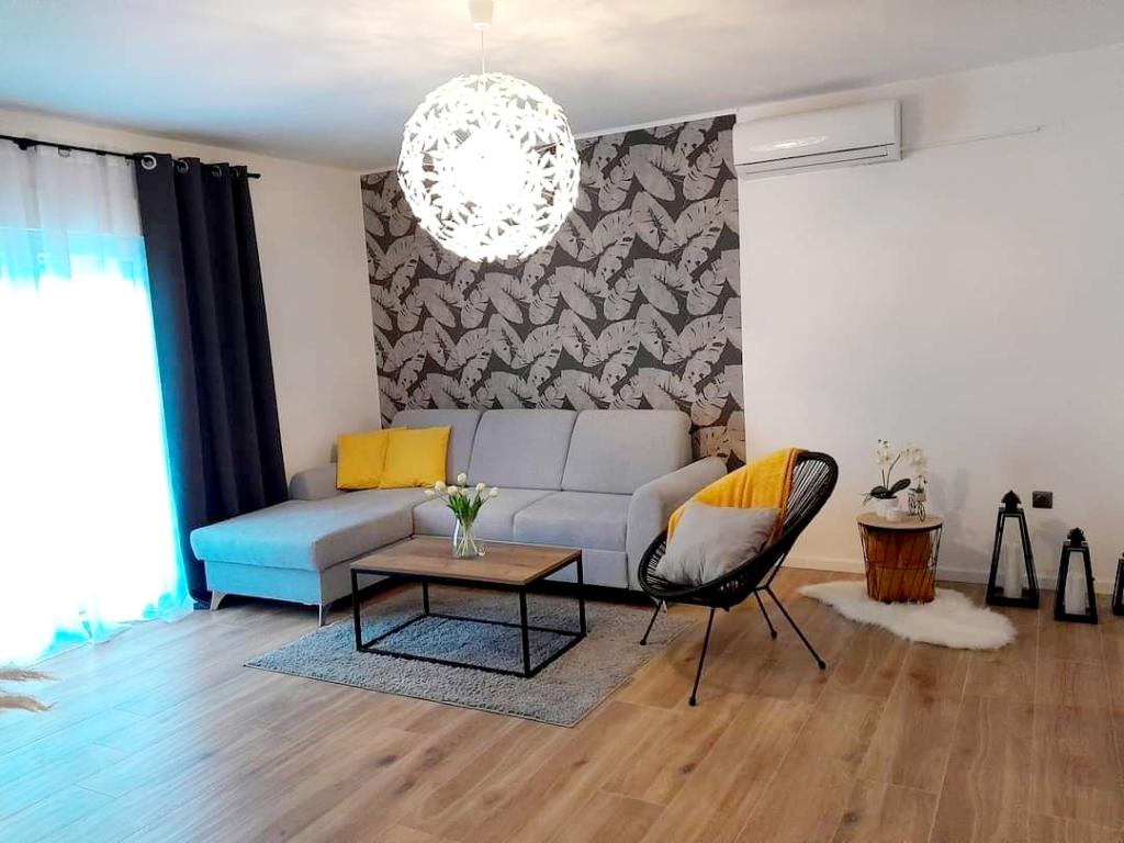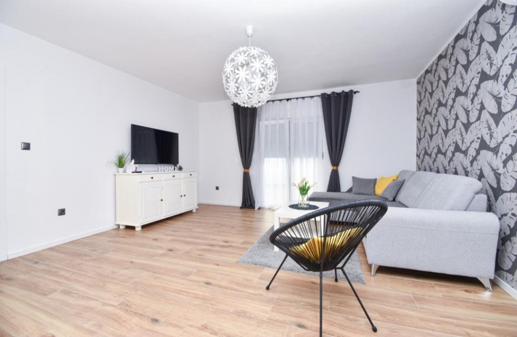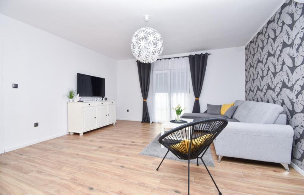 Kompletno i suvremeno opremljen apartman u prizemlju 90m2 u mirnom predjelu. Smješten drugi red od mora, 40 metara od prekrasne plaže i šetnice uz more. Restorani, pekare i trgovine nalazi se u krugu od 50 metara. Kuhinja je opremljena svim aparatima od perilice posuđa, pećnice, el.ploča za kuhanje te kuhala za vodu. Besplatan WiFi i klima uređaj. Svaki gost dobije na korištenja 2 ručnika. Također ako imate malu bebu u sobi se nalazi kinderbet.