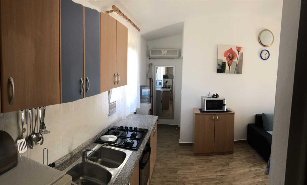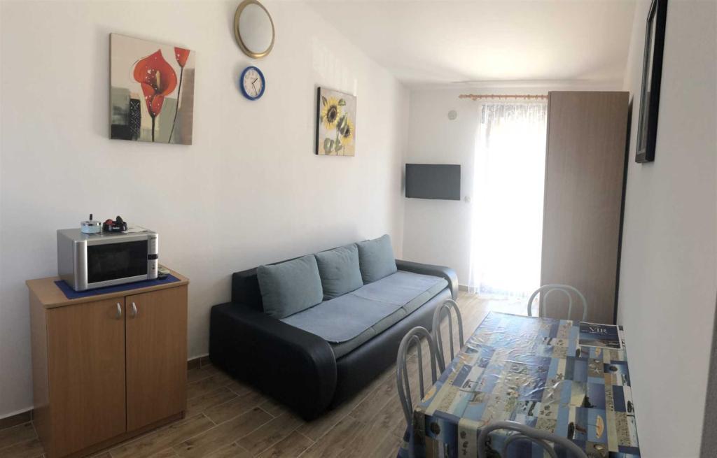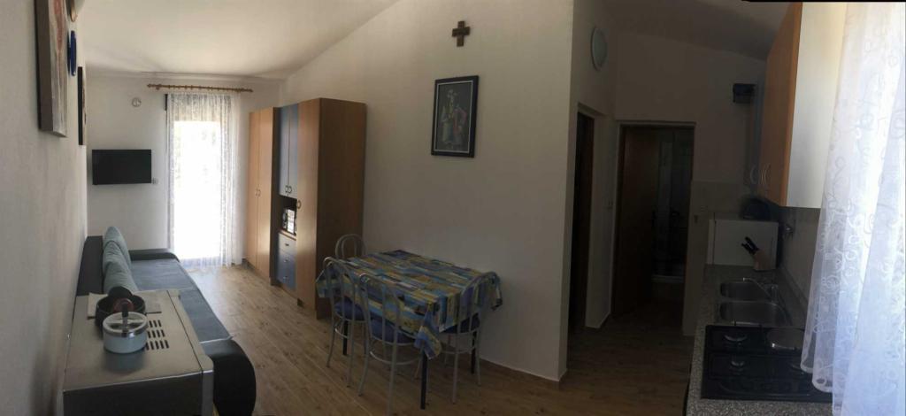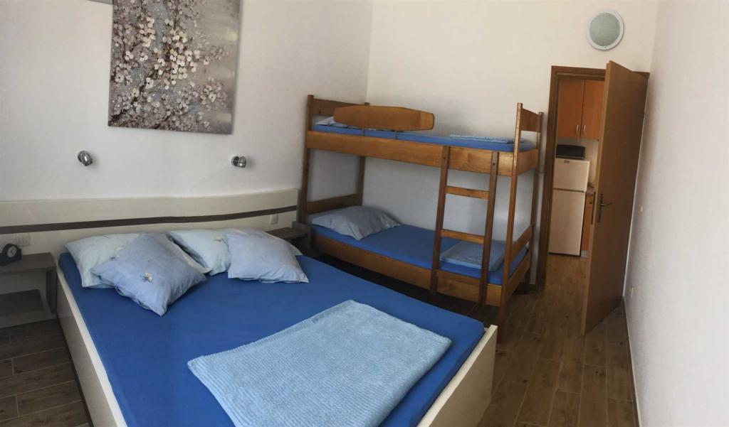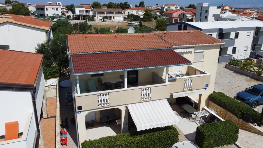 Apartman (***) za 4 osobe udaljen 70m od plaže Žitna uvala, nalazi se na katu. Apartman je opremljen LED TV (TV+SAT), radio, Wi-Fi, parkirno mjesto za jedno vozilo u ograđenom dvorištu, klima uređaj (korištenje uključeno u cijenu). U kuhinji ćete pronaći svu potrebnu opremu i uređaje (poput hladnjaka s velikim zamrzivačem, mikrovalne pećnice, uređaja za vodu itd.), spavaća soba sadrži bračni krevet i krevet na kat, dodatni ležaj nalazi se u dnevnom boravku (s dodatnim ležajem apartman može primiti 5 osoba), prostrani natkriveni balkon od 20 m2 sa pogledom na more (otok Pag i Velebit) na kojemu se nalaze stol, stolice i ležaljke.