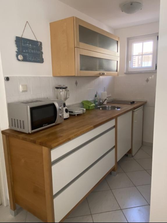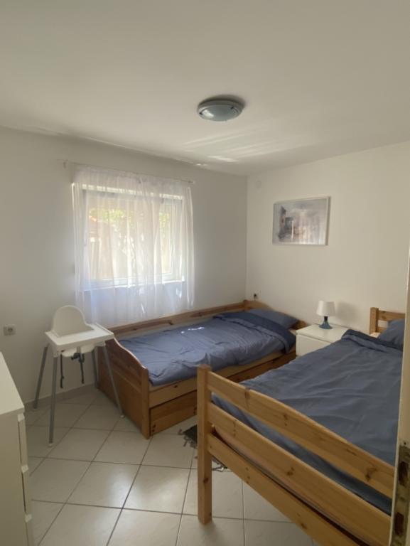 Nudimo smještaj u novouređenom dvosobnom studio apartmanu u prizemlju kuće od 37m2. Sastoji se od 2 spavaće sobe, opremljenom kuhinjom, blagavaonom, kupaonicom i velikom terasom. Kuća ima lijepo uređeno dvorište, roštilj i ograđeni parking za 1 automobil. Idealno za miran i ugodan odmor. Studio apartman se nalazi u slijepoj ulici koja nije prometna i idealno je za djecu. Uređena plaža je udaljena 400 m. Na plaži se nalazi caffe bar. Studio apartman opremljen je: hranilicom za bebe, klima uređajem, LED tv, kuhalo za vodu, mikrovalna pećnica, toster, blender, ploča za kuhanje, hladnjak ,sušilo za kosu, glačalo, sušilo za veš ,vrtni roštilj.
