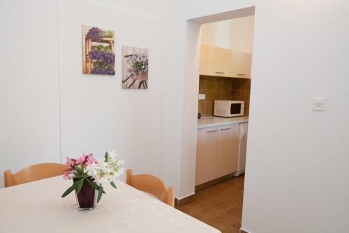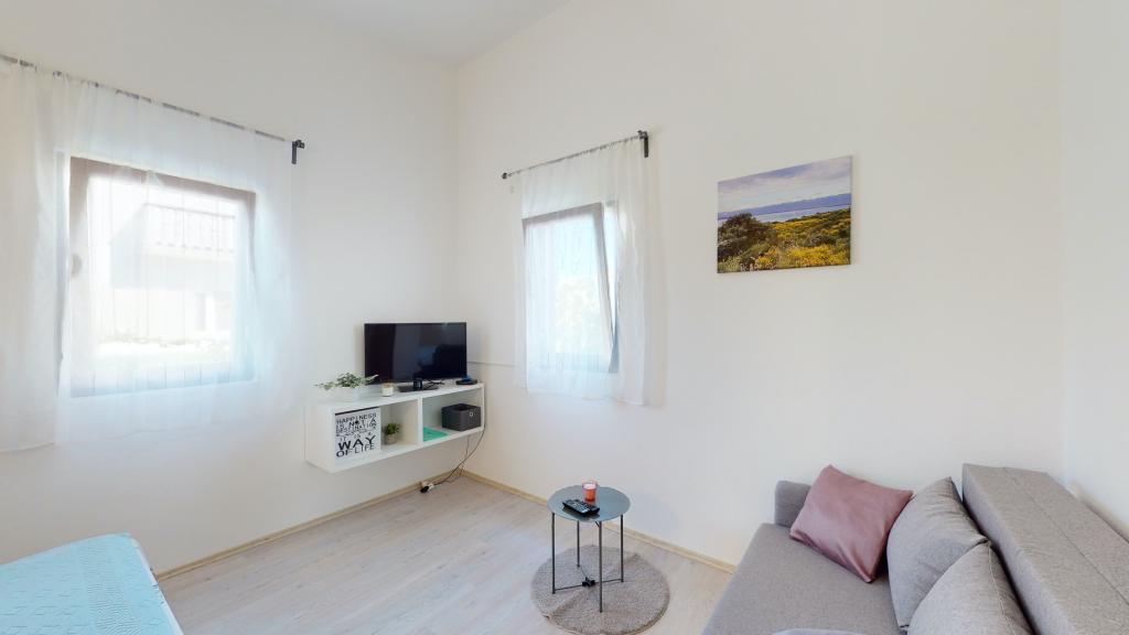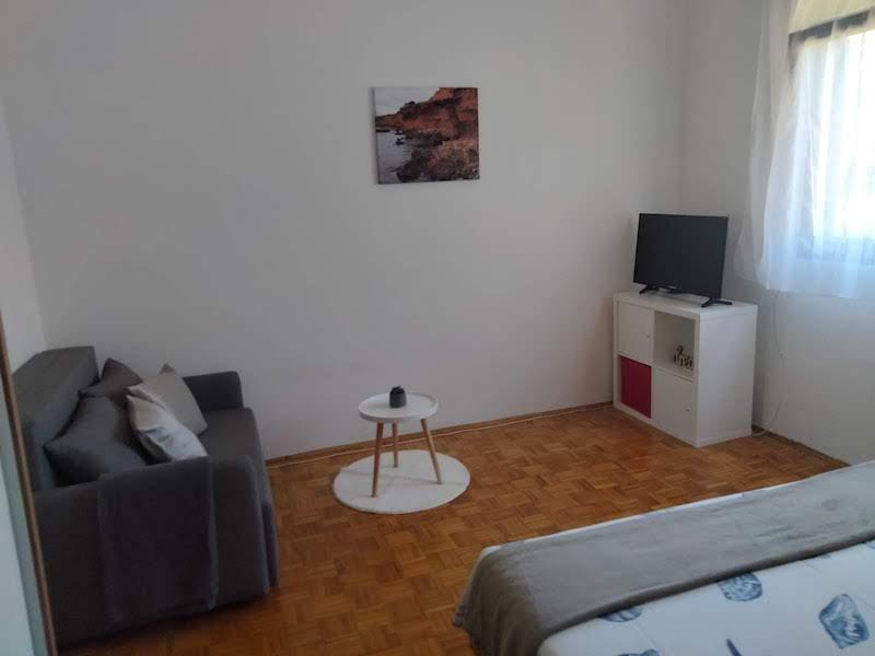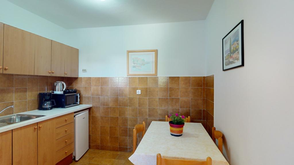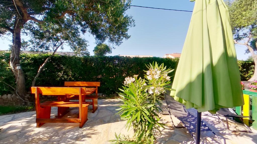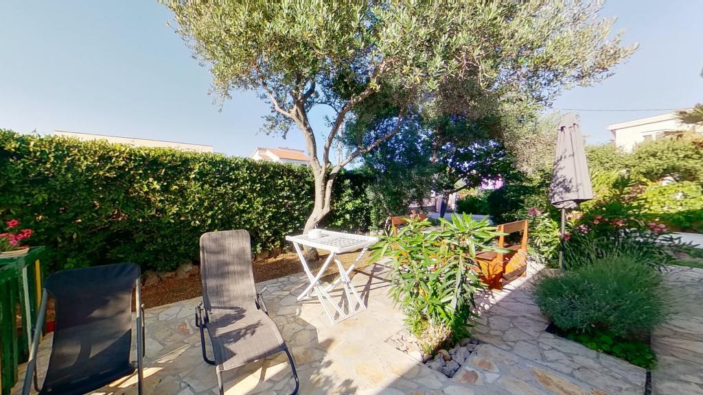 Kompletno uređen apartman prizemlju. Ispred apartmana 40 m2 kamene terase okružene zelenilom. Parking i grill u dvorištu objekta. Sve za ugodan boravak dostupno je u krugu od 250 m: plaža, centar, market, restoran.
