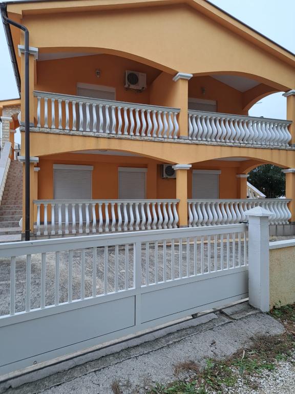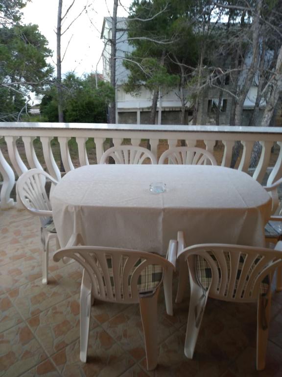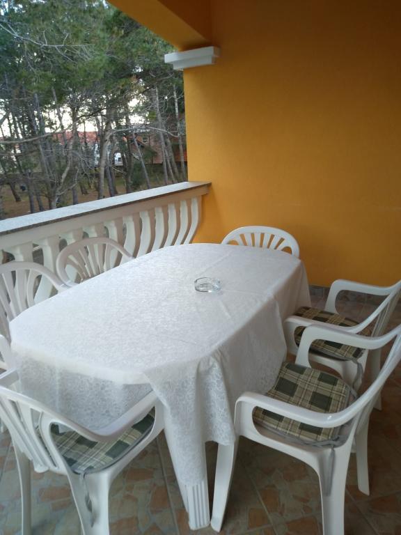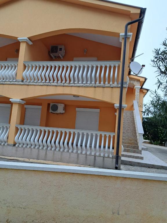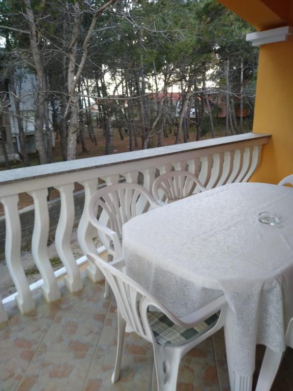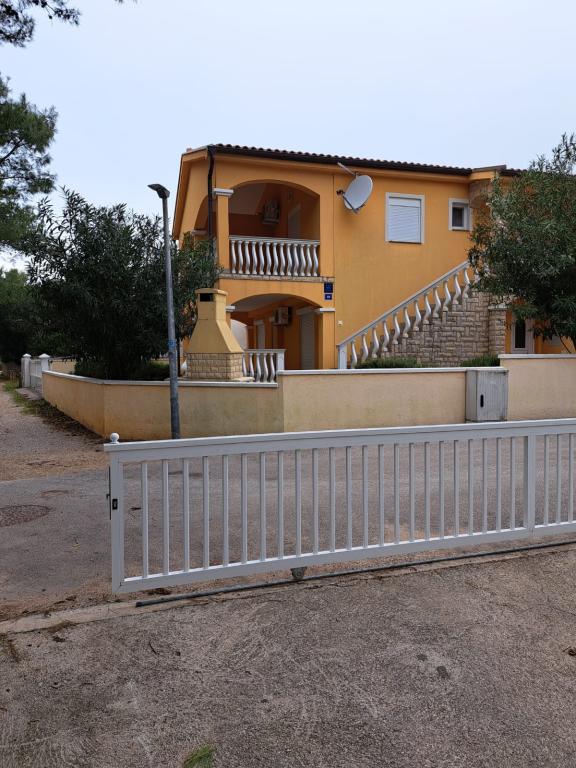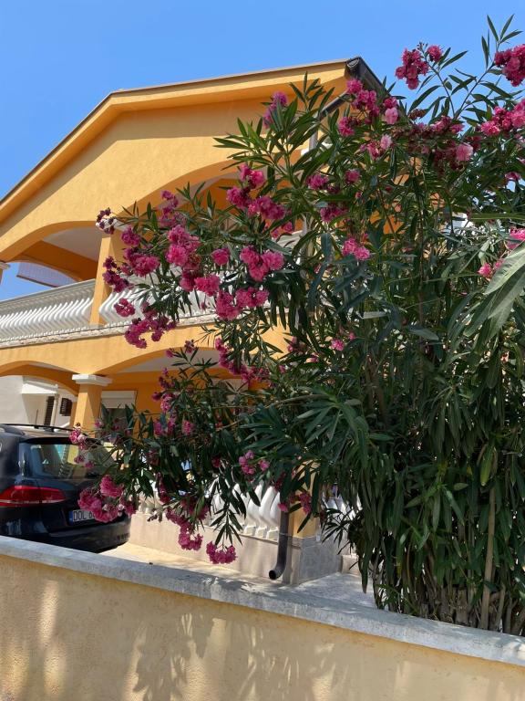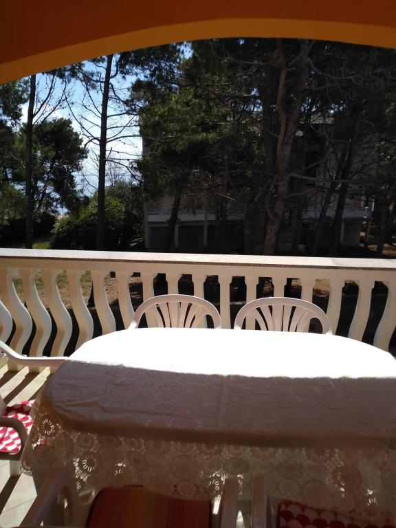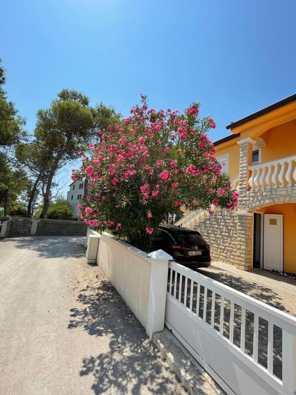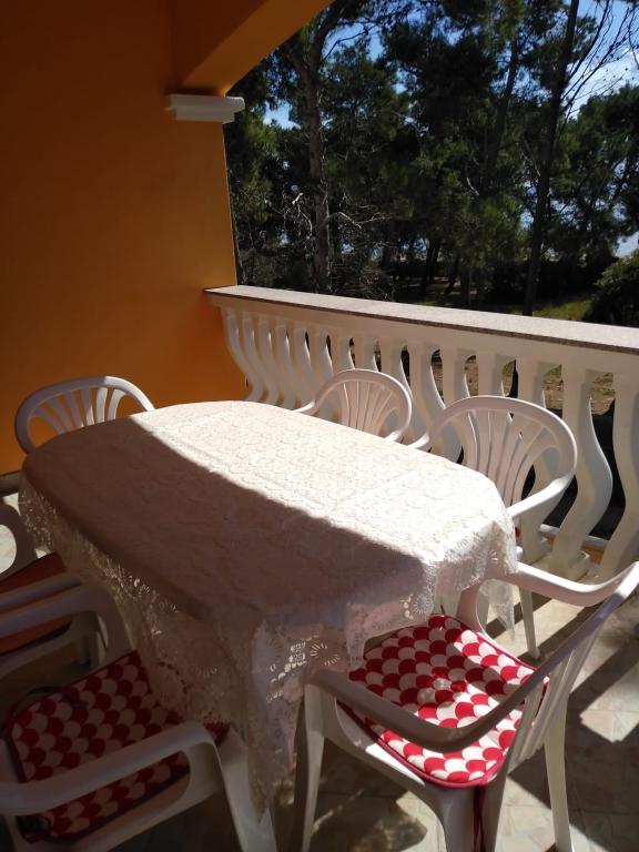 Kompletno opremljen apartman u mirnoj ulici. Terasa ima pogled na borov šumarak i more. Apartman je potpuno namješten s svim potrebštinama poput wi-fi, klima, mikrovalna pećnica, štednjak, aparat za hladnu i toplu vodu itd. Parking se nalazi u dvorištu kuće. Do plaže ima 2 minute hoda.