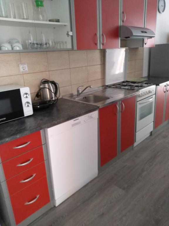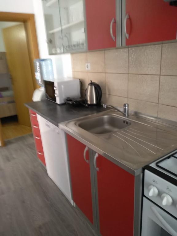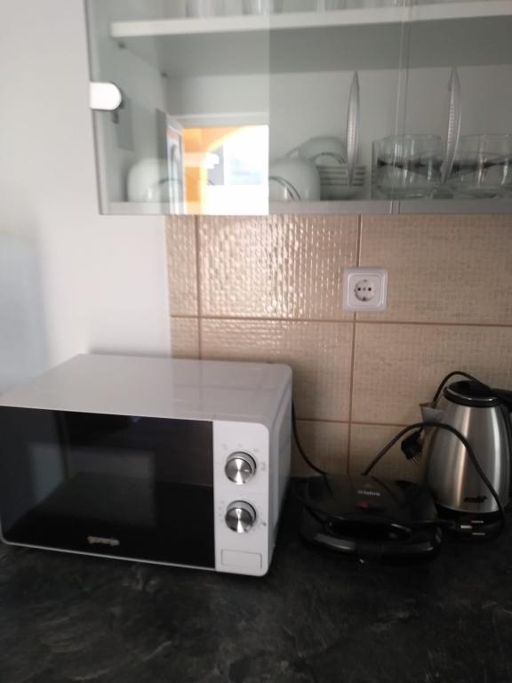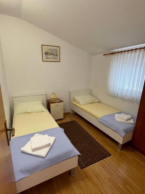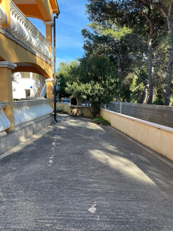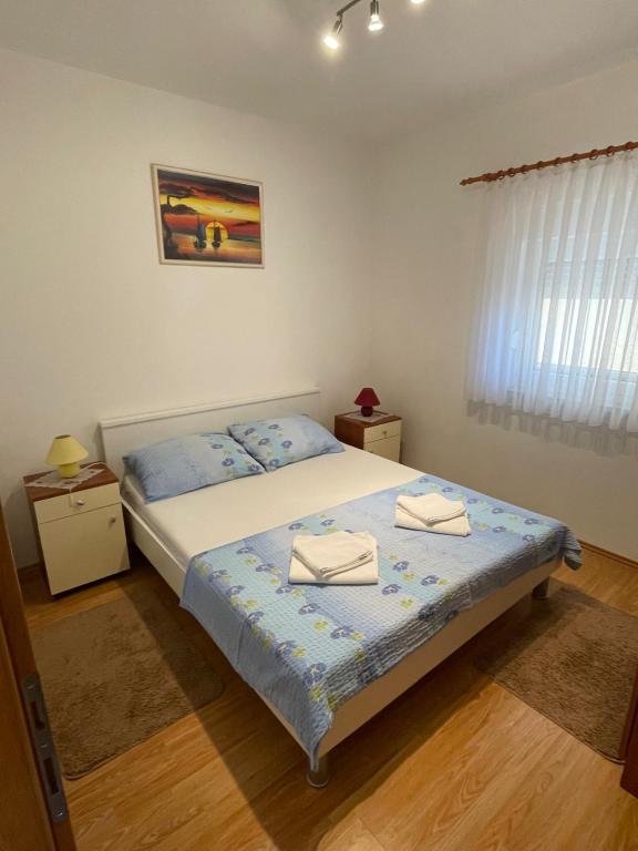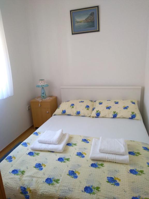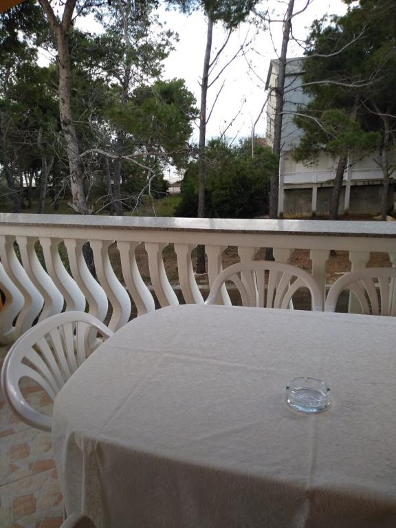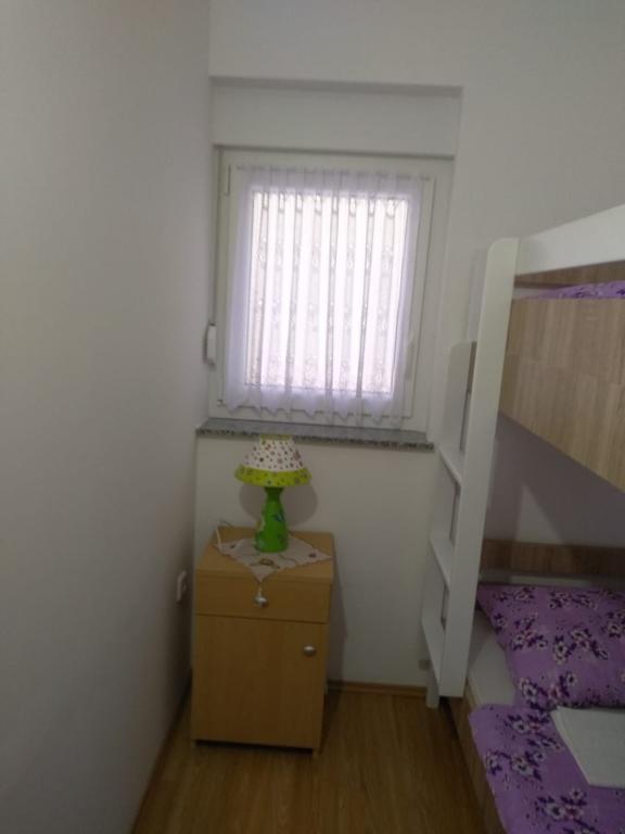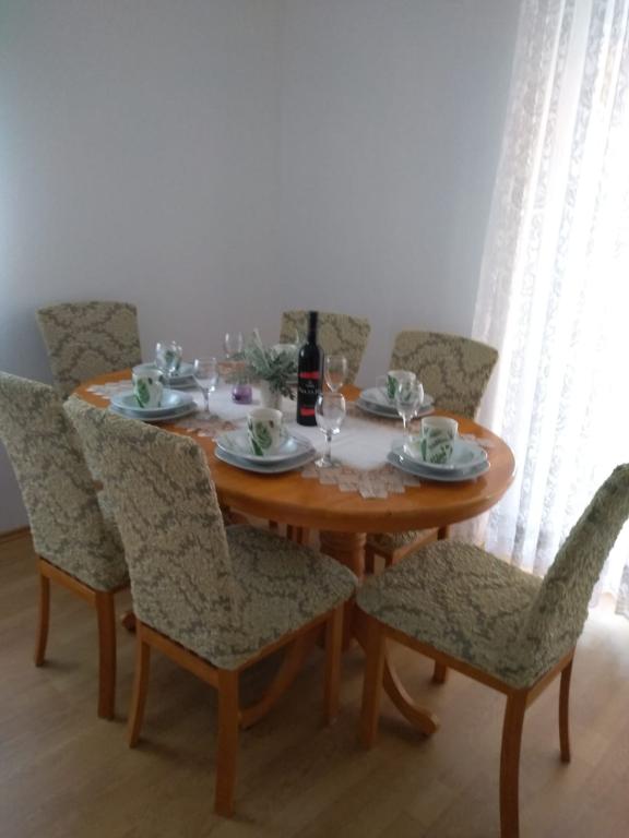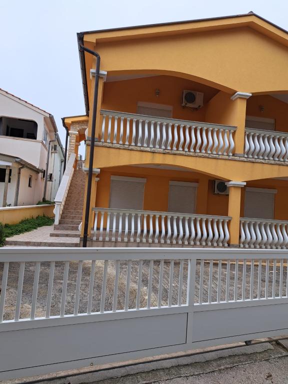 Kompletno opremljen apartman u mirnoj ulici. Terasa ima pogled na borov šumarak i more. Apartman je potpuno namješten s svim potrebštinama poput wi-fi, klima, mikrovalna pećnica, štednjak, aparat za hladnu i toplu vodu itd. Parking se nalazi u dvorištu kuće. Do plaže ima 2 minute hoda.