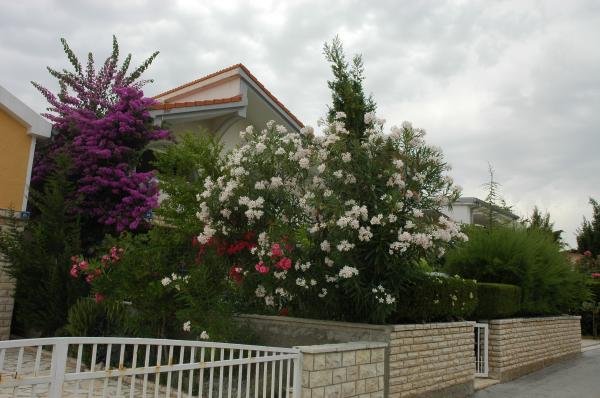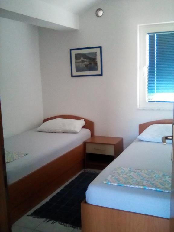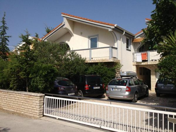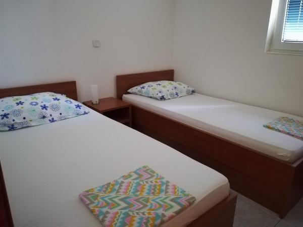 Moderni, kompletno namješteni dvosobni apartmani za 4 osobe sa kuhinjom, blagovaonom, zajedničkom terasom i grill u dvorištu, jedno parkirno mjesto po apartmanu. Dvorište ograđeno i noću zaključano. Udaljenost do plaže 200 m, do dućana 50 m, a do supermarketa 500 m.