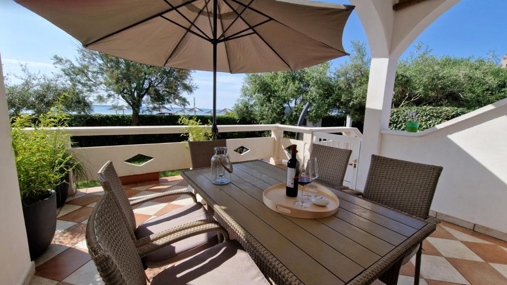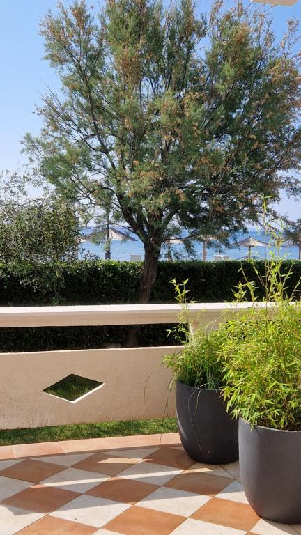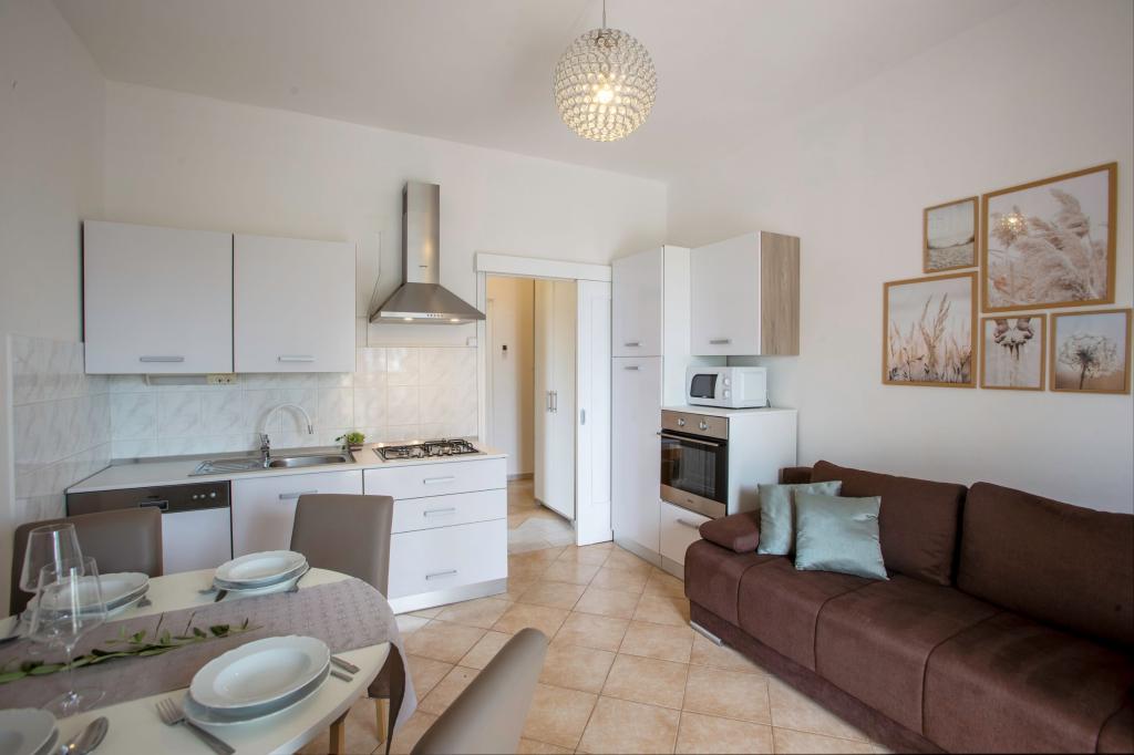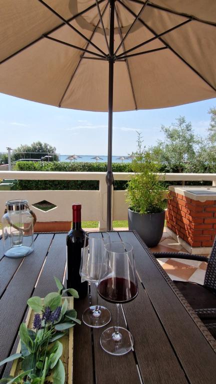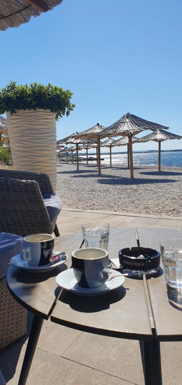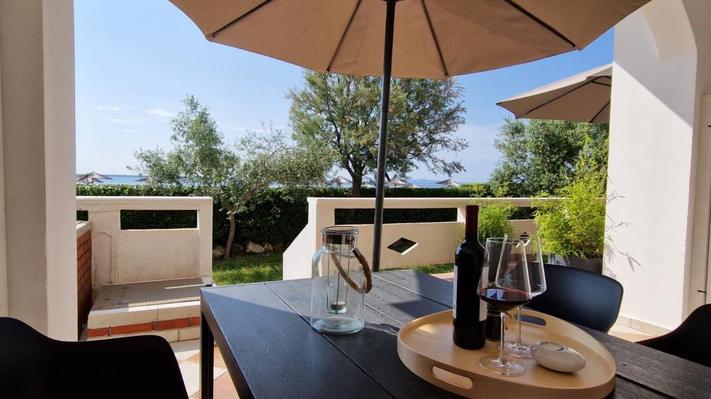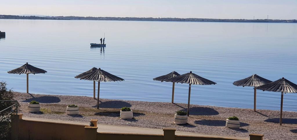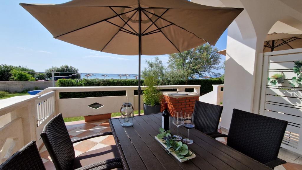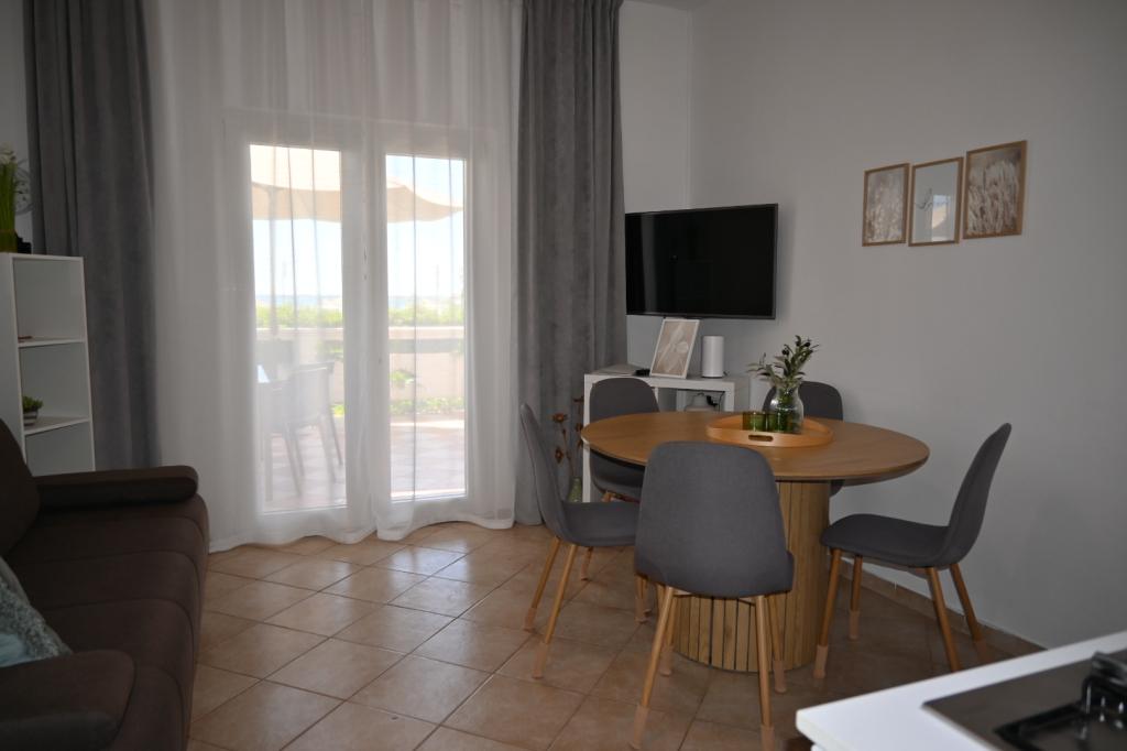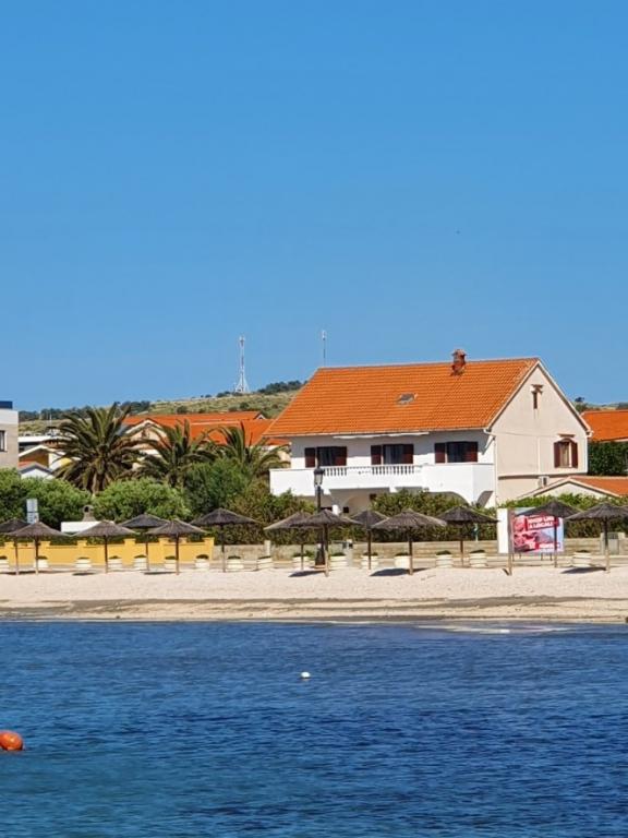 Naši apartmani nalaze se prvi red do mora, u potpunosti su opremljeni. Svaki apartman ima poseban ulaz i terasu s pogledom na more. Idealno je za obitelji s malom djecom zbog blizine mora. Plaža je plitka s pijeskom. Svi naši gosti imaju osigurani besplatan 1 parking u našem dvorištu.