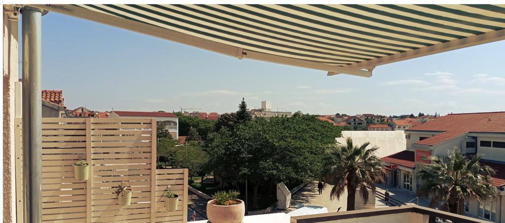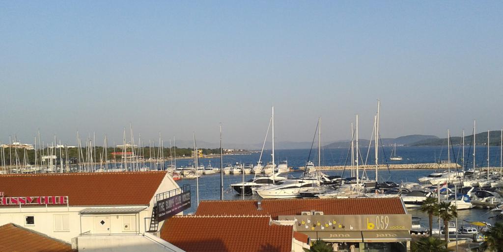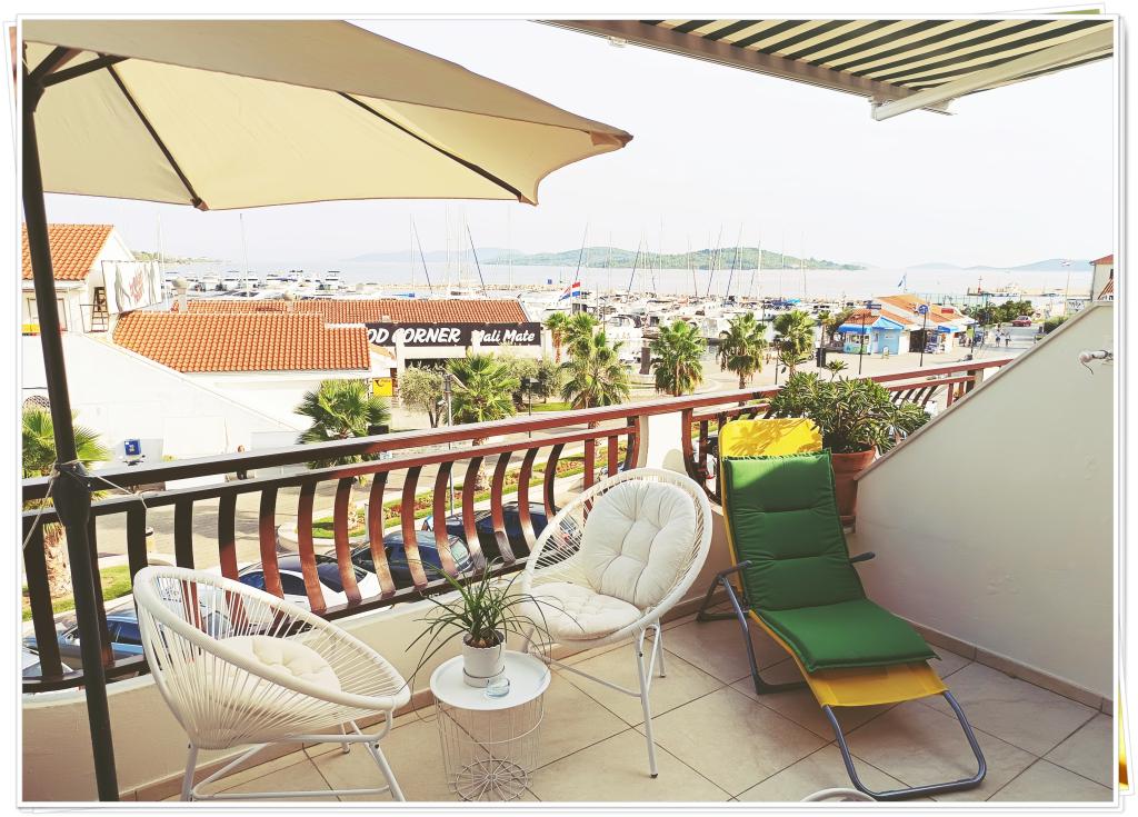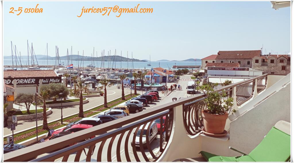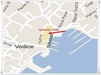 Apartman je u centru Vodica, ima dnevni boravak sa sofom /kanape/, kuhinju, dvije dvokrevetne sobe+ veliki krevet + dječji krevet, dva kupatila s tuš kabinama, dva bojlera, dvije klime, dva stropna ventilatora, terasa s pogledom na more, marinu, park. Potpuno je opremljen za duži boravak ( internet, perilica rublja, perilica suđa, kuhinja, ručnici, fen, pegla). Do zapadne ili istočne plaže ima cca 350 m.