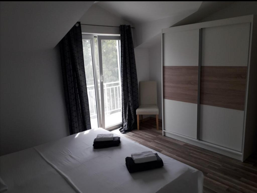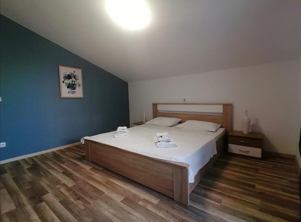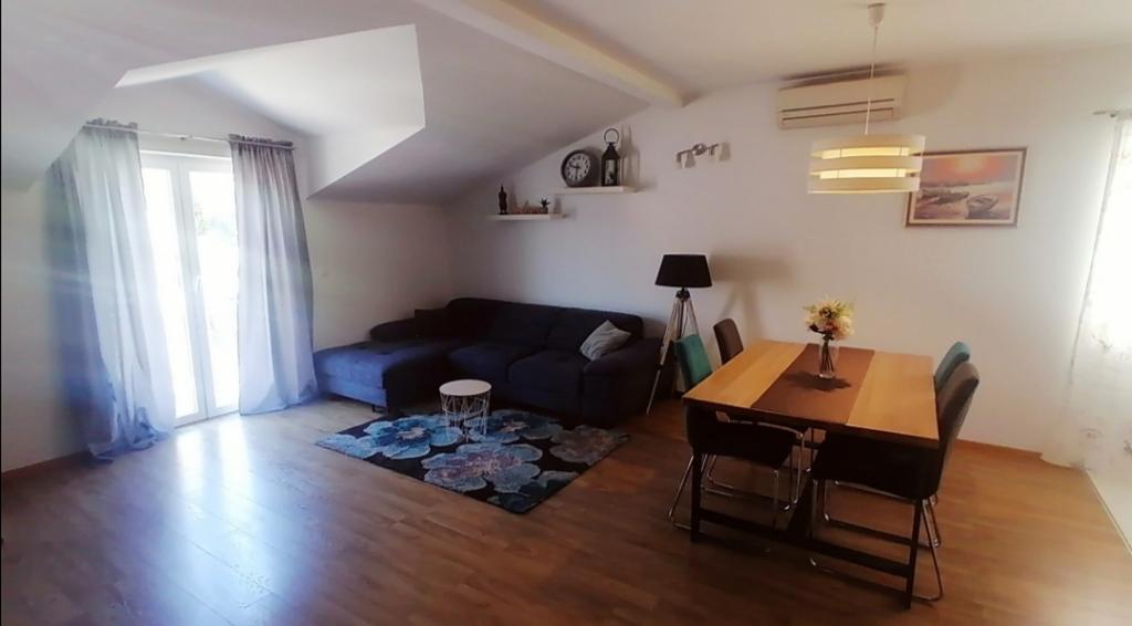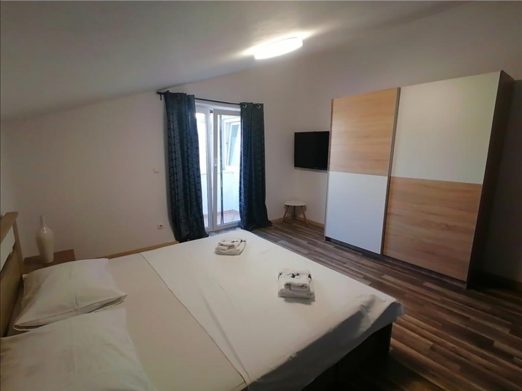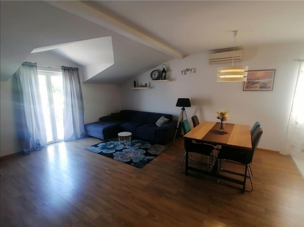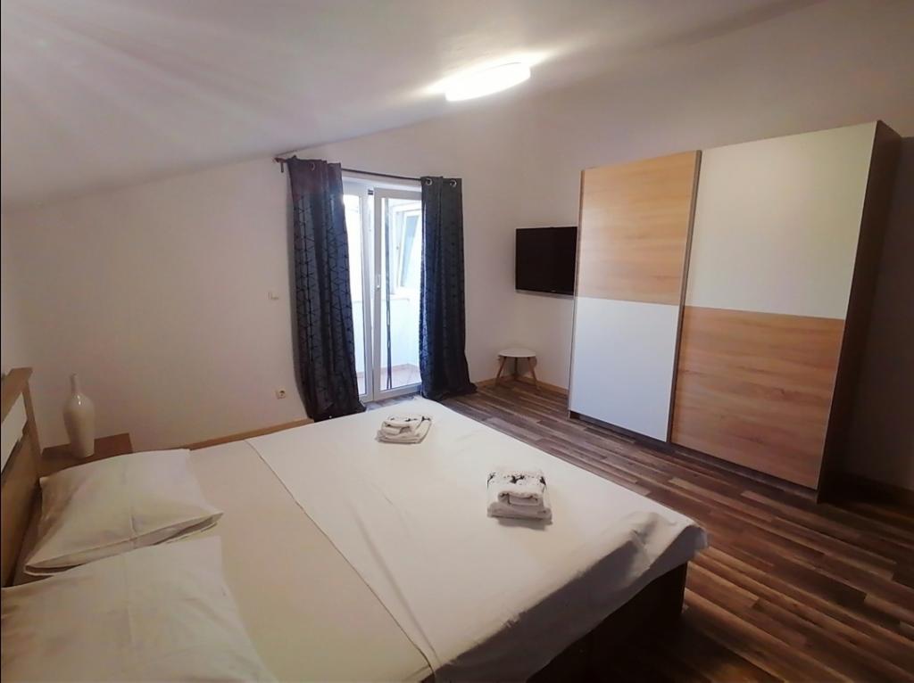 Novi moderan apartman A4 sa dvije spavace sobe bračnim krevetima 180x200 dvije kupaonice te prostran dnevni boravak te moderna kuhinja sa svim aparatima. Dvije su terase. Roštilj za korištenje. Apartman se nalazi od centra 5 min hoda a 10 min od plaže. Nalazi se u mirnoj ulici.