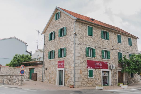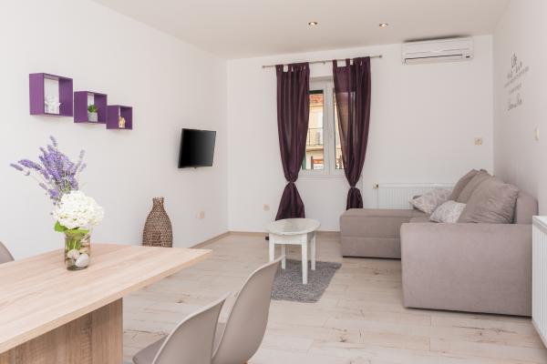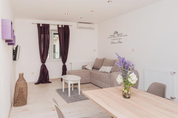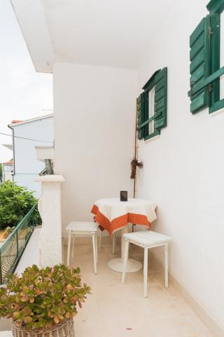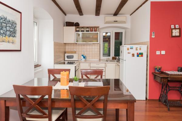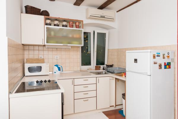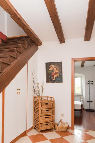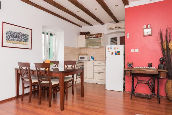 Kompletno opremljen u rustikalnom stilu dalmatinske autohtone kamene kuče, dvoetažni apartman u centru Vodica, 100 m od plaže, s privatnim parkirnim mjestom.