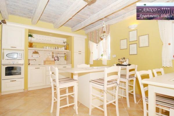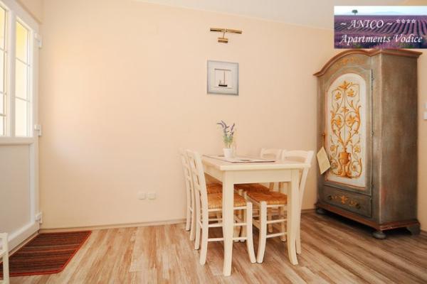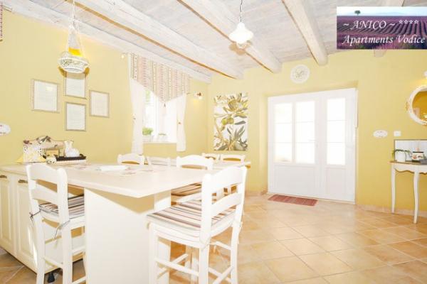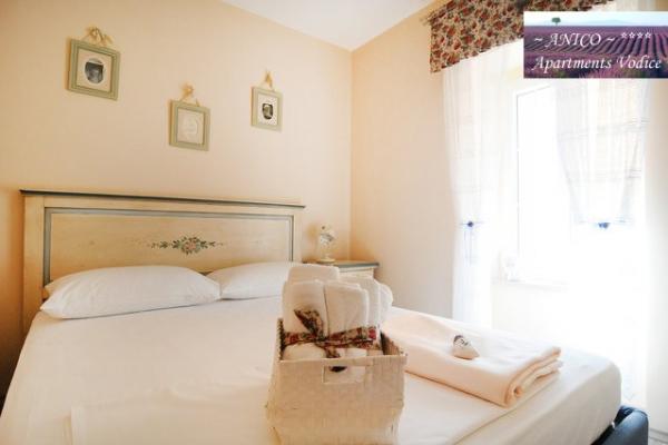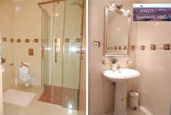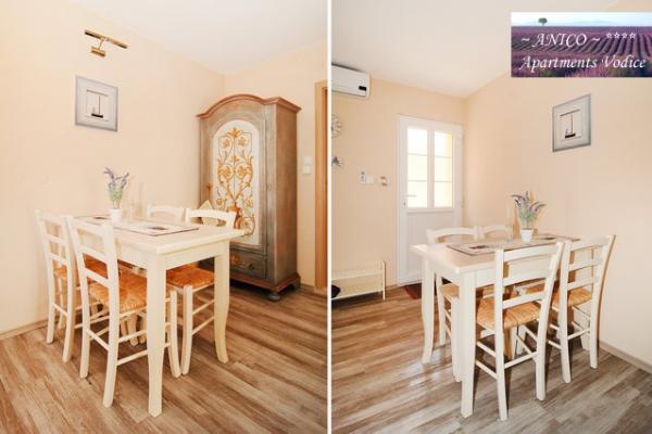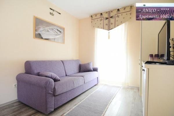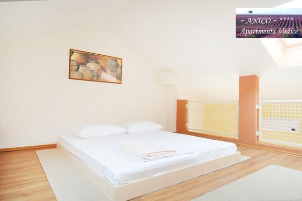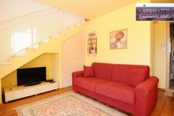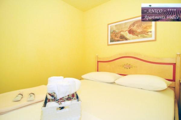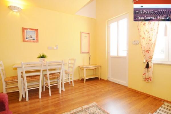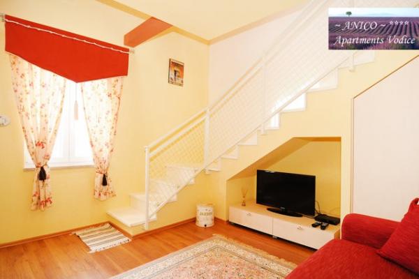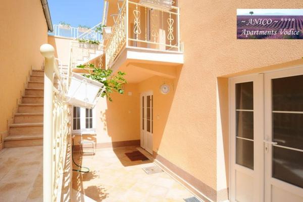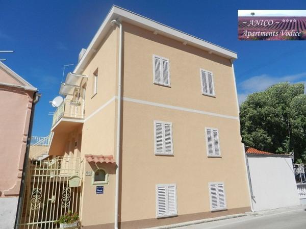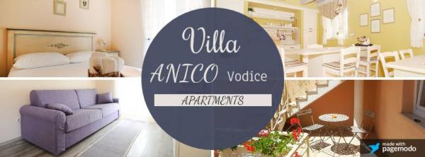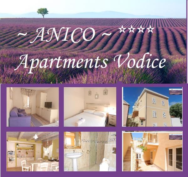 Vila ANICO Apartmani nalaze se u Vodicama, u centra grada, u ulici Žrtava fašizma br. 12 a u neposrednoj blizini hotel Punta. Udaljenost apartmana od plaže iznosi tek 70-ak m, a od rive i glavne šetnice 150m. Najbliži marketi, restorani, pošta i ostalo udaljeno je samo 150m. Apartmanska zgrada sastoji se od tri etaže ima ukupno 5 zasebnih apartmana. Svi apartmani luksuzno su opremljeni: sa klima uredjajem za krijanje - hladjenje, podno grijanje, Pvc stolarija, podovi obloženi parketom, keramikom. svi apartmani imaju TV, Sat program, radio uredjaj, caffe aparat te mini bar. Nasuprot objekta nalazi se parkirni prosotr za osobna vozila osigurana za svakog gosta. Cijena apartaman u sezoni iznosi 75 €/ - 95 €/noć.