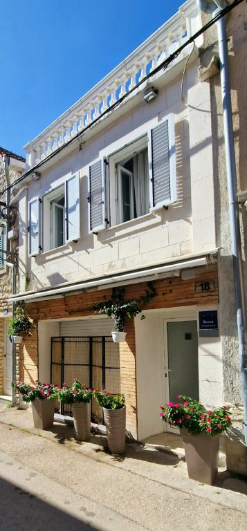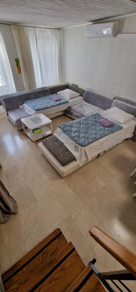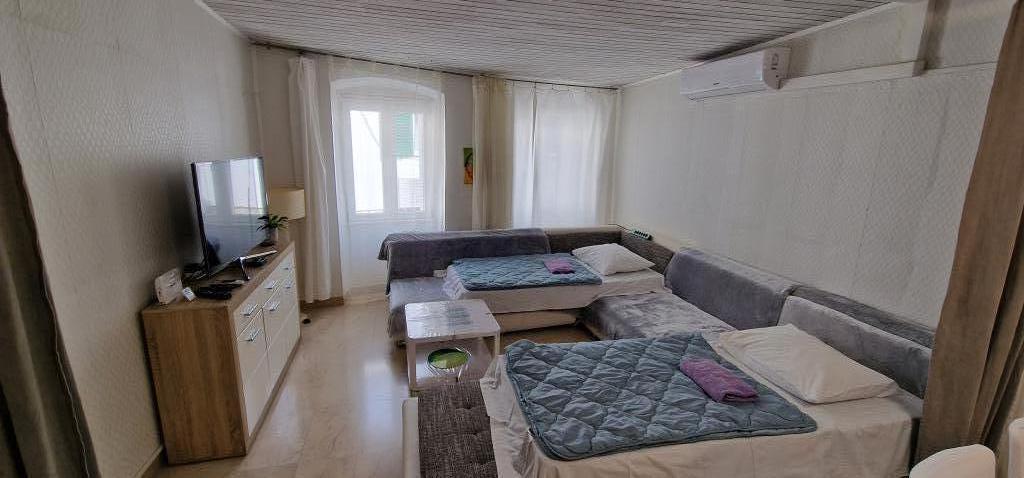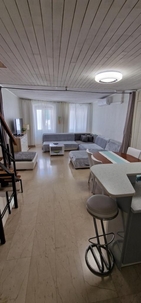 Apartmani u centru 40 m do rive i trajektne luke. Odmah je bkizu plaža. Kuća je na dvije etaže 100m2. - Studio apartman 45m2 za 2 osobe, dnevni boravak, kuhinja, kupatilo wc - Apartman 75m2, 1 dvokrevetna soba sa terasom, dnevni boravak za 2 osobe, kupatilo wc, kuhinja. - Apartman 100m2, 1 dvokrevetna soba sa terasom, 2 jednokrevetne sobe, dnevni boravak za 2 osobe, 2 kauca sa madracom, kuhinja, kupatilo wc Cijela je kuća klimatizirana i ima flet internet sa velikom lcd televizijom. Parking je blizu.