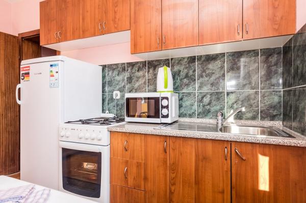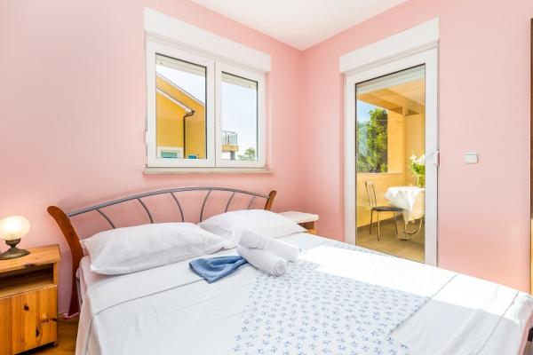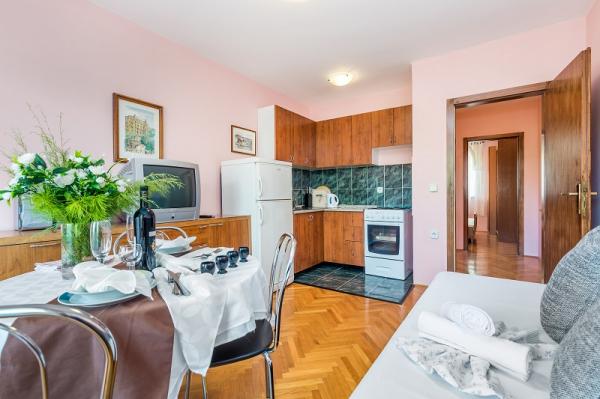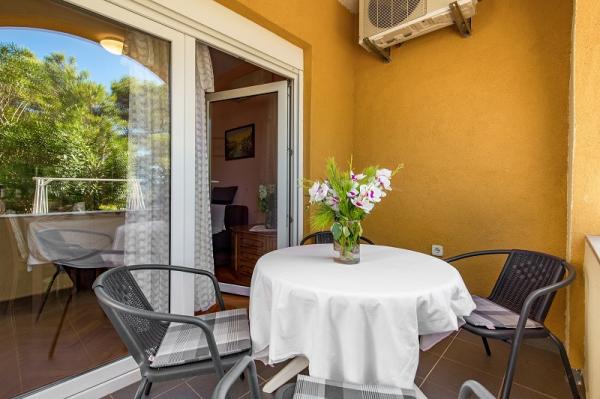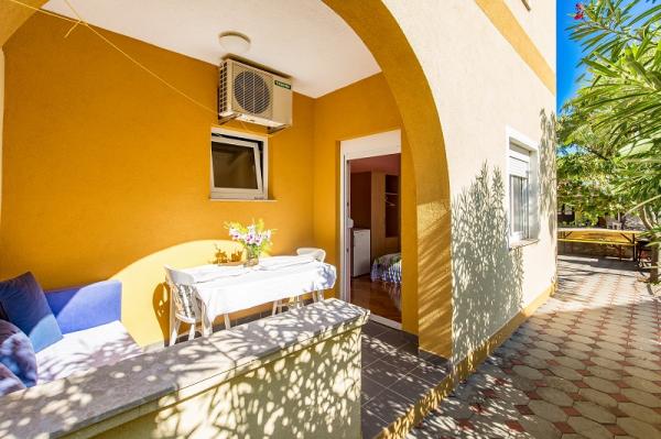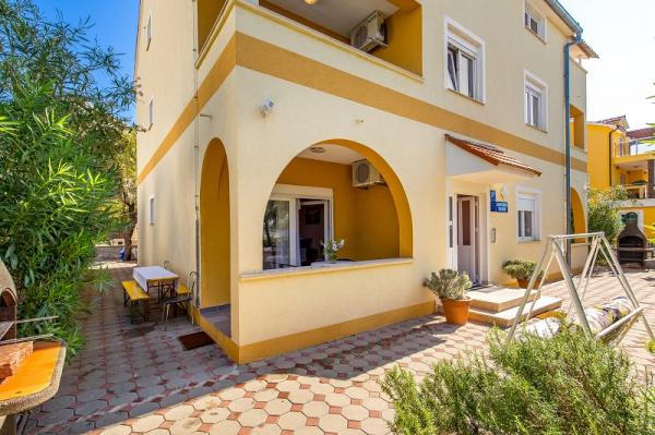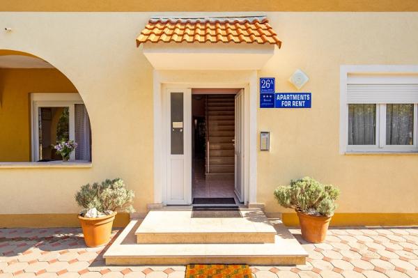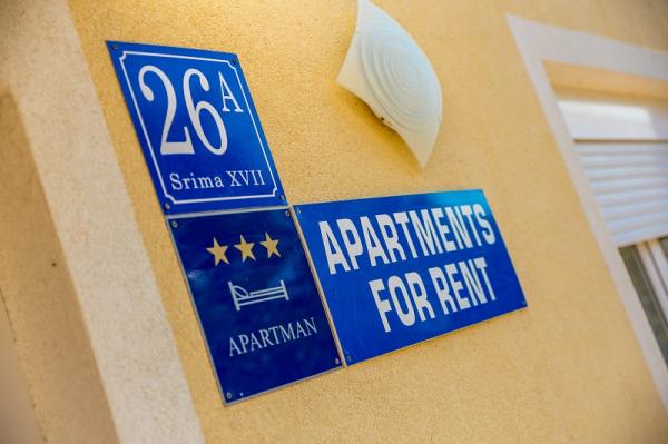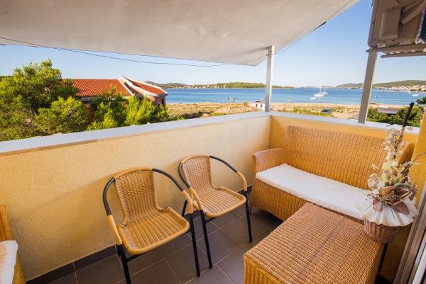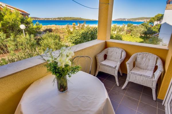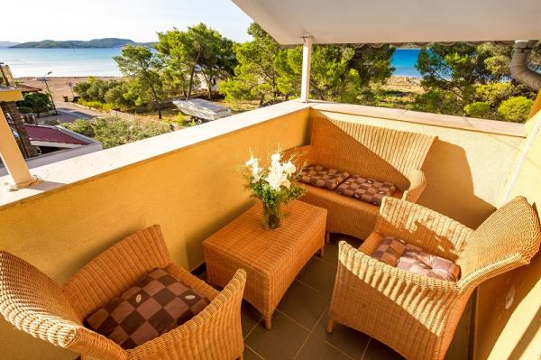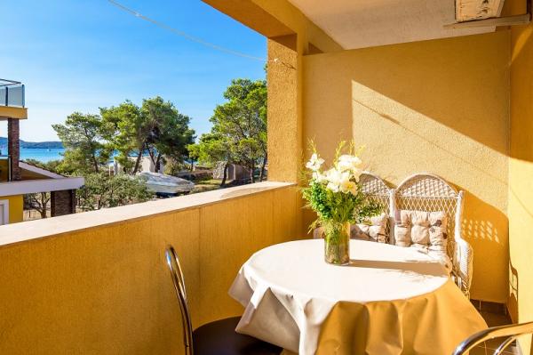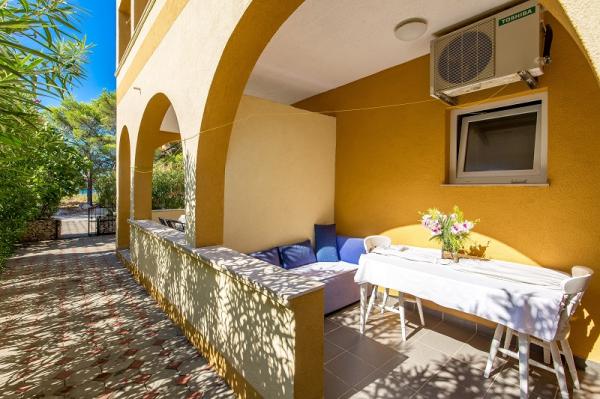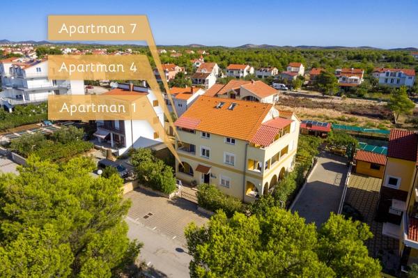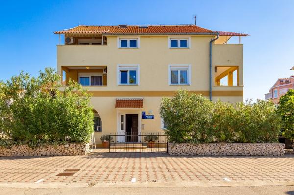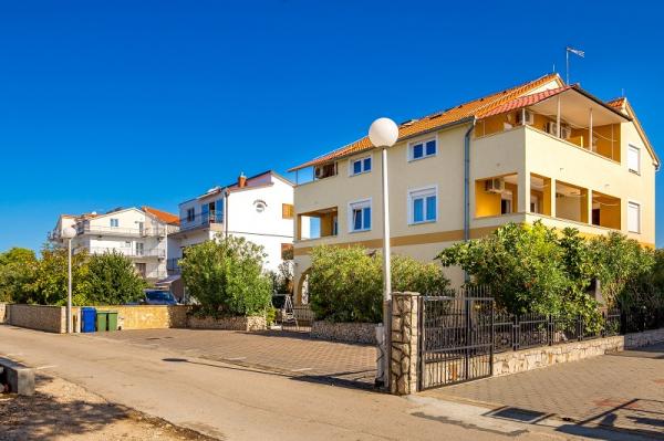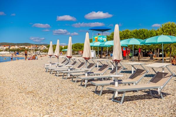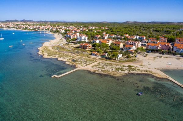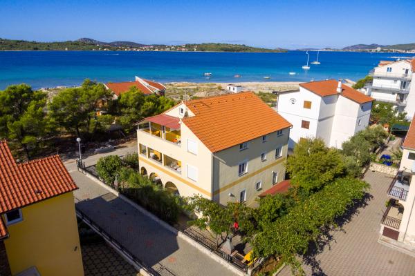 tri zvjezdice, prvi red do mora (50m do pješčane plaže), dvosobni i trosobni apartmani, potpuno namješteni (klima, tv, internet WiFi). Svaki apartman ima kuhinju, kupaonicu i balkon s pogledom na more. Na raspolaganju vam je i vanjski roštilj.
