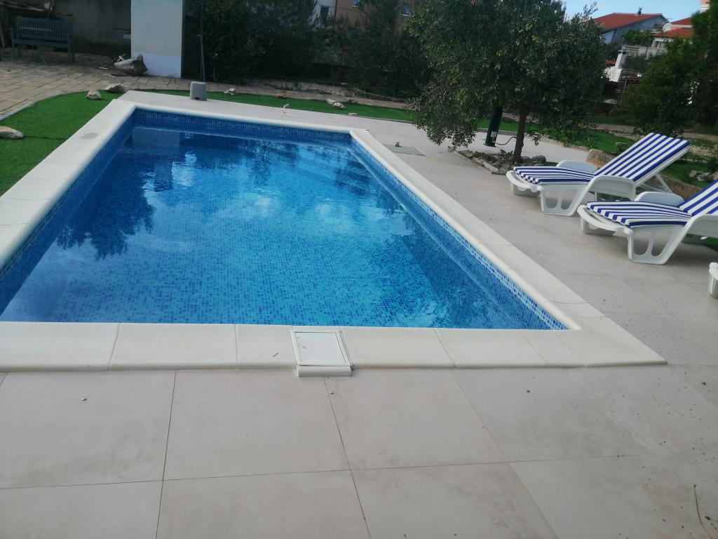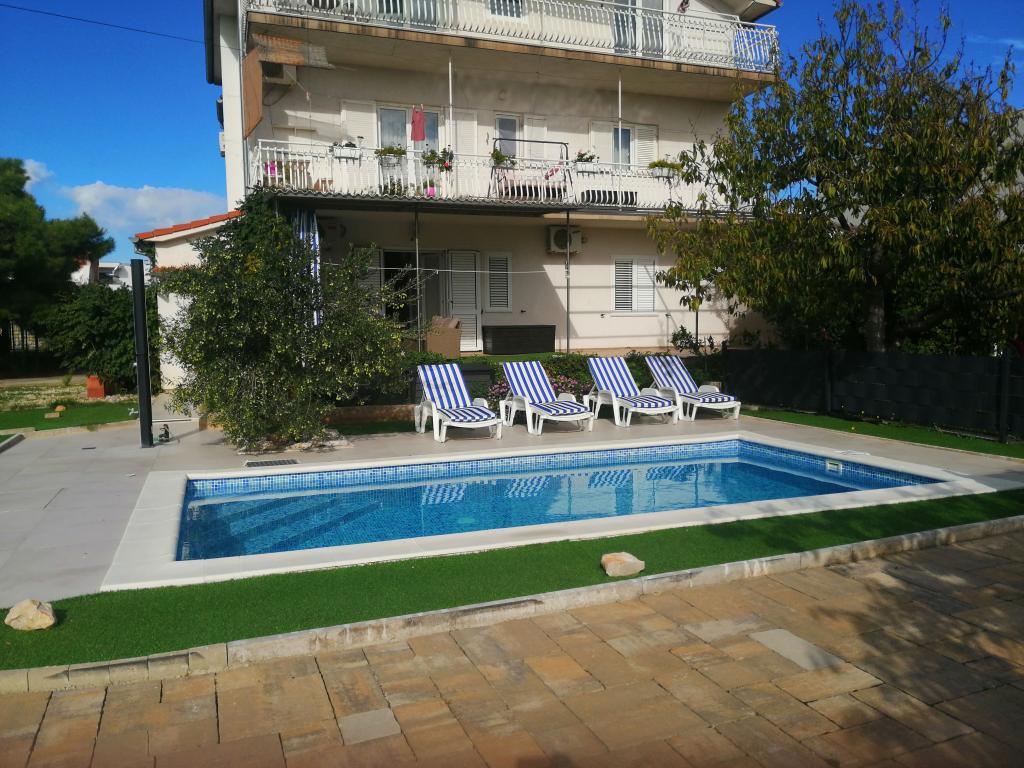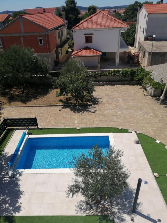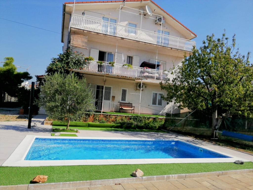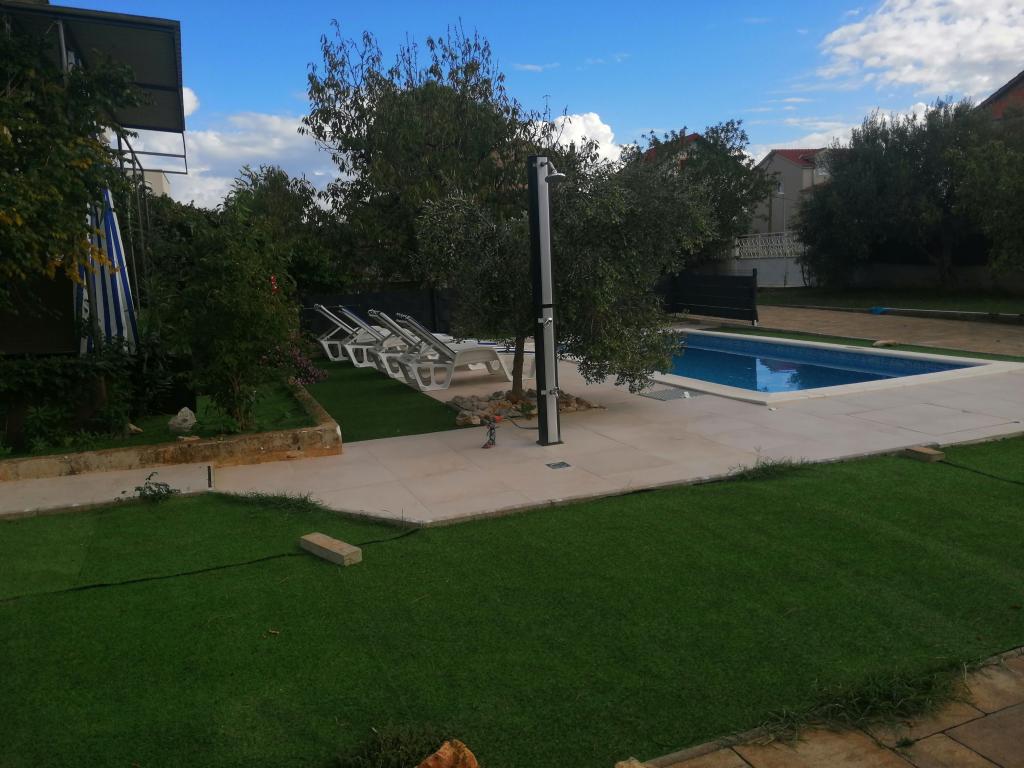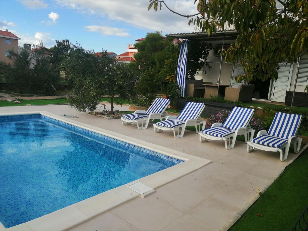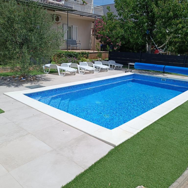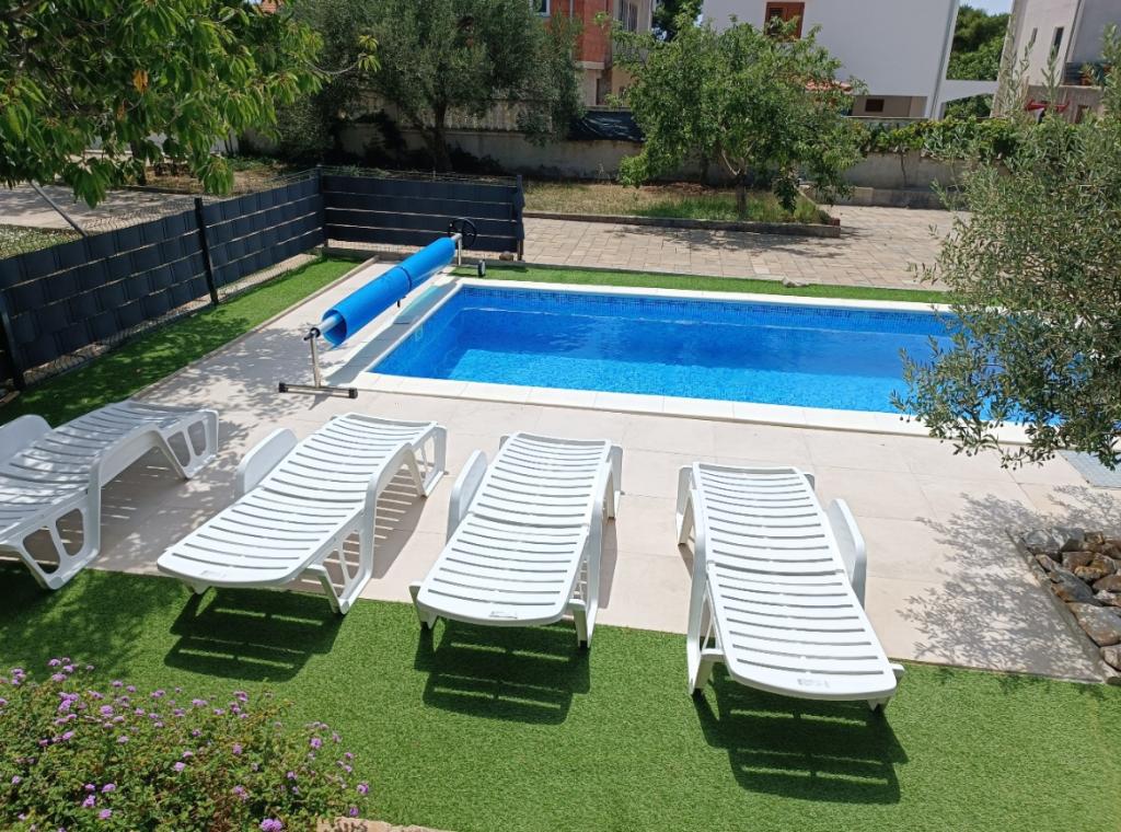 Novouređeni veliki apartmani s vanjskim BAZENOM SAMO ZA VAS!! KAO KUĆA ZA ODMOR!! Kompletno NOVOUREĐENE kuhinje s novim aparatima (frižider,zamrzavač,pećnica ,ploča za kuhanje,mikrovalna pećnica,kuhalo za vodu, perilica posuđa, perilica rublja, napa.Posuđe i pribor za kuhanje. Dnevna soba sa kutnom garniturom koja se po potrebi razvlači u prostrani ležaj.Novi TV sa satelitskim programom. Spavaće sobe s prostranim bračnim krevetima. Posteljina. Sve sobe su klimatizirane. Dvije kupaonice sa WC i walk in tuševima novouređene. Perilica rublja, pribor za peglanje, sušilo za kosu. Usisivač i sredstva za čišćenje,toaletni papir, sapun,ručnici. Na raspolaganju je i terasa od 30 m 2 sa vrtnim namještajem, kao i gril,ležaljke uz bazen. Ogromna okućnica 1300 m 2 sa puno mediteranskog drveća. Parking u dvorištu BESPLATNO!!. Aerodrom Zadar i Split udaljene su oko 60 km . Blizina na nac.park-Krka i Kornati