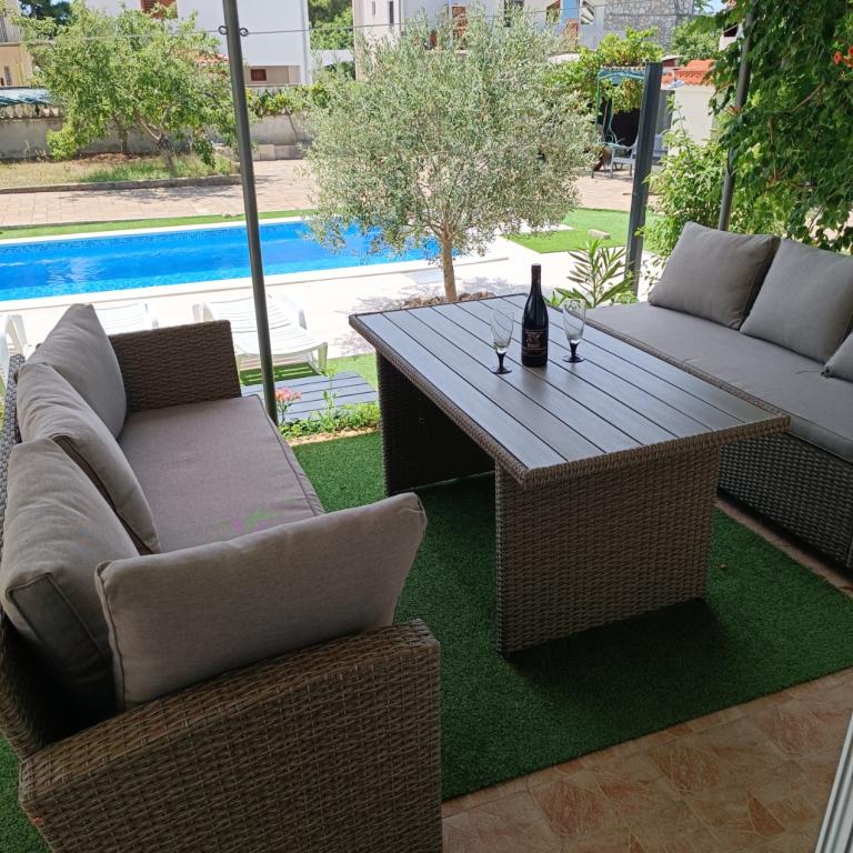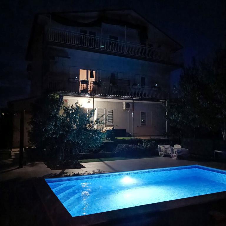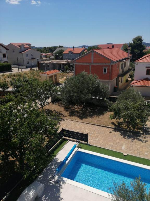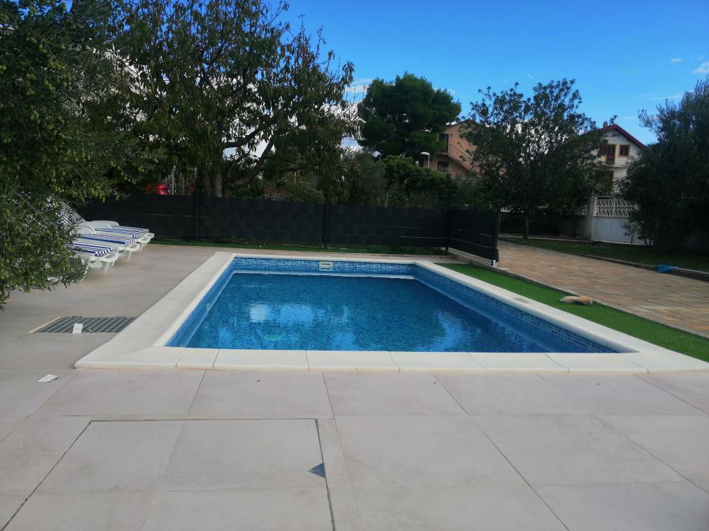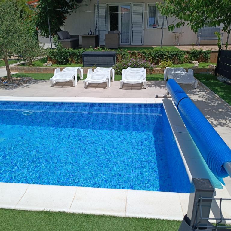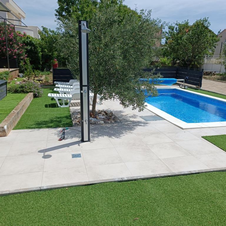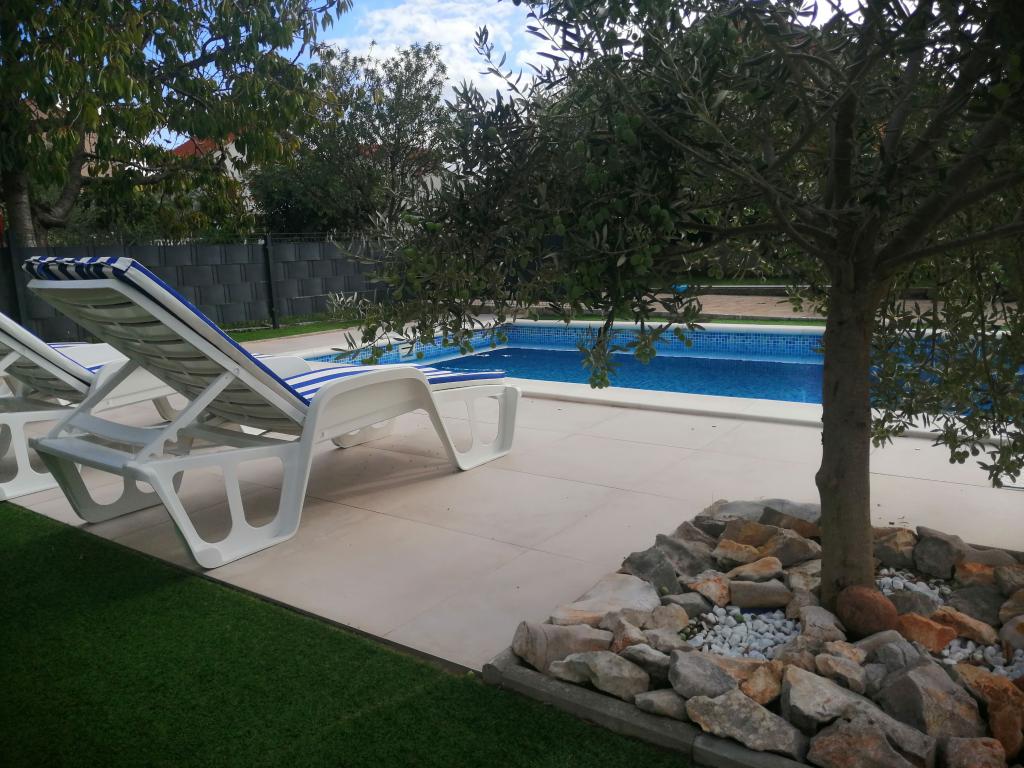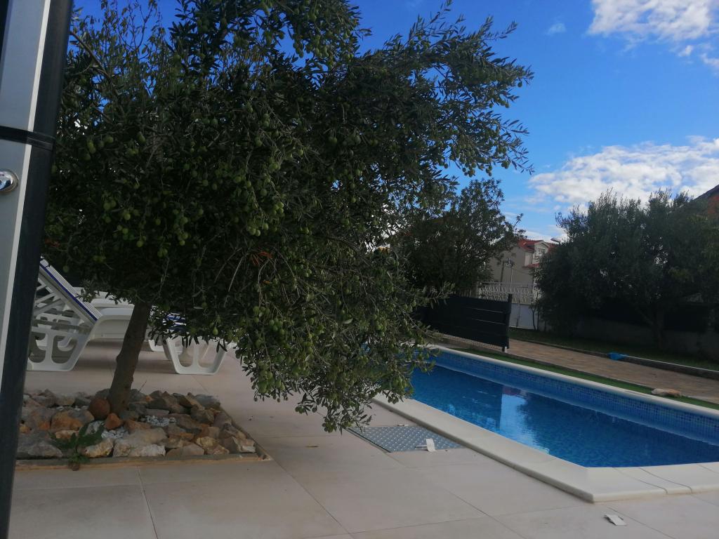 Novouređeni veliki apartmani s vanjskim BAZENOM SAMO ZA VAS!! KAO KUĆA ZA ODMOR!! Kompletno NOVOUREĐENE kuhinje s novim aparatima (frižider,zamrzavač,pećnica ,ploča za kuhanje,mikrovalna pećnica,kuhalo za vodu, perilica posuđa, perilica rublja, napa.Posuđe i pribor za kuhanje. Dnevna soba sa kutnom garniturom koja se po potrebi razvlači u prostrani ležaj.Novi TV sa satelitskim programom. Spavaće sobe s prostranim bračnim krevetima. Posteljina. Sve sobe su klimatizirane. Dvije kupaonice sa WC i walk in tuševima novouređene. Perilica rublja, pribor za peglanje, sušilo za kosu. Usisivač i sredstva za čišćenje,toaletni papir, sapun,ručnici. Na raspolaganju je i terasa od 30 m 2 sa vrtnim namještajem, kao i gril,ležaljke uz bazen. Ogromna okućnica 1300 m 2 sa puno mediteranskog drveća. Parking u dvorištu BESPLATNO!!. Aerodrom Zadar i Split udaljene su oko 60 km . Blizina na nac.park-Krka i Kornati