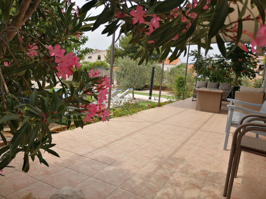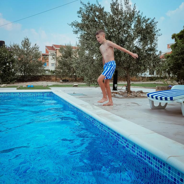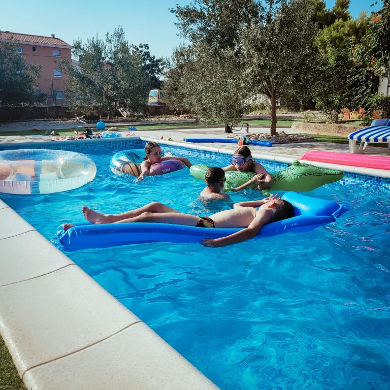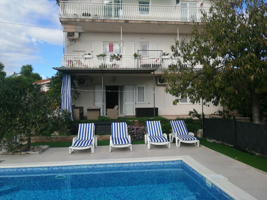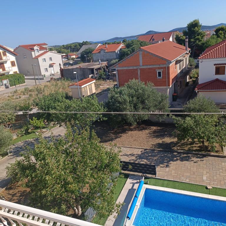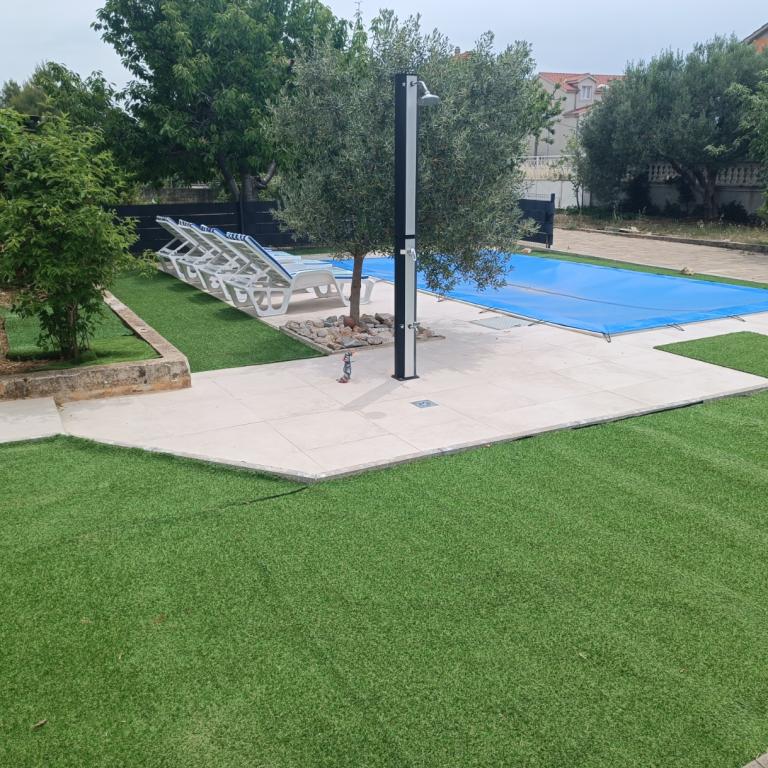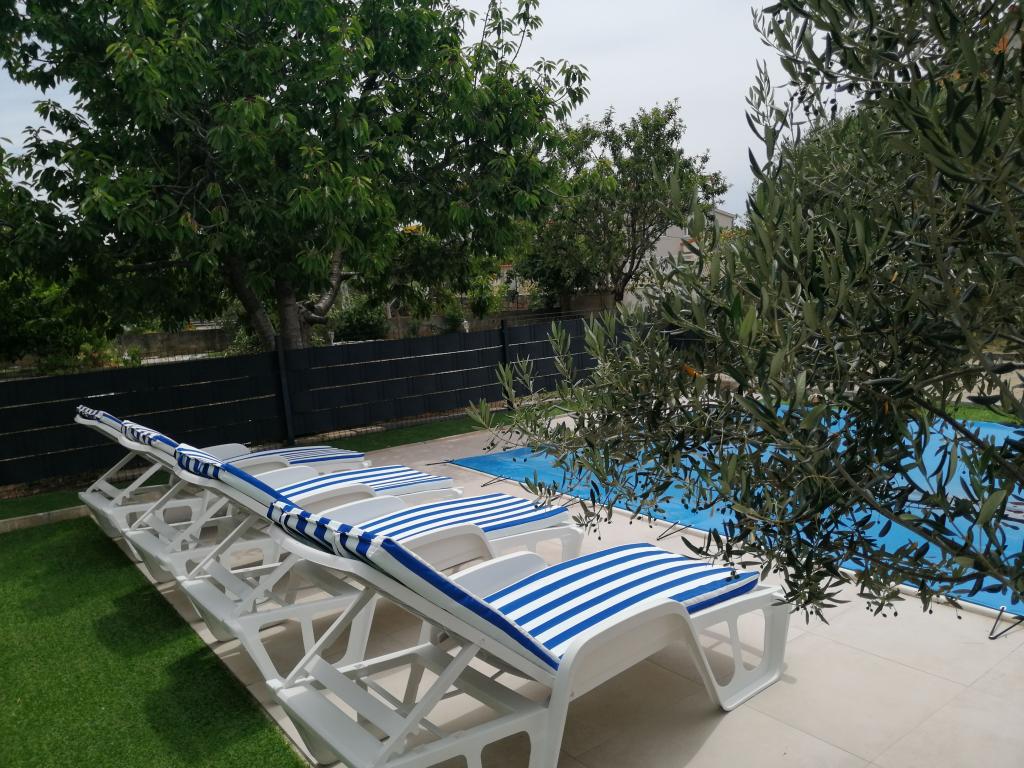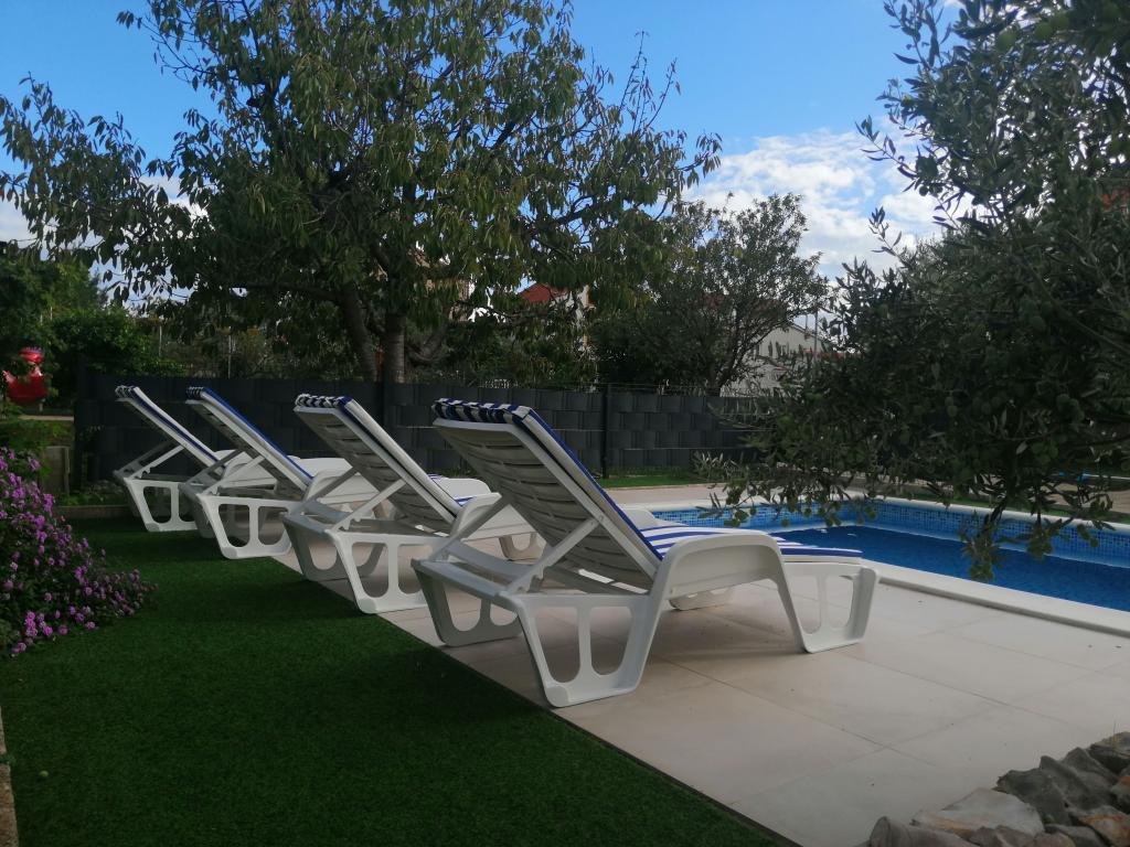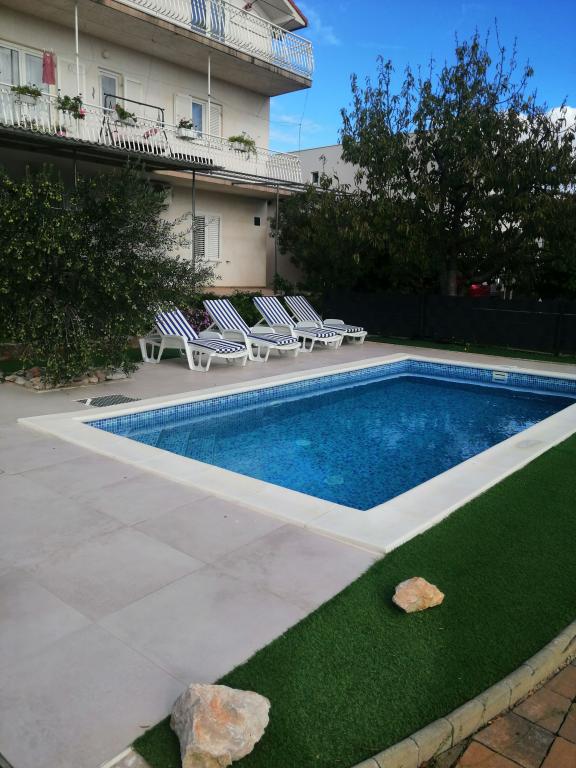 Novouređeni veliki apartmani s vanjskim BAZENOM SAMO ZA VAS!! KAO KUĆA ZA ODMOR!! Kompletno NOVOUREĐENE kuhinje s novim aparatima (frižider,zamrzavač,pećnica ,ploča za kuhanje,mikrovalna pećnica,kuhalo za vodu, perilica posuđa, perilica rublja, napa.Posuđe i pribor za kuhanje. Dnevna soba sa kutnom garniturom koja se po potrebi razvlači u prostrani ležaj.Novi TV sa satelitskim programom. Spavaće sobe s prostranim bračnim krevetima. Posteljina. Sve sobe su klimatizirane. Dvije kupaonice sa WC i walk in tuševima novouređene. Perilica rublja, pribor za peglanje, sušilo za kosu. Usisivač i sredstva za čišćenje,toaletni papir, sapun,ručnici. Na raspolaganju je i terasa od 30 m 2 sa vrtnim namještajem, kao i gril,ležaljke uz bazen. Ogromna okućnica 1300 m 2 sa puno mediteranskog drveća. Parking u dvorištu BESPLATNO!!. Aerodrom Zadar i Split udaljene su oko 60 km . Blizina na nac.park-Krka i Kornati