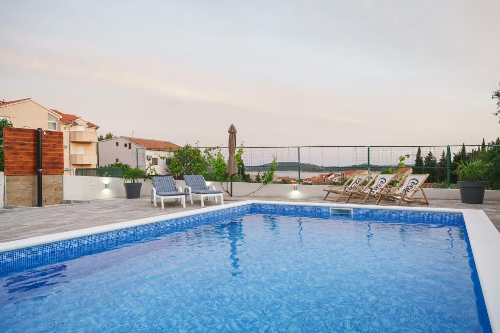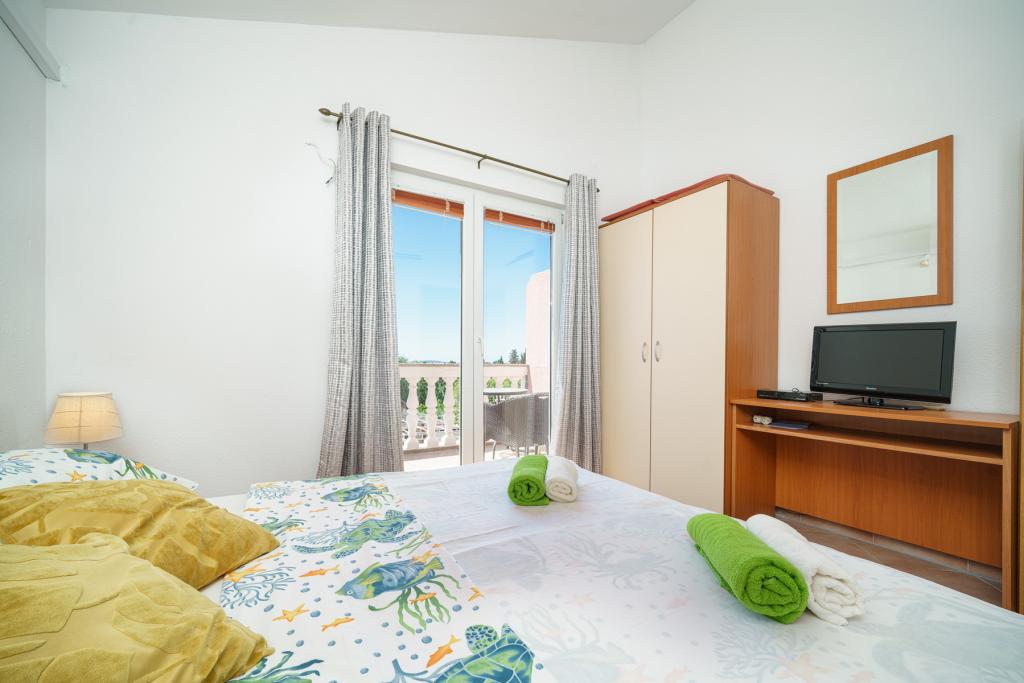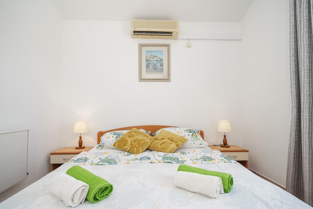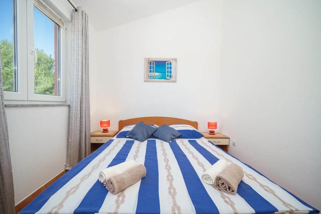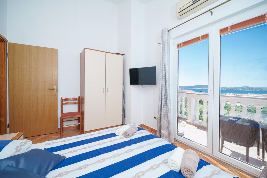 Kompletno i suvremeno opremljeni apartmani smješteni u mirnom predjelu Vodica. Površina svakog apartmana je 50 m2, svaki se sastoji od dvije spavače sobe, kuhinje sa blagovaonicom i terase sa pogledom na more. Kapacitet je maksimalno 5 osoba. Apartmani su opremljeni sa internetom, tv/sat i klima uređajem. Natkriveni parking se nalazi ispred kuće.