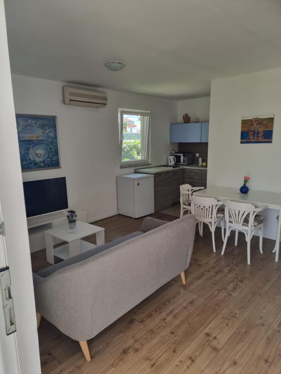 Turistička pristojba je uključena u cijenu.Prije svega ljubazni i susretljivi domaćini, izuzetno čisto i uredno. Iz apartmana se izlazi na 3 terase tako da se u svakom trenutku može boraviti vani u hladovini. Unutrašnjost još ljepša nego na slikama-TV veći, nova garnitura...dvorište puno zelenila s 2 velike smokve koje su na korištenje
