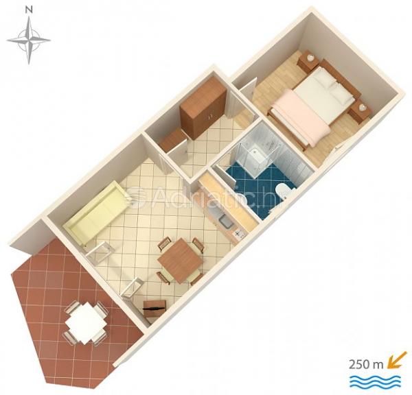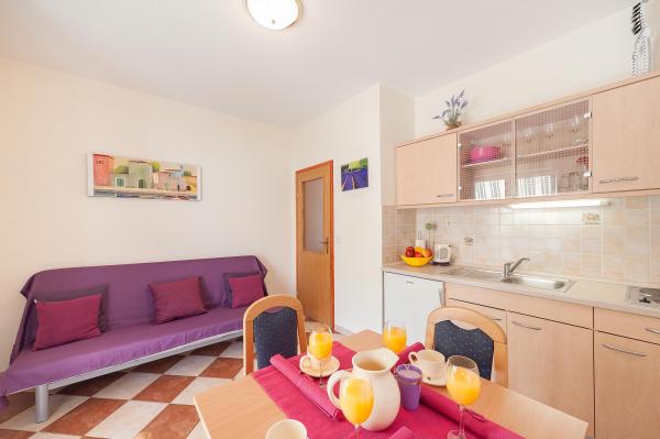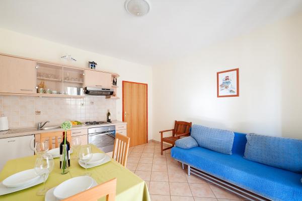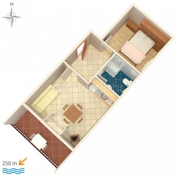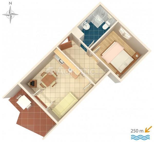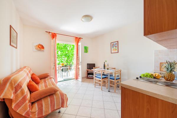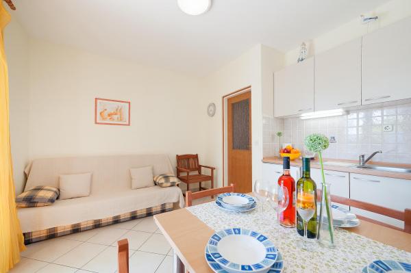 Jedini plus smještaja je udaljenost plaže; cca 200metara Što se apartmana tiče opremljenost je ispod svake razine, namještaj je dotrajao, pomoćni ležaj je doslovno raspadnut i temelji se na truloj spužvi s tri letvice.... Čistoća je prosječna-dočekala nas je paučina, mrvice u ladicama, mrljav rasparani beštek... Domaćini nas nisu dočekali zbog zauzetosti ali nisu niti u jednom trenutku bar nazvali i pitali je li sve uredu Očekivali smo puno puno vise s obzirom na komunikaciju prije dolaska, a na kraju smo ostali razočarani.