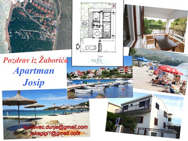 Apartman JOSIP 7, nalazi se u Žaboriću, Ulica Jasenova 99. Apartman JOSIP 7, ima 3 zvjezdice i registriran je za 2-7 osoba u 1 apartmanu. Apartman JOSIP 7 nalazi se 50 m udaljen od mora i 1km od centra mjesta. Apartman se nalazi na katu. Sastoji se od 3 spavaće sobe, kuhinje sa blagovaonom, kupaonom sa WC-om, balkonom i natkritom terasom. Apartman ima hladnjak, električni štednjak, posuđe, TV satelit, klima uređaj, grill. Na prozorima nalaze se mreže protiv komaraca. Parkiranje je u dvorištu. 50 m od apartmana nalazi se krasan Restoran Veranda. Cijenu dogovarate direktno sa vlasnikom. Cijena ovisi o broju gostiju koji žele iznajmiti apartman i ovisi da li je predsezona, sezona ili podsezona. Miran odmor, u bogatstvu borove šume i maslinika, lijepih prirodnih pješčanih i šljunćanih plaža, čistog mora, arhipelaga prepunog skrovitih uvala, te dobre povezanosti sa Šibenikom, čine ovo mjesto omiljenom turističkom destinacijom.