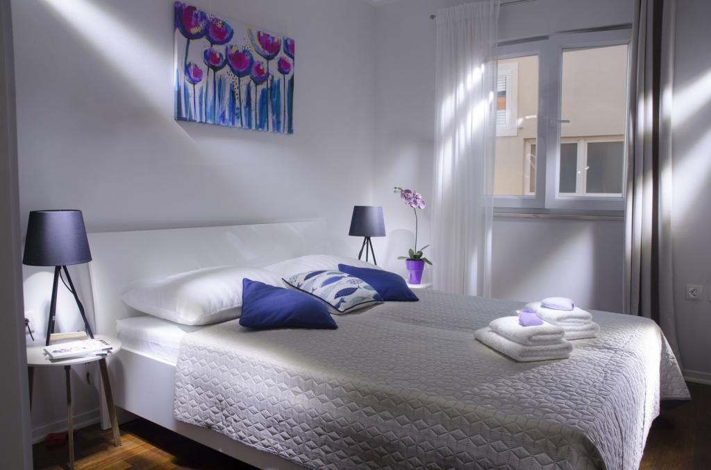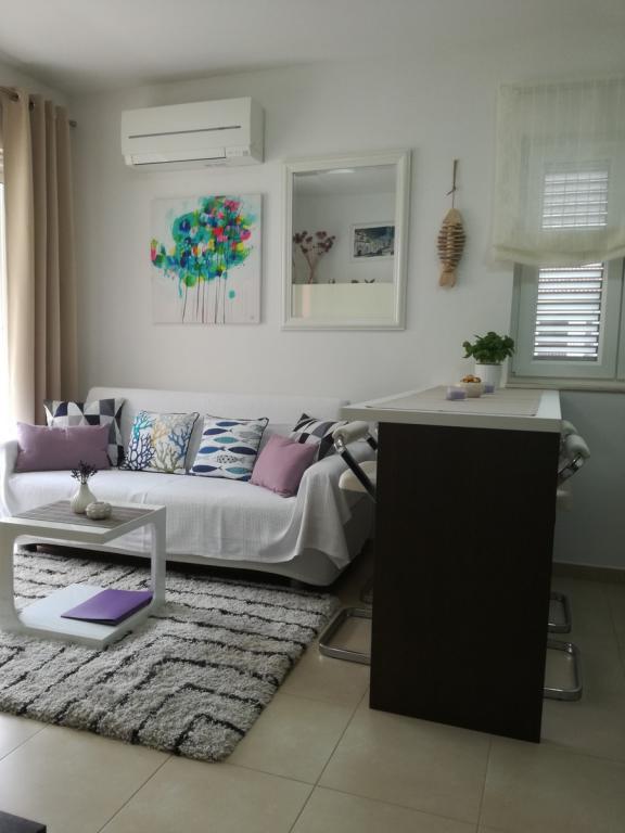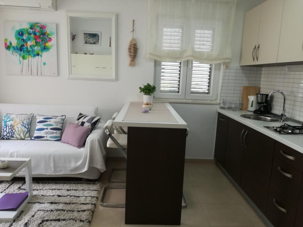 Godinama ljetujemo po Jadranu, ali nikad još nismo bili ovako ugodno smješteni kao u ovom apartmanu. Osjećali smo se opušteno kao u svojoj kući, a opet cijenjeno jer smo za svoj novac dobili apsolutnu vrijednost. Slike koje vidite u oglasu su lijepe, ali ne mogu dočarati ugodu koju osjećate u samom prostoru. Od ulaza u apartman sve miriše na svježinu i čistoću. Apsolutno svaka stvar u apartmanu je funkcionalna, lijepa i na svojem mjestu. Obuzima vas osjećaj da je vlasnicima apartmana doista stalo kako se gosti tu osjećaju te su apartman uređivali kao da će oni biti gosti vlastitog apartmana. Mirjana i Goran, nasmijani i srdačni vlasnici, dočekali su nas toplo, pokazali nam i uputili nas gdje se što nalazi i ostavili nas da u miru provedemo svoj odmor. Oni su smješteni u blizini i uvijek su dostupni ako vam nešto zatreba, ali nenametljivi su i poštuju vaš mir. Prvi puta u životu nisam trčala u trgovinu jer vas apsolutno sve dočeka u apartmanu - od sredstava za pranje, novih krpica, omekšivača, ručnika, deka, sredstava protiv komaraca, svi kućanski aparati (perilica suđa, perilica rublja, pećnica, mikrovalna pećnica, aparat za kavu s kapsulama u 3 vrste, blender, usisivač, veliki tv s mnoštvom programa, radio, Ps4, klima...), posuđa duplo nego je potrebno... Čak vam se nude i posude za spremanje hrane, folije za hranu, vrećice za pečenje... Vjerujem da ni doma, u svojoj kući nemate sve od navedenog baš uvijek :) I sve mirišljavo i čisto! Također, svi su aparati kvalitetnih i provjerenih proizvođača tako da sam si neke čak i zapisala jer ni doma nisam u potpunosti zadovoljna nekima koje posjedujem. Alergična sam na zagorjele tave, lonce i tupe noževe, ali u Lavandi je sve kao novo, kao da je sad stiglo iz trgovine. U hladnjaku nas je dočekao narezak pršuta i sira s maslinama, dvije boce vina, sok, ohlađena lubenica, na stolu bombonijere. Svi su prozori opremljeni komarnicima, roletama i unutarnjim sjenilima. Svi su zidovi ukusno i moderno ukrašeni umjetničkim slikama. Apartman nije velik, ali je vrlo funkcionalan i pruža intimu unutar samog apartmana jer ima 2 spavače sobe, kao i od susjeda koje nemate gdje susresti, osim na ulazu u zgradu. Apartman djeluje prozračno jer prevladavaju bijela i zemljane boje te, iako je lijepo dekoriran, nimalo nije natrpan. Terasa je nadsvođena stropom i zidom zatvorena s jedne strane, dok su dvije strane zaštićene od eventualne vrućine pomičnim tendama