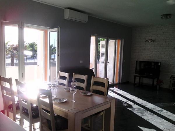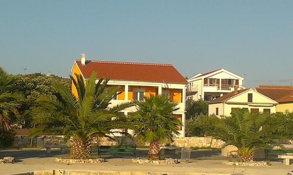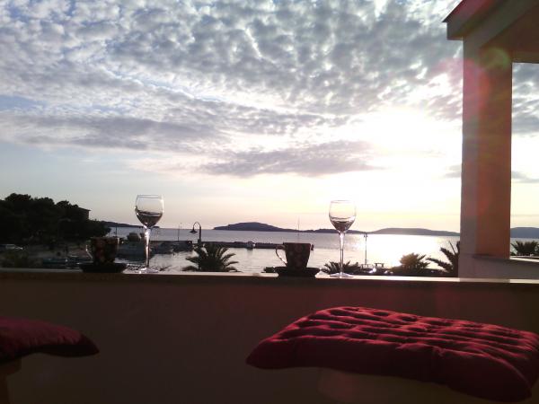 apartmani se nalaze u centru mjesta, prvi red do mora, 20 m od najpopularnije plaže u mjestu . pješčana plaža je udaljena 200 m. košarkaško igralište i staza za balote su udaljeni 100 m , dok je igralište za odbojku na pijesku udaljeno 200 m , nogometni teren 500 m , dječje igralište 10 m. odlična trim staza i staza za vožnju bicikla je udaljena 5 minuta hoda. najbliža picerija je udaljena 20 m , a restoran 200 metara . Apartmani su suvremeni i luksuzno uređeni. apartman ima 2 sobe, 2 kupatila (jedno se nalazi unutar sobe i posjeduje tuš kabinu , a drugo hidro masažnu kadu ). svaki apartman je opremljen velikom kuhinjom sa šankom, perilicom suđa velikim frižiderom i ledenicom .objekt ima 2 balkona sa odličnim pogledom na arhipelag. ima 3D televizore ,satelitsku antenu , pristup internetu, klima uređaje. zgrada ima veliku okućnicu s 6 parkirnih mjesta, vanjski tuš, vanjski stol i uređeno mjesto za boravak u dvorištu, kameni vanjski kamin.