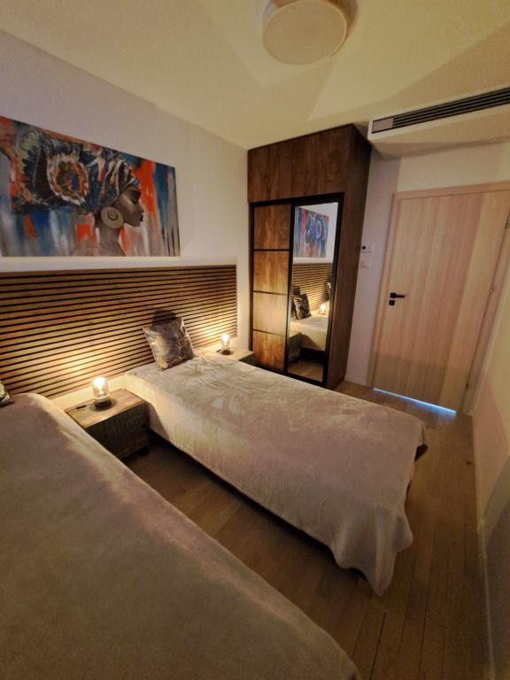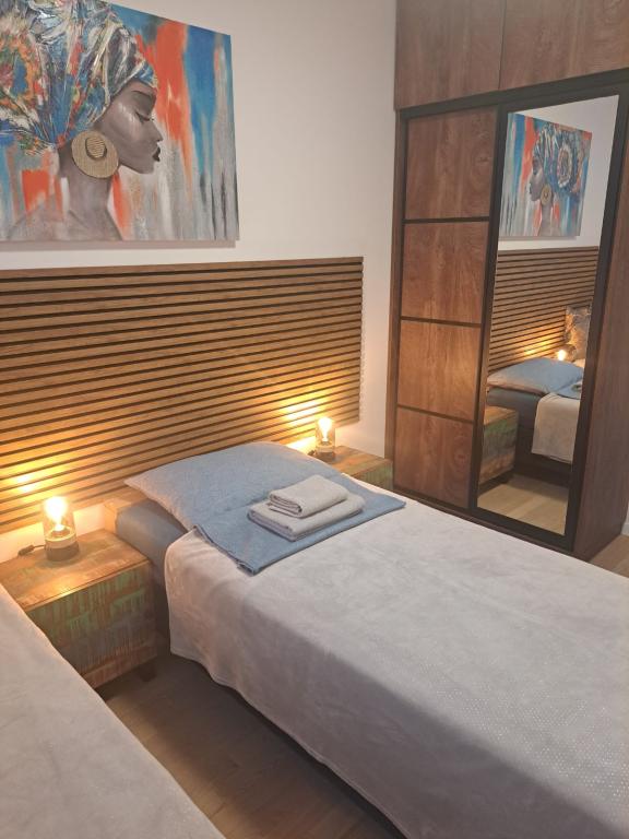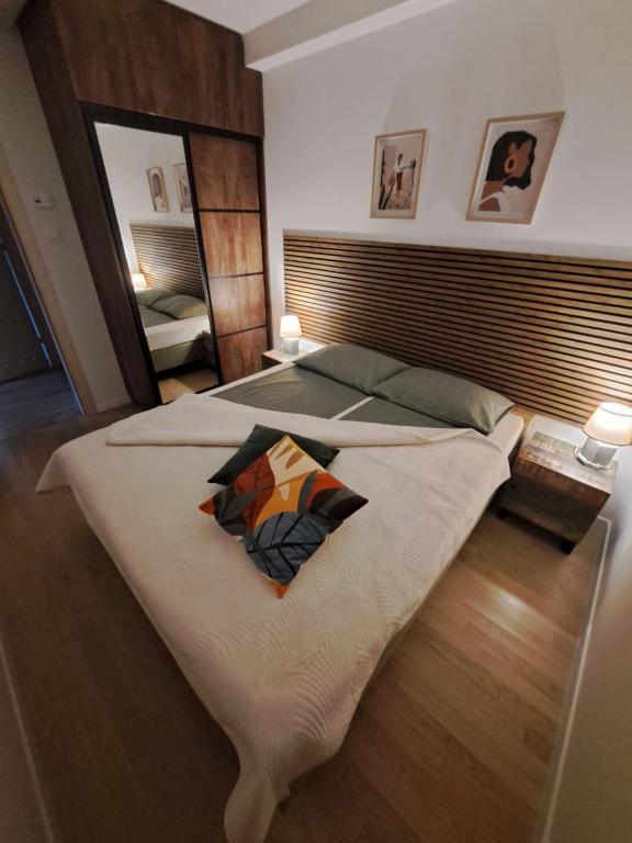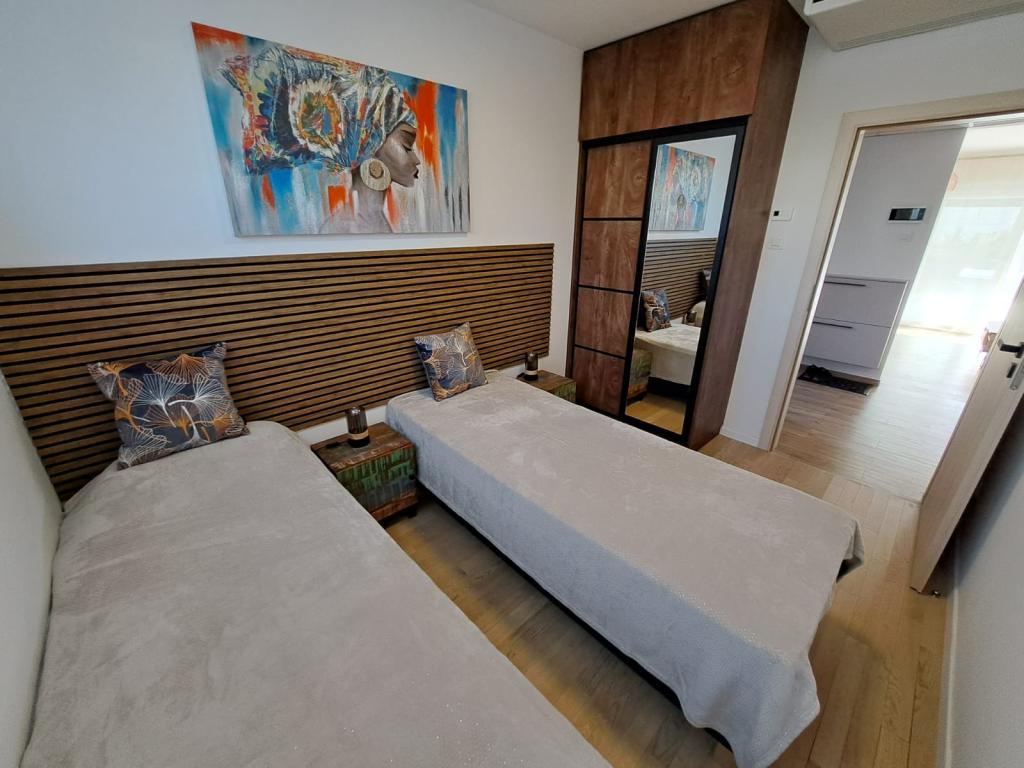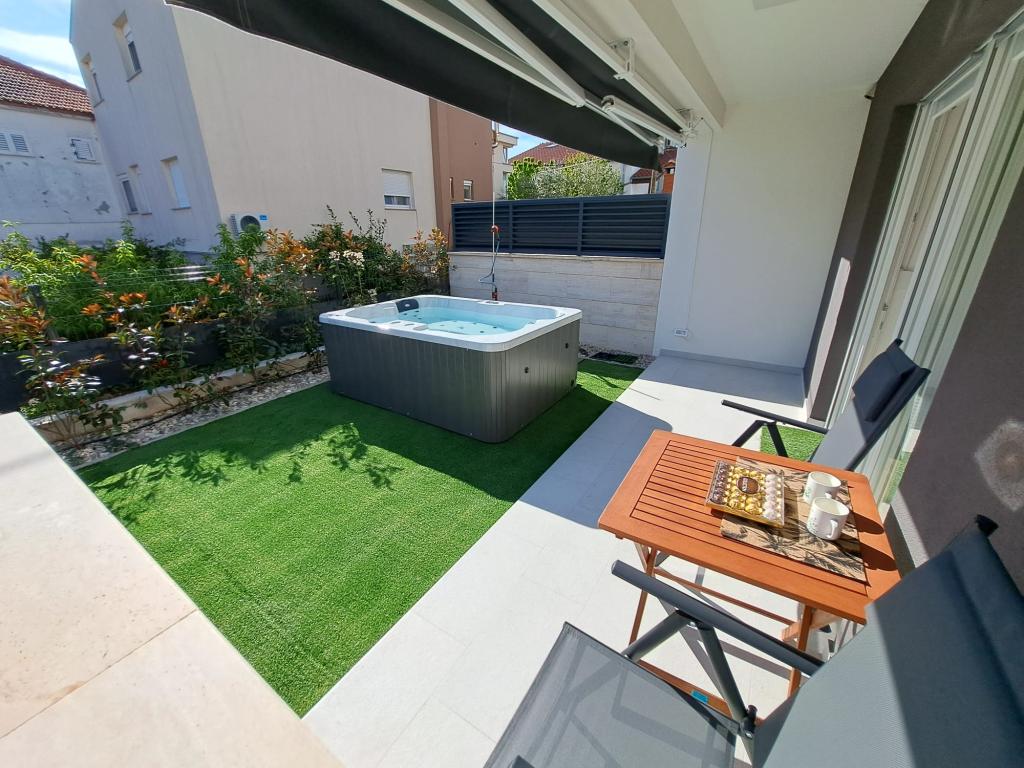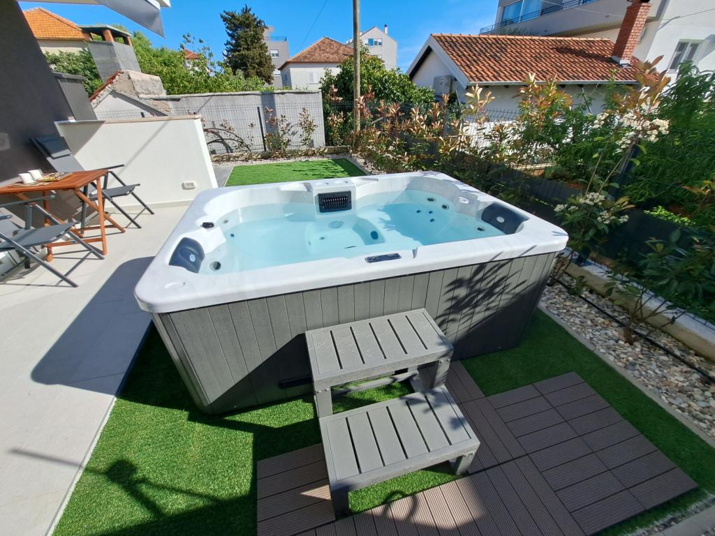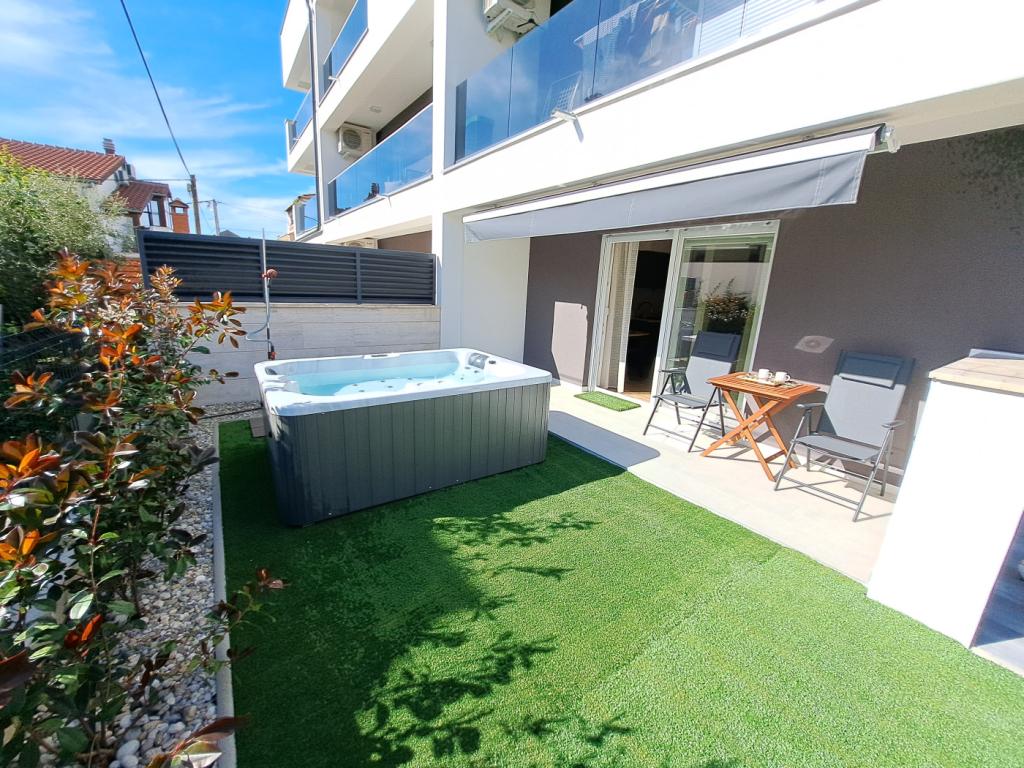 Apartman se nalazi u prizemlju zgrade u mirnoj zadarskoj četvrti Stanovi koju ne posjećuju gomile turista. U neposrednoj blizini (pješačka udaljenost) nalaze se trgovine, restorani, kafići i sportsko-rekreativni centar Višnjik - sve što vam treba i za boravak, bez potrebe za korištenjem automobila. Stan ima zaseban ulaz iz vlastitog vrta (cca. 55m2), gdje gostima je na raspolaganju privatni jacuzzi. Vrt je okružen zelenilom. Apartman se sastoji od dnevnog boravka s kuhinjom i blagovaonicom, 2 spavaće sobe (svaka s jednim bračnim krevetom koji se može razdvojiti u dva pojedinačna kreveta), kupaonice s tušem i natkrivene loggie (cca 7m2). Dio vrta s hidromasažnom kadom može se zasjeniti automatskim sjenilom. Ispred zgrade imamo 2 privatna parkirna mjesta. (bez dodatne naknade) Nudimo i vlastitu punionicu za električne automobile. (dodatna naknada)