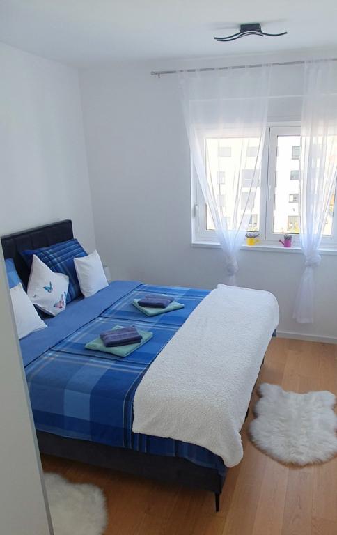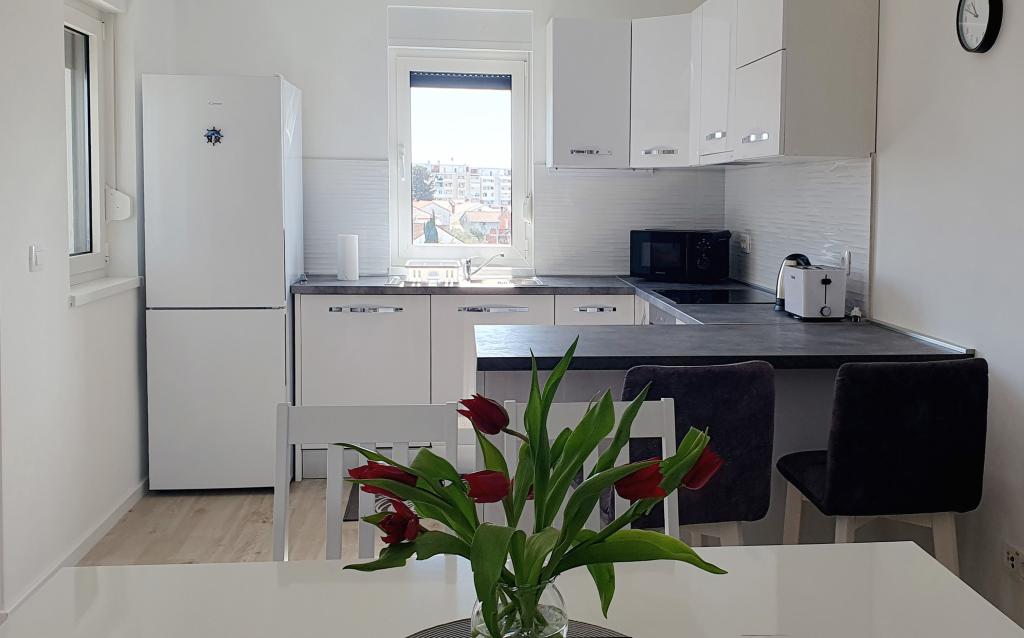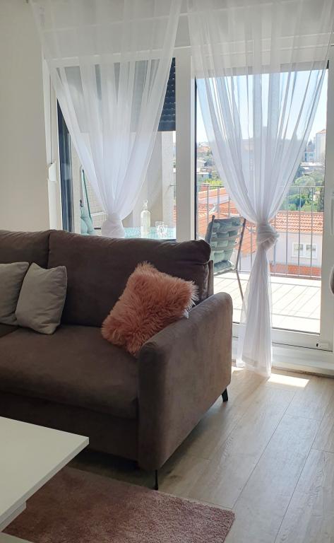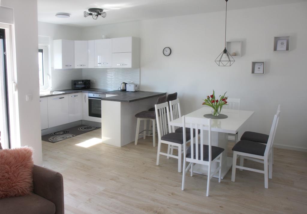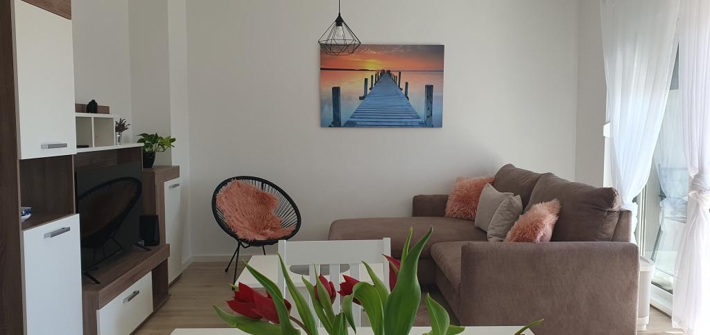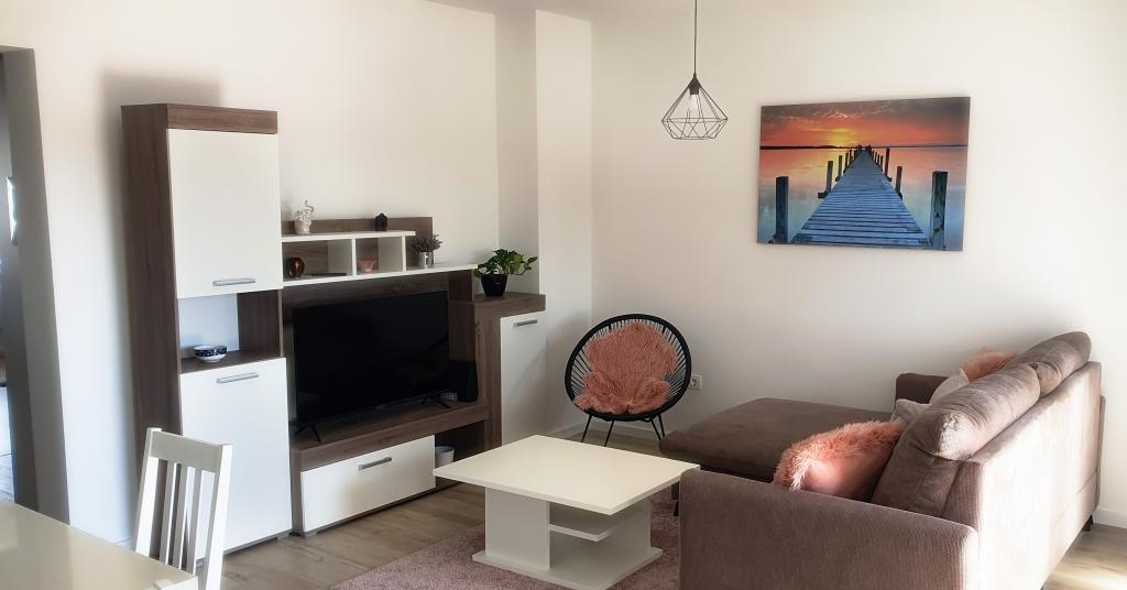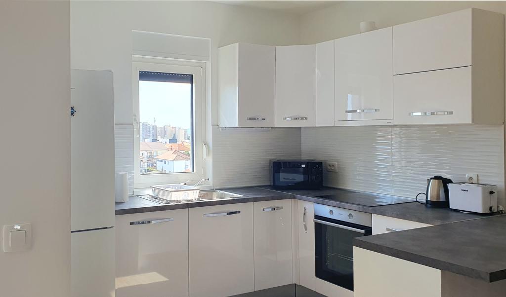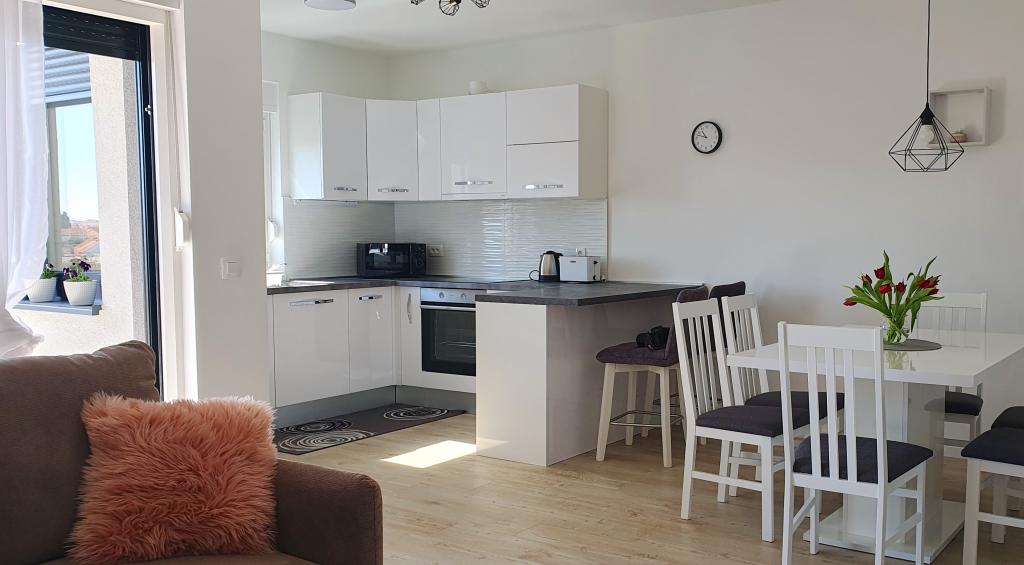Ovaj moderan apartman pruža svijetli dnevni boravak, modernu kuhinju i modernu kupaonicu s podnim grijanjem. U njemu su dvije udobne spavaće sobe iz kojih se vidi zalaz sunca s klima uređajem. Balkon s pogledom na grad i more nudi savršeno mjesto za opuštanje, a sigurno igralište za djecu čini ga idealnim za obitelji i bezbrižan boravak. Savršena Lokacija: Pekara na minutu hoda za svježe pecivo i kruh. Dućan na 3 minute hoda za sve potrebne namirnice. Blizina autobusne stanice samo 2 minute hoda za jednostavan pristup gradskom prijevozu. Ljekarna na 3 minute hoda. Svega 20 minuta hoda do centra grada i samo 800 metara do mora i najbližeg restorana.