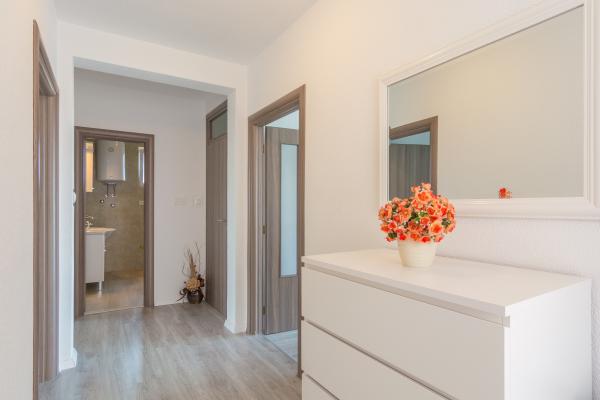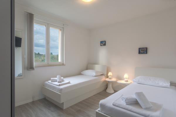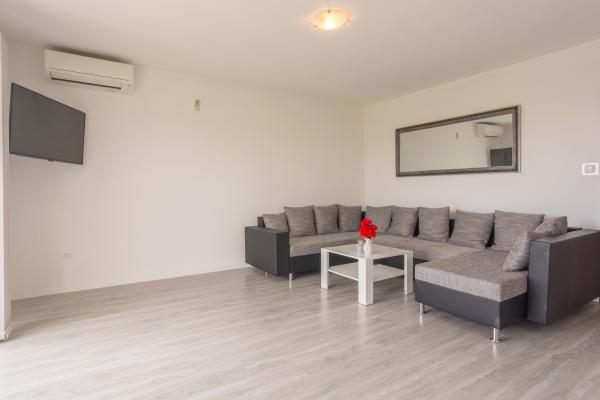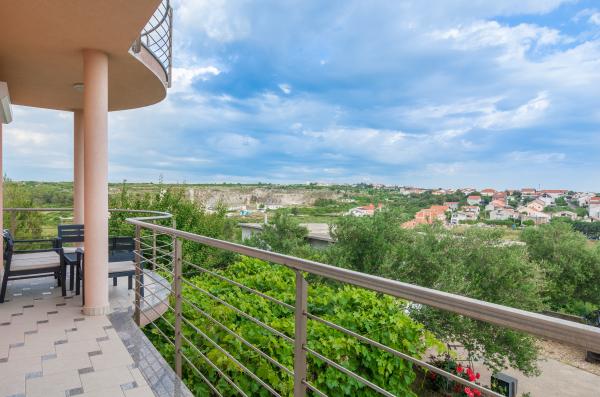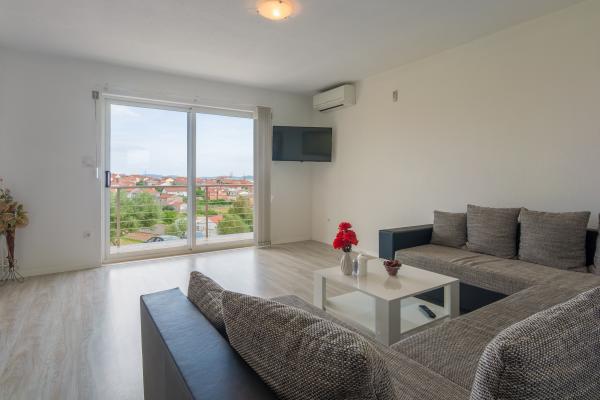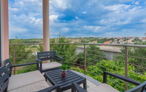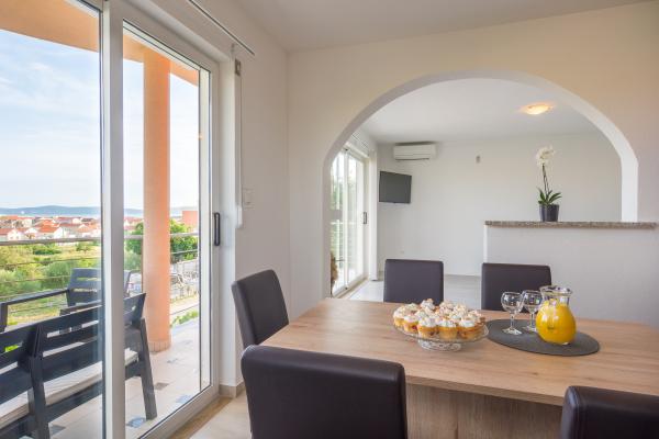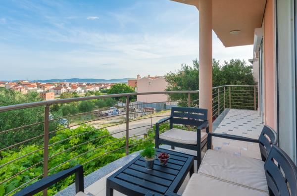 Apartman je smješten u Zadru u privatnoj obiteljskoj kući te ima 90m2 i veliku terasu s pogledom na more i otoke. Sadrži besplatan parking i besplatan roštilj te poseban ulaz. Apartman je opremljen sa klimom, besplatnim WiFi-em, ima dvije spavaće sobe, 3 TV-a, opremljenu kuhinju, WC i veliki dnevni boravak. Jedna spavaća soba ima bračni krevet, a druga ima dva kreveta za jednu osobu. Apartman se nalazi u slijepoj, mirnoj ulici, pogodna za odmor i djecu. Plaža je udaljena 5 minuta autom. Stari grad je udaljen također 5 minuta autom. Veliki shopping centar je udaljen 10 minuta hoda od apartmana, ili 1 minutu autom.