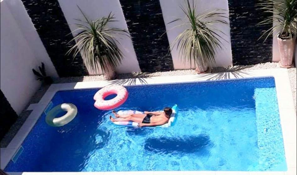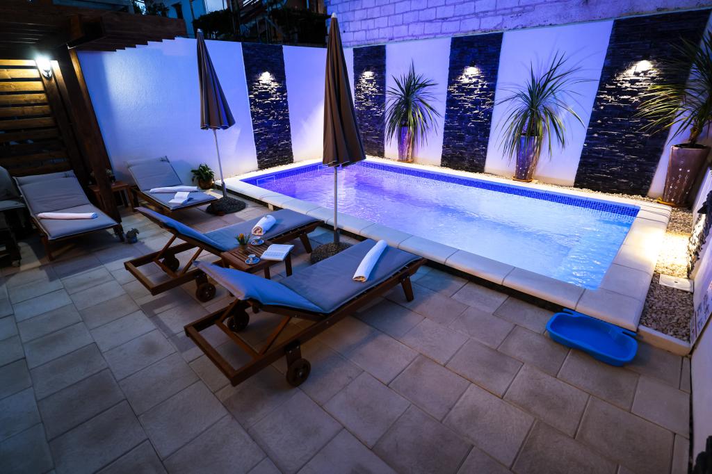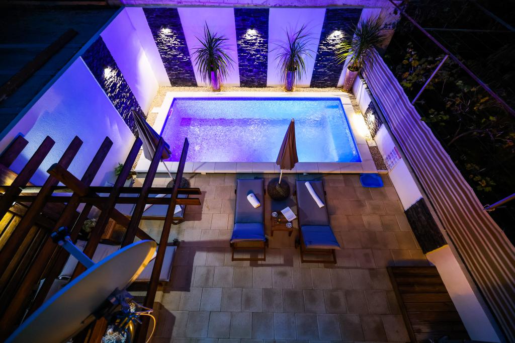 Dvojna zgrada (žuta boja kuće) nudi smještaj u apartman s privatnim bazenom! - Poseban ulaz. -1 parkirna mjesto se nalazi ispred privatne kuće. - vanjski prostor za sjedenje -Roštilj -1 privatni bazen -4 ležaljke - suncobrani uz bazen -Pergola -besplatni 5G WiFi - terasa -2 kupaonice sa wc-om, tušem, sušilom za kosu, -2 spavaćih soba: Svaka spavaća soba ima krevet, posteljinu, ormar i radni stol sa sjedalom - Dnevni boravak ima TV i sofu koja se može izvući kao pomoćni ležaj za dvije osobe - kuhinja s blagovaonicom: potpuno opremljena kuhinja s mikrovalnom pećnicom, štednjakom, hladnjakom sa zamrzivačem, posuđem, perilicom suđa, aparatom za kavu, klima uređajem i stolom za blagovanje https://youtu.be/F6JiFBiGaLM