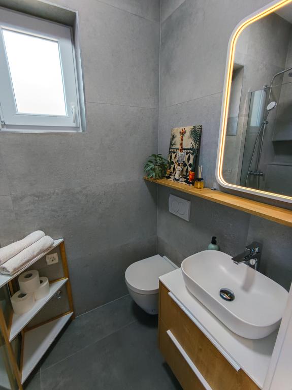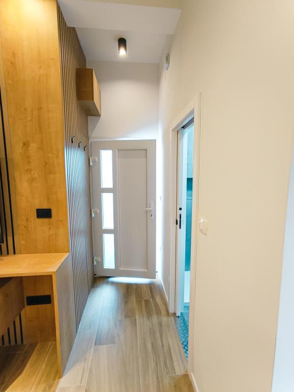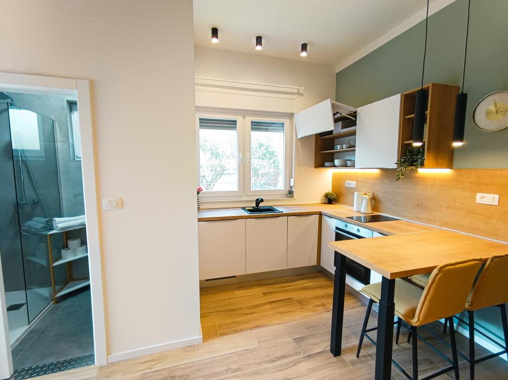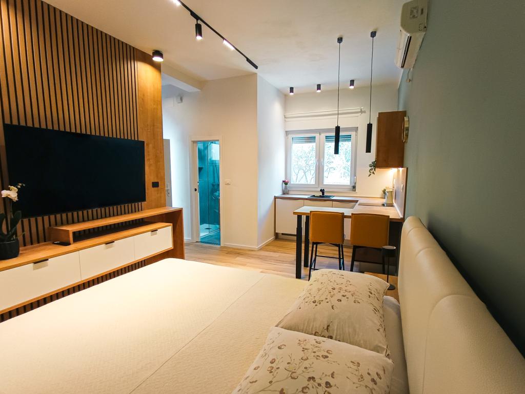 Kompletno i suvremeno opremljen Studio apartman u mirnom i obiteljskom okruženju. Pogodan za parove ili obitelj s jednim djetetom. Studio apartman je klimatiziran i posjeduje sve uređaje i sadržaje potrebne za bezbrižan odmor u Zadru. Bračni krevet BOX tipa, dimenzija 160x200 s udobnim madracem. Od elektroničkih uređaja posebno izdvajamo veliki TV, perilicu posuđa (vešeraj), perilicu rublja, te ugradbeni hladnjak s ledenicom. Studio sadrži sav potreban pribor za kuhanje, te osnovne začine. Po dogovoru, možemo vam dodati dječji krevetić, dječju hranilicu ili pomoćni ležaj. Studio apartman posjeduje privatni parking, a za one koji vole šetati, centar grada je udaljen 20ak minuta hoda. U blizini se nalazi sportsko rekreacijski centar Višnjik, koji je idealan za sve koji vole vježbati na otvorenom, a isto tako posjeduje i veliko dječje igralište.