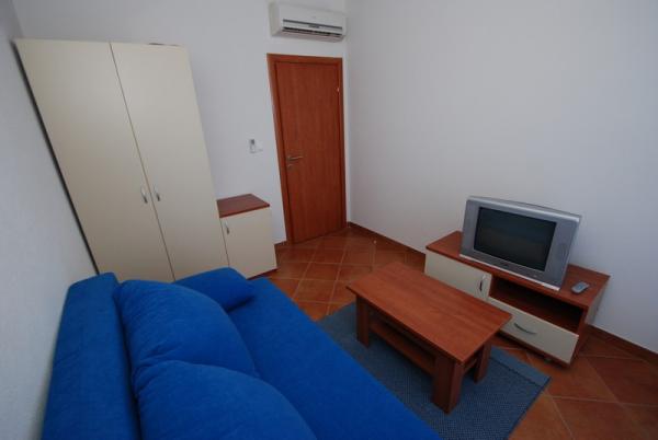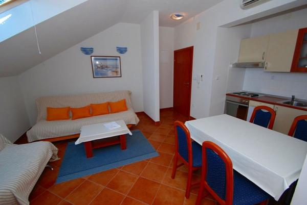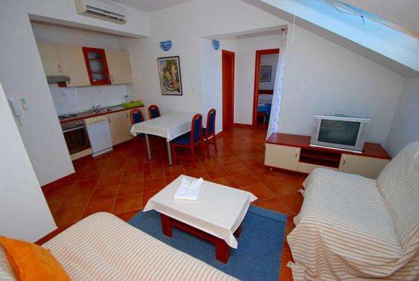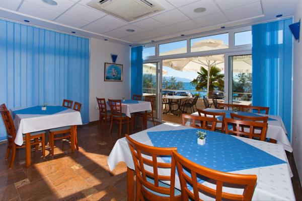 Turistička pristojba nije uključena u cijenu.Naš restoran Vam nudi bogat izbor poznatih kvalitetnih vina i hrane. Vrhunska ponuda i kvalitetna usluga našeg osoblja učinit će vaš boravak nezaboravnim. Restoran ima 44 sjedeća mjesta koliko ima i vanjska terasa koja ima direktni pogled na more. Posebno smo ponosni na gastronomsku ponudu naše kuhinje. Zahvaljujući umješnosti vrhunskog kuhara u restoranu se svakodnevno nude sve vrste mesnih i ribljih specijaliteta, a uz primamljive menije tu su i raznovrsna jela po narudžbi. U ponudi restorana su brojne vrste pizza, hladnih salata, rižoti, paste, kao i razne vrste deserta. Vaš boravak učinit će još ugodnijim činjenica da je restoran klimatiziran te da posjeduje veliku terasu koja pruža prekrasan pogled na more.