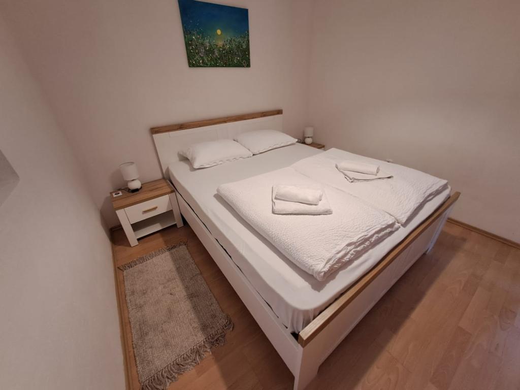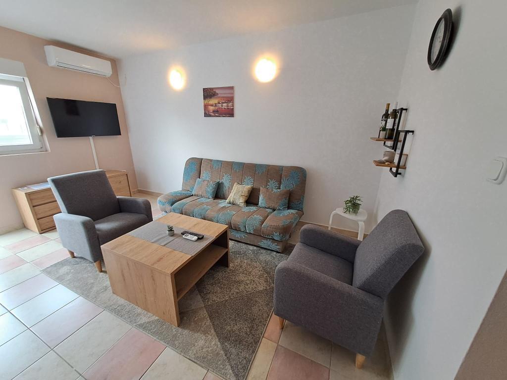 Nalazi se u mirnom mjestu Zaton (Zadar). Udaljenost od mora je oko 250 metara, isto toliko je udaljen do prve pješčane plaže. Apartman je površine 46m2 kompletno opremljen za ugodan obiteljski odmor. Sastoji se od dvije spavaće sobe, dnevnog boravka, kuhinje i kupaonice. Na raspolaganju je zasebna ostava. Apartman je u prizemlju sa dvije prostrane terase i osiguranim parkirnim mjestom za dva automobila. Na raspolaganju je Wi-fi internet, Max Tv, klima uređaj i roštilj.