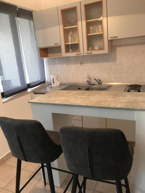 Studio apartman se nalazi na prvom katu kuće koja je smještena prvi red do mora. Ispred kuće je riva na kojoj se kupamo samo mi i naši gosti. Do samog centra mjesta ima otprilike 10 minuta lagane šetnje uz more. Apartman ima kuhinju, hodnik, kupatilo i balkon.