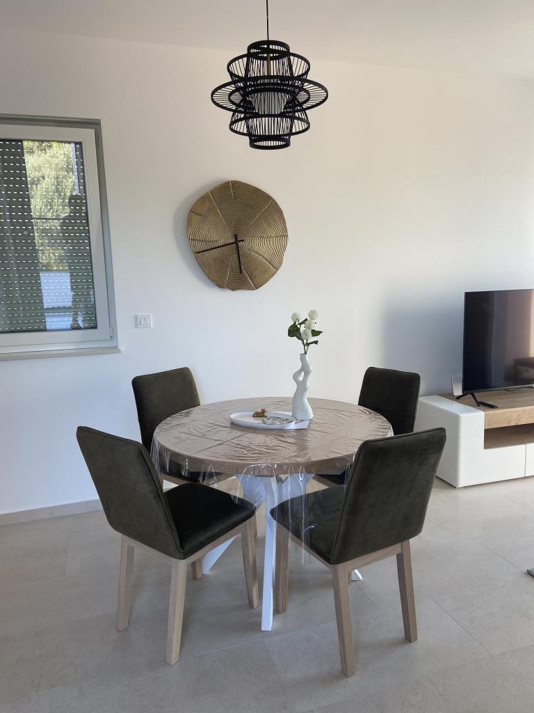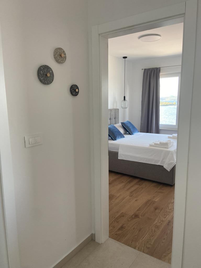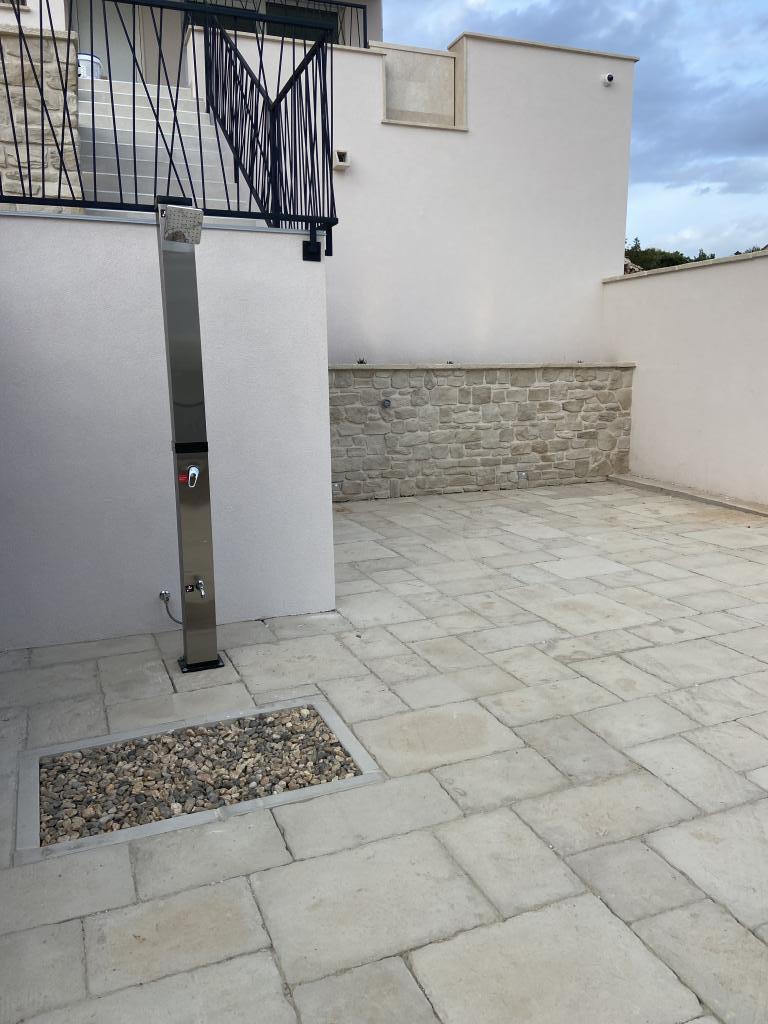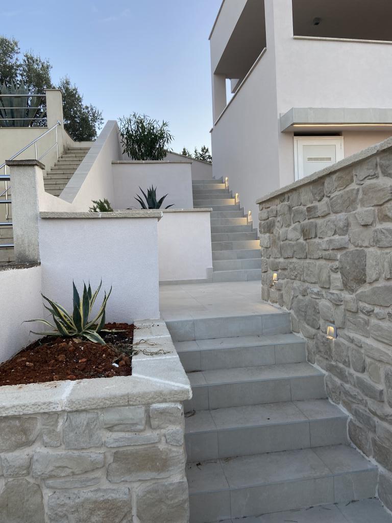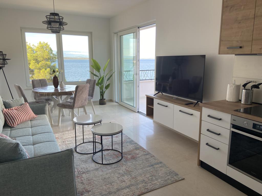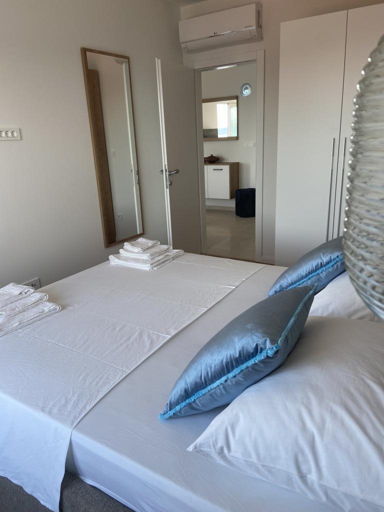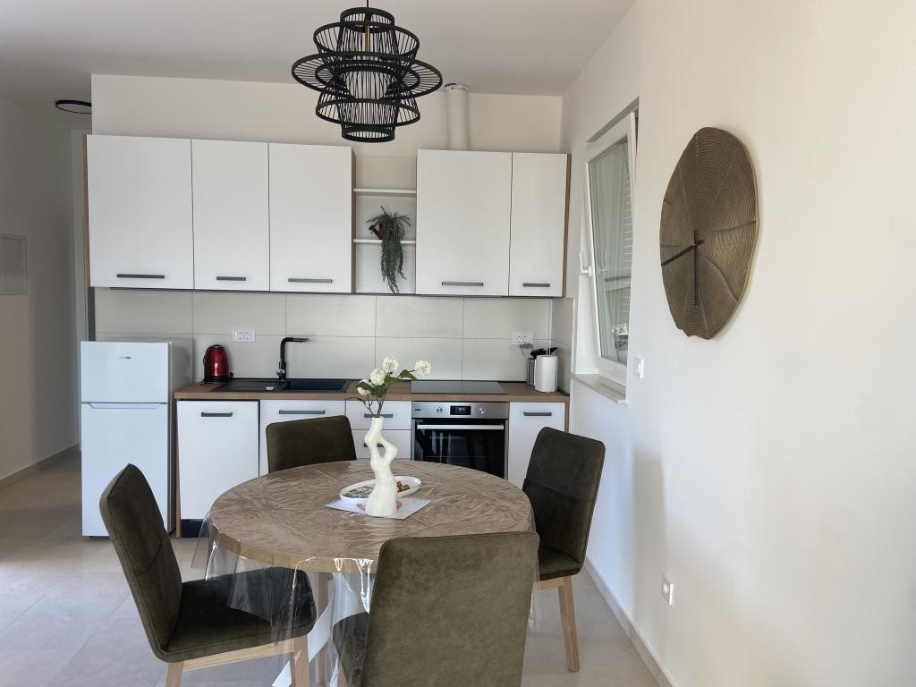 Apartman je moderno uređen. Ima vlastitu perilicu rublja i posuđa. Udaljenost od mora je 50 metara. Ima prekrasan pogled na more, otoke i Velebit. Besplatan privatni parkig do kojeg se dolazi dijelom po bijelom putu. Voda je iz gusterne i nije za piće. Osvjetljenje cijele okućnice.
