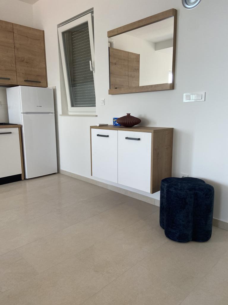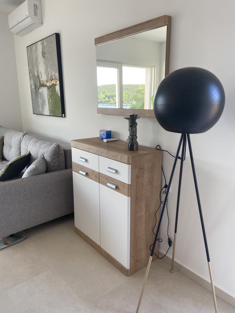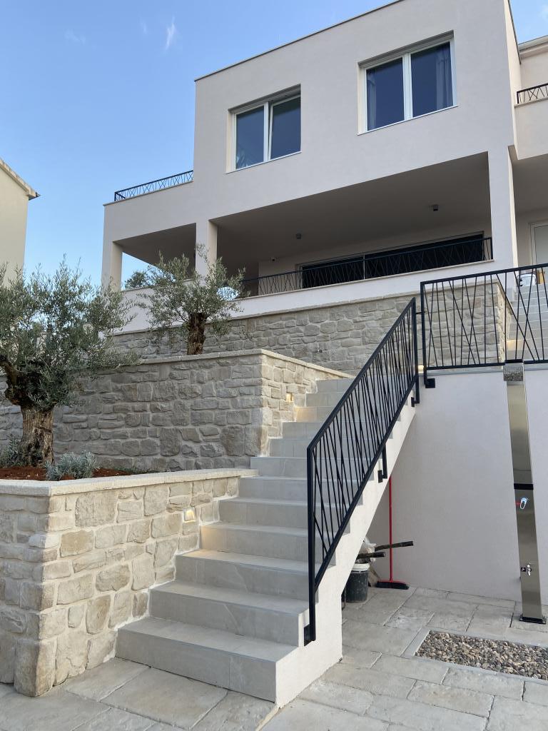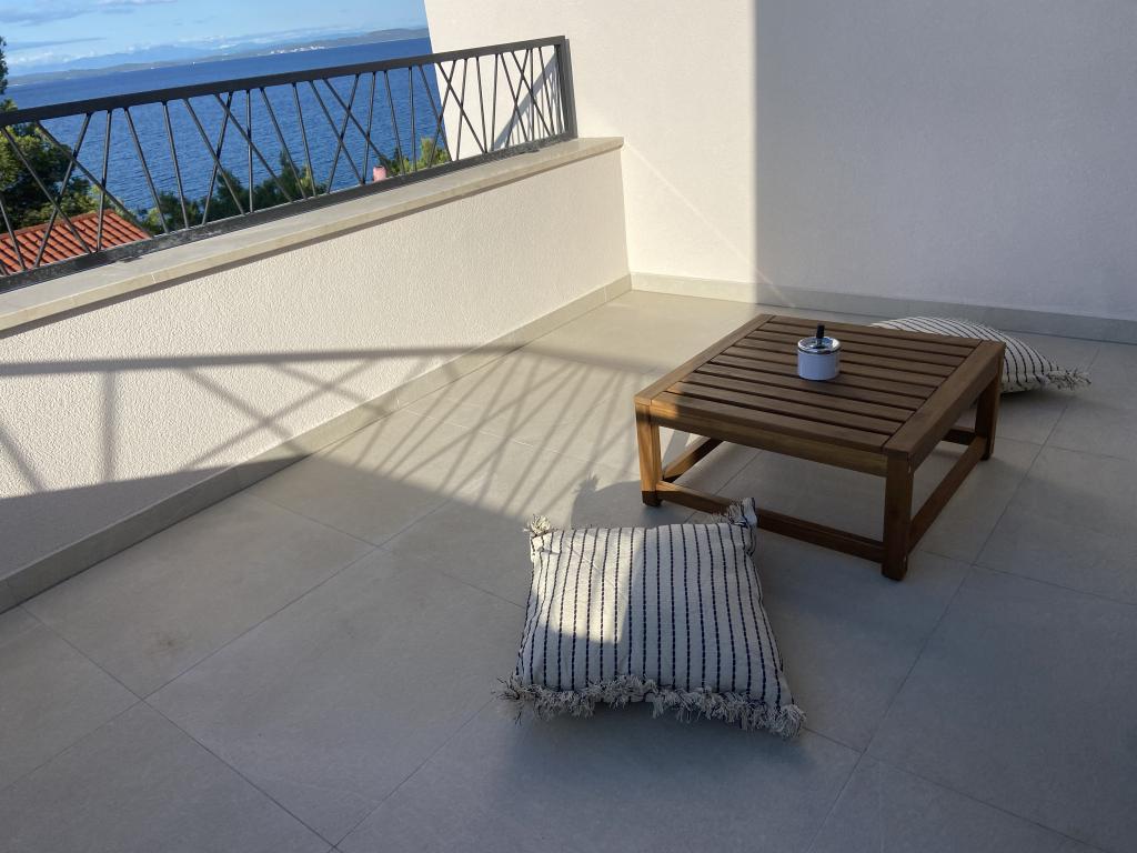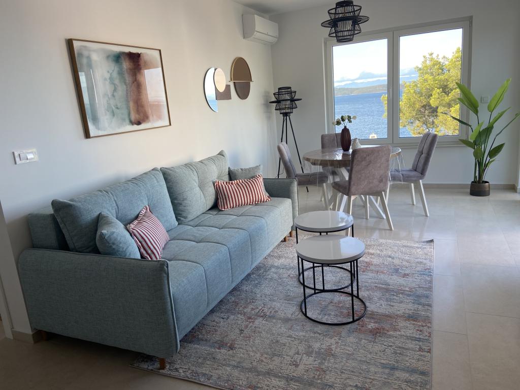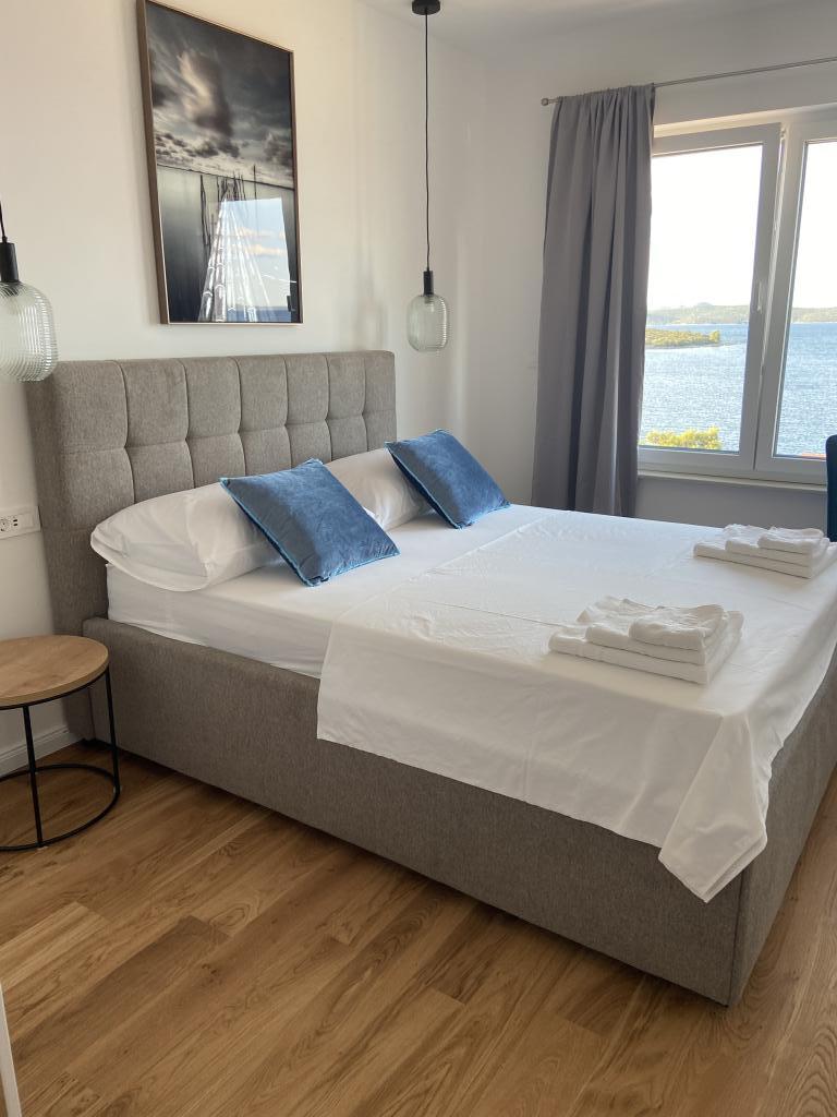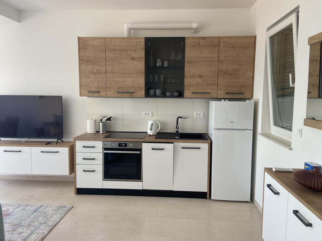 Apartman je moderno uređen. Ima vlastitu perilicu rublja i posuđa. Udaljenost od mora je 50 metara. Ima prekrasan pogled na more, otoke i Velebit. Besplatan privatni parkig do kojeg se dolazi dijelom po bijelom putu. Voda je iz gusterne i nije za piće. Osvjetljenje cijele okućnice.