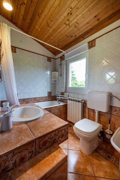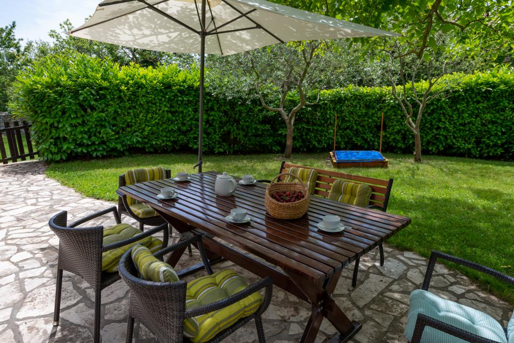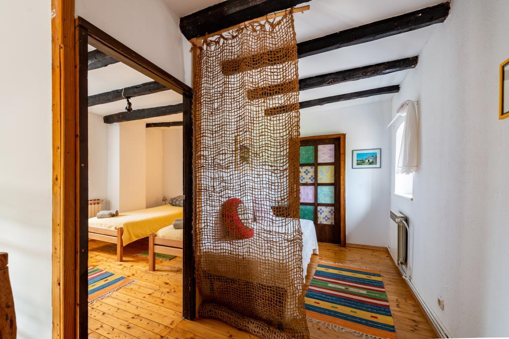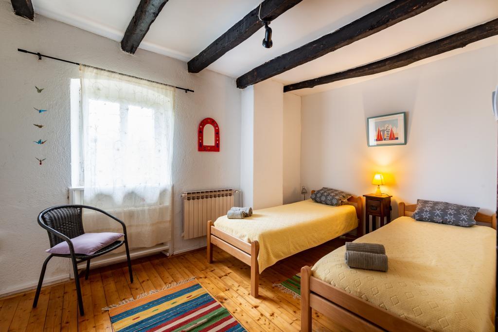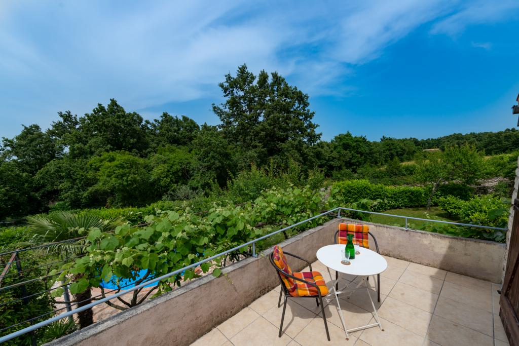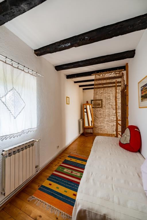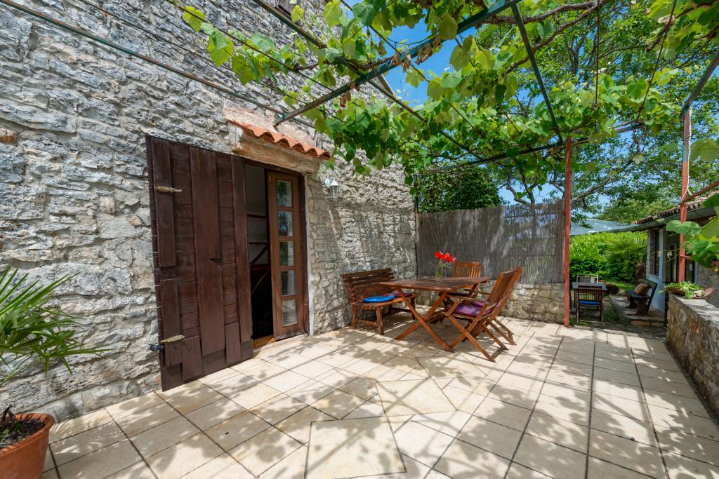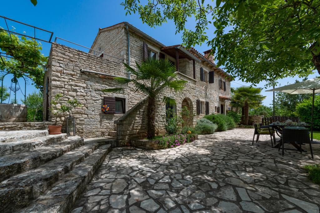 Stara, rustikalno uređena kamena kuća u istarskom stilu iz 1850. godine, renovirana, okružena livadama, poljima i šumom. Izolirano, mirno i sunčano mjesto u zelenom. Trgovina 3 km, restoran 3 km. Žminj, 4km, Bele (plaža) 18km, Rovinj (more, plaže, sportski sadržaji) 20km. Za samostalno korištenje, ograđena parcela od 1600m2 s livadama i drvećem. Vanjski tuš, vrtna garnitura za sjedenje. Okrugli bazen (promjer 5 m, dubina 120cm. Vanjski roštilj. Na raspolaganju internet WIfi, dječji krevetić, hranilica, perilica suđa. Parking uz kuću na parceli. Perilica rublja - uz doplatu 10Eur /dan Prizemlje/dnevni boravak/blagovaona s otvorenim kaminom, sat/TV, DVD i muzičkom linijom. Kuhinja (štednjak za kuhanje, pećnica, perilica za suđe). Tuš/WC. Unutarnje stepenice za 1. kat: 1. soba s dva kreveta za jednu osobu, druga soba s bračnim krevetom i treća soba s francuskim ležajem i izlazom na terasu i posebnim izlazom na vrt.