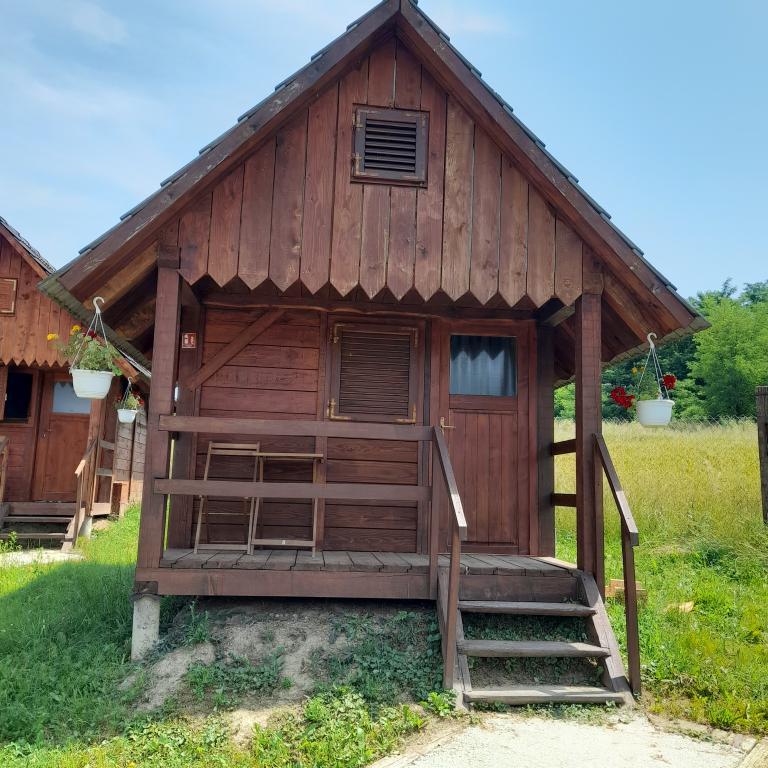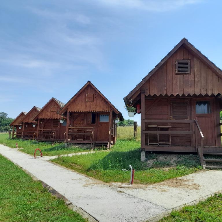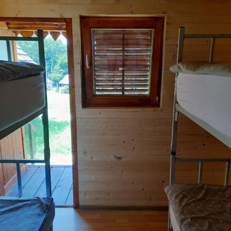 Kućice su izrađene od prirodnih materijala-drveta. Građene su tradicionalnom gradnjom u dimenzijama od 4 x 3m. U kućici mogu prespavati 5 odraslih osoba i dvoje djece do 15 godina ili 3 odrasle osobe. Svaka kućica ima terasicu s pogledom. Toalet i tuševi nalaze se u centralnom sanitarnom čvoru i udaljeni su samo 20 metara. Smještene su u prekrasnoj prirodi, u neposrednoj blizini adrenalin park.